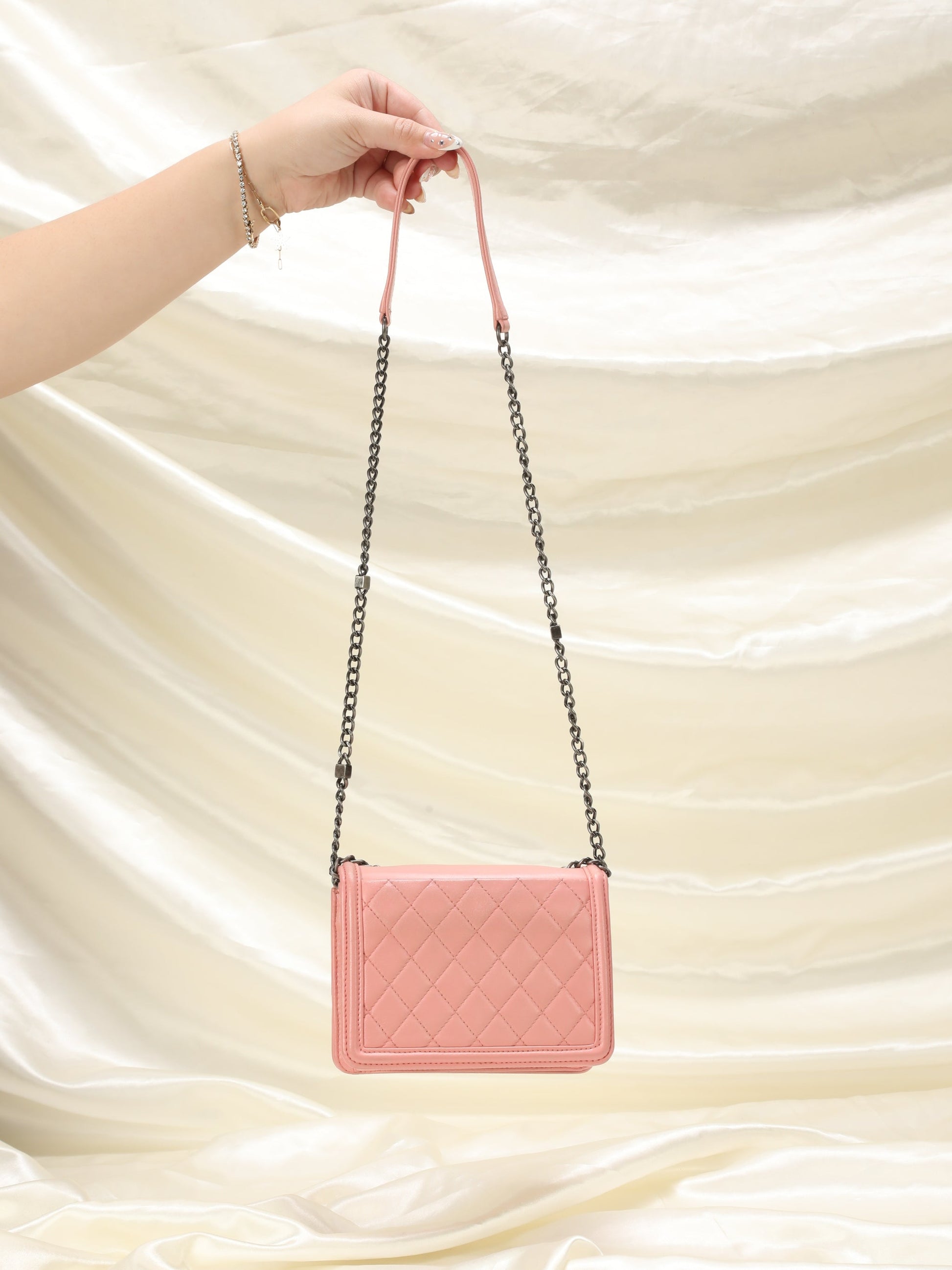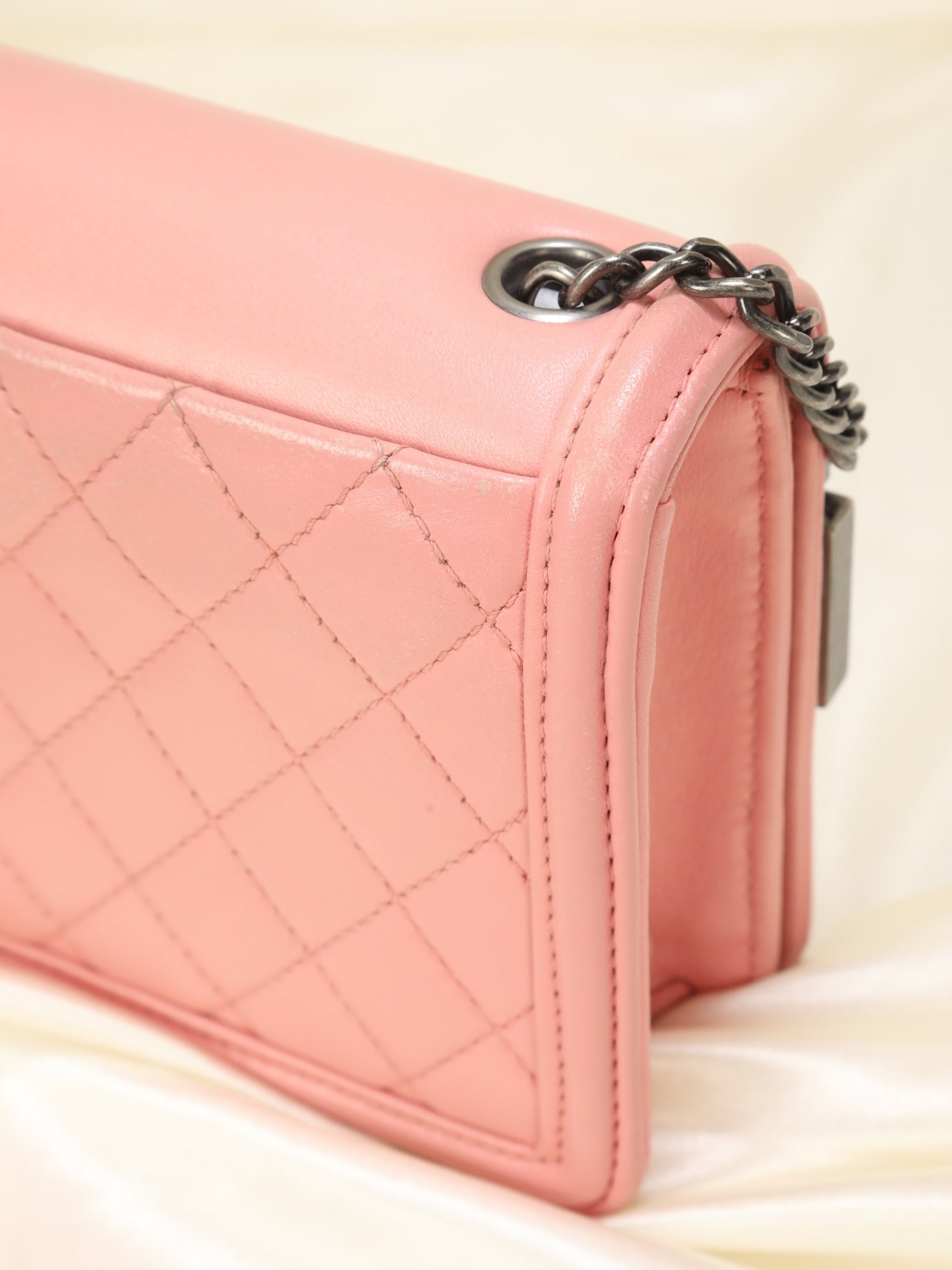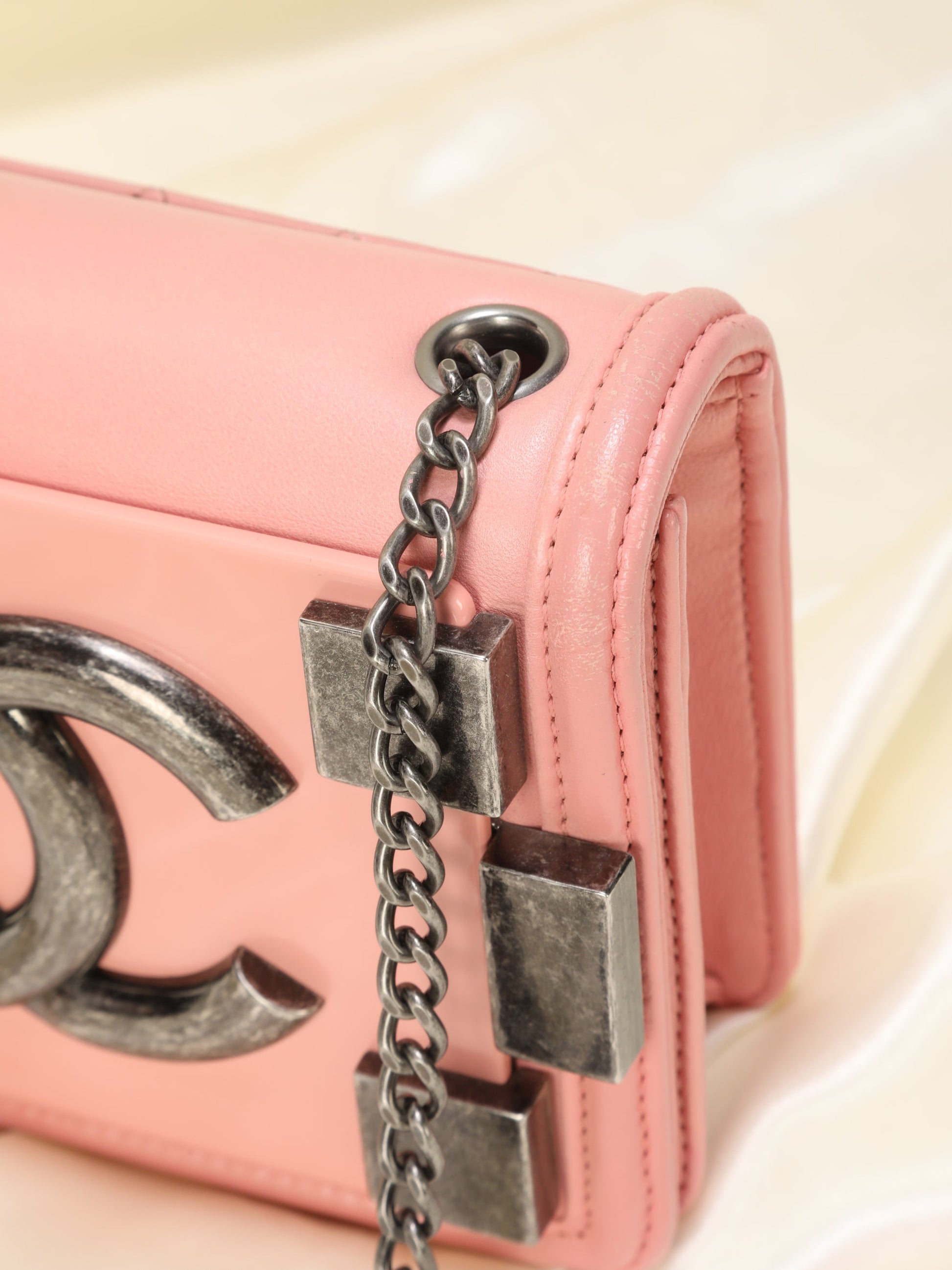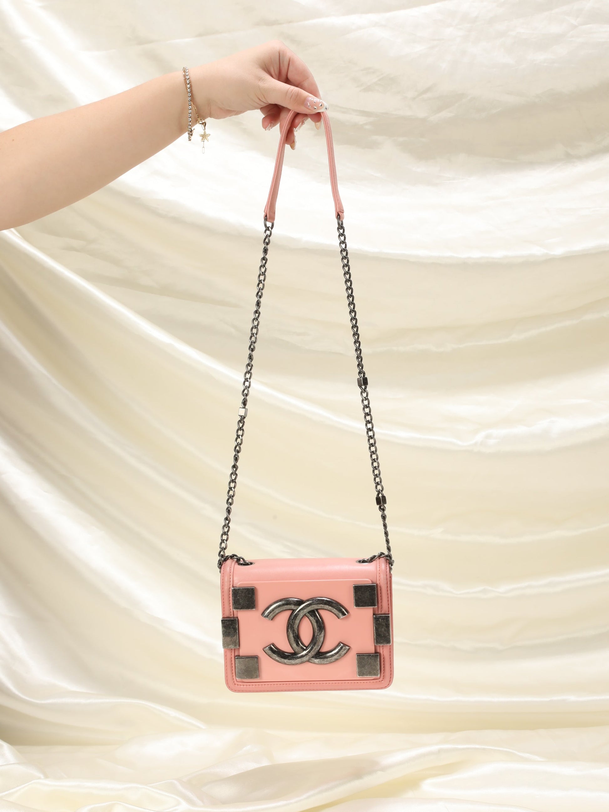 In an adorable bubblegum pink, this Chanel brick bag is truly a statement piece. This gorgeous pop of color combined with the??edgy look from the Ruthenium allows this to be an extremely versatile bag. Wear with a minimal outfit for an effortless elevation to your look! 3300+