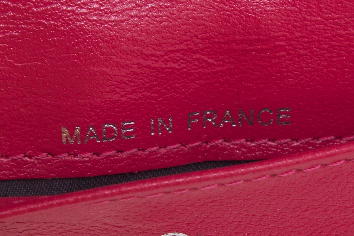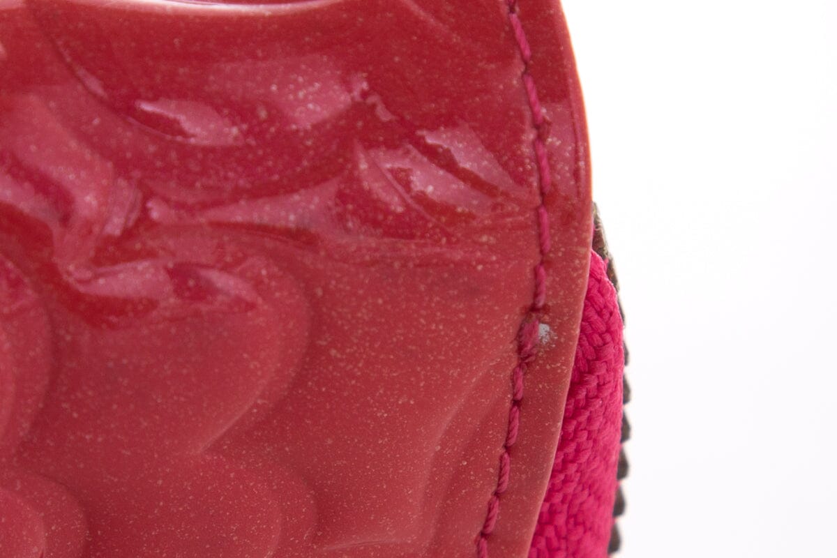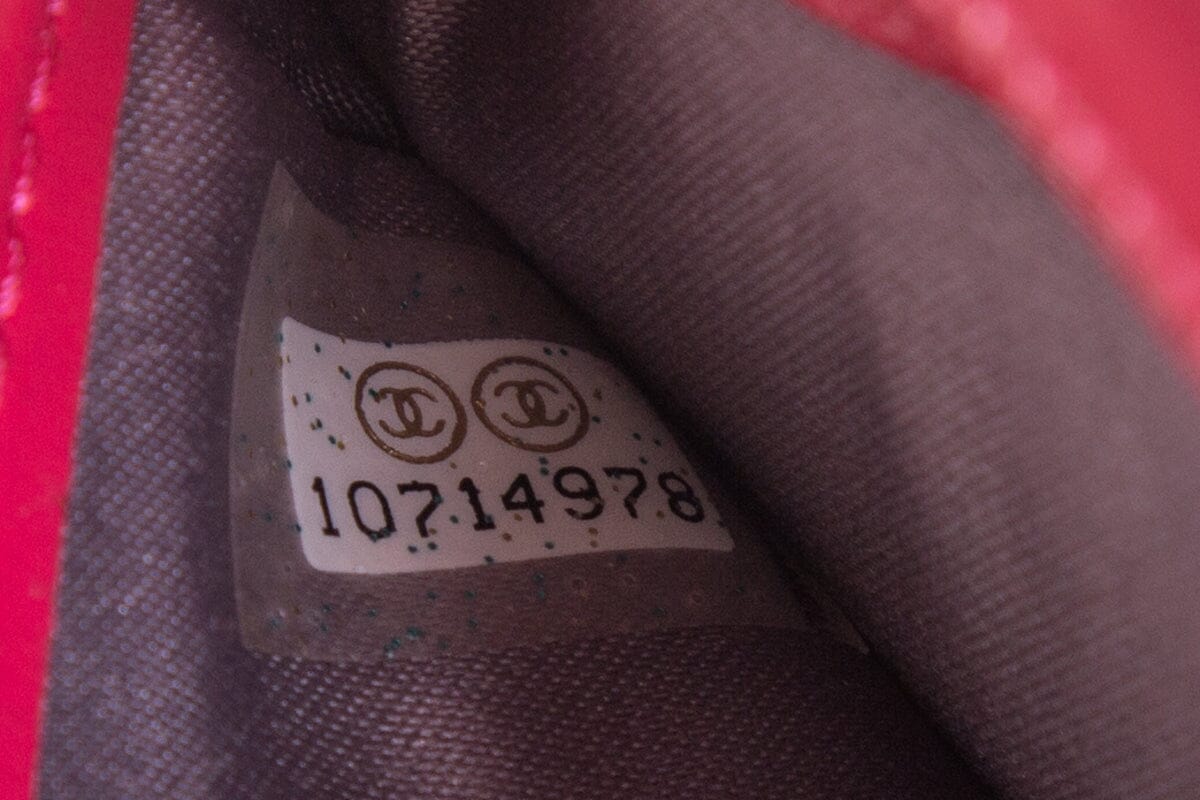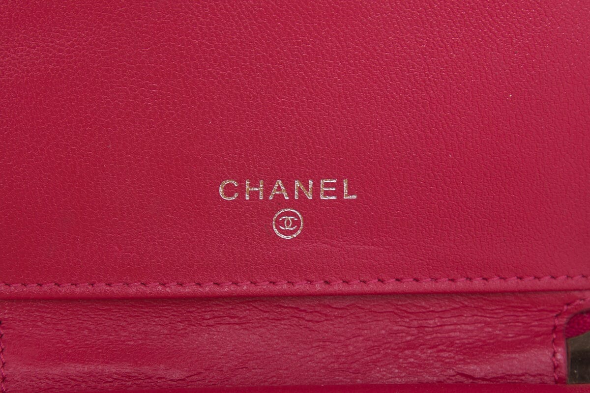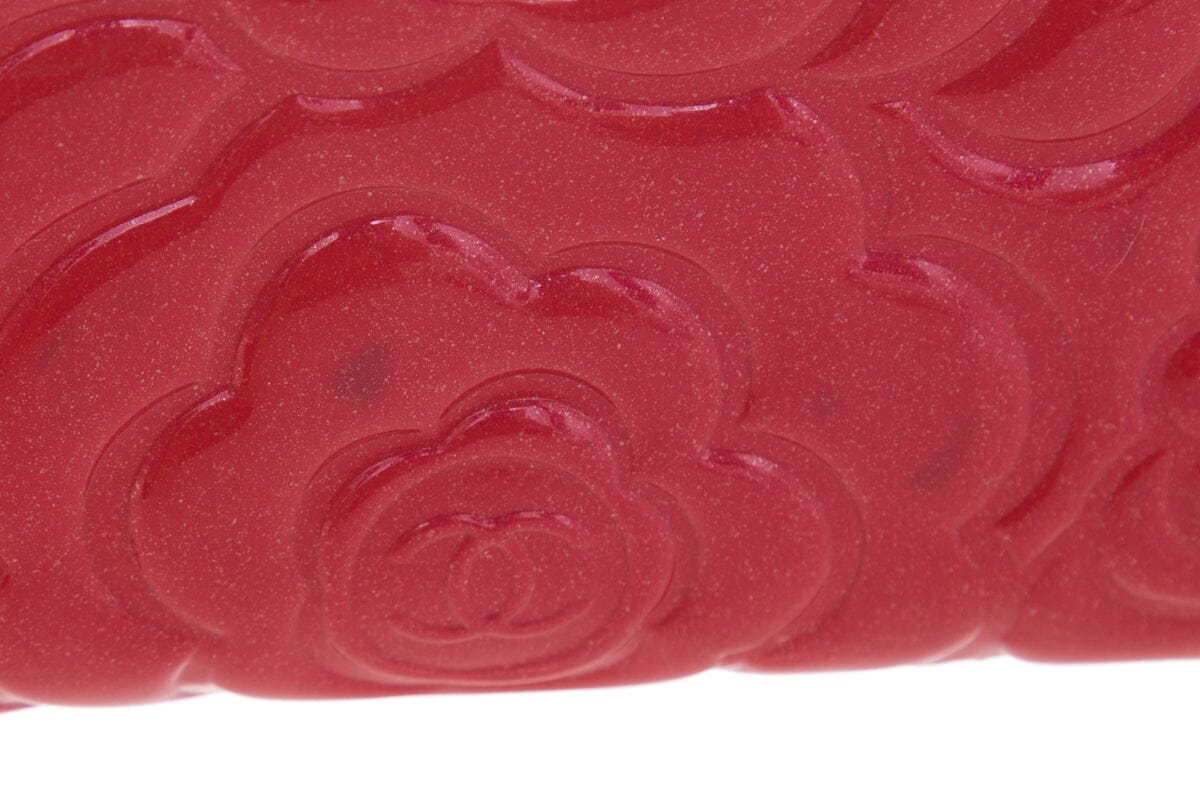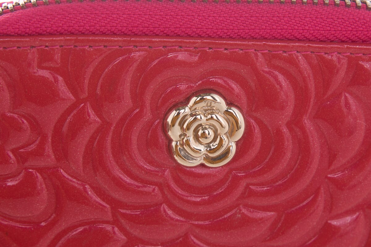 Chanel Pink Camellia Embossed Patent Leather Wallet. This item is in New condition; some color transfer on patent leather.