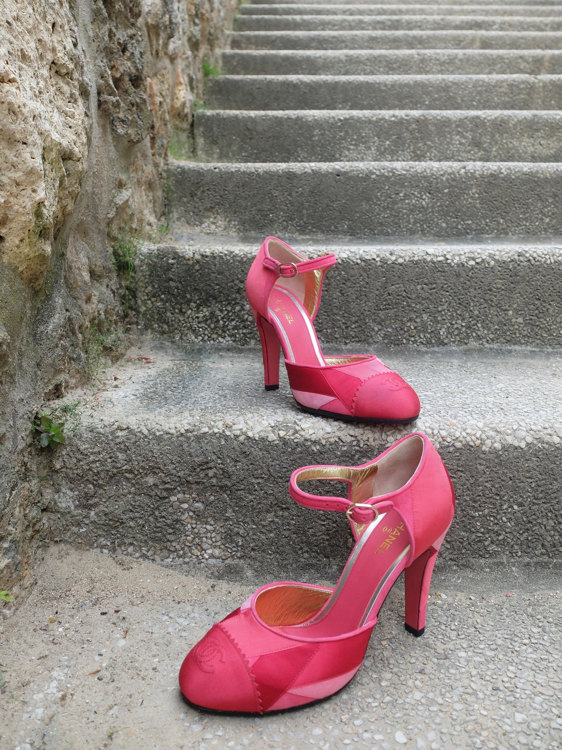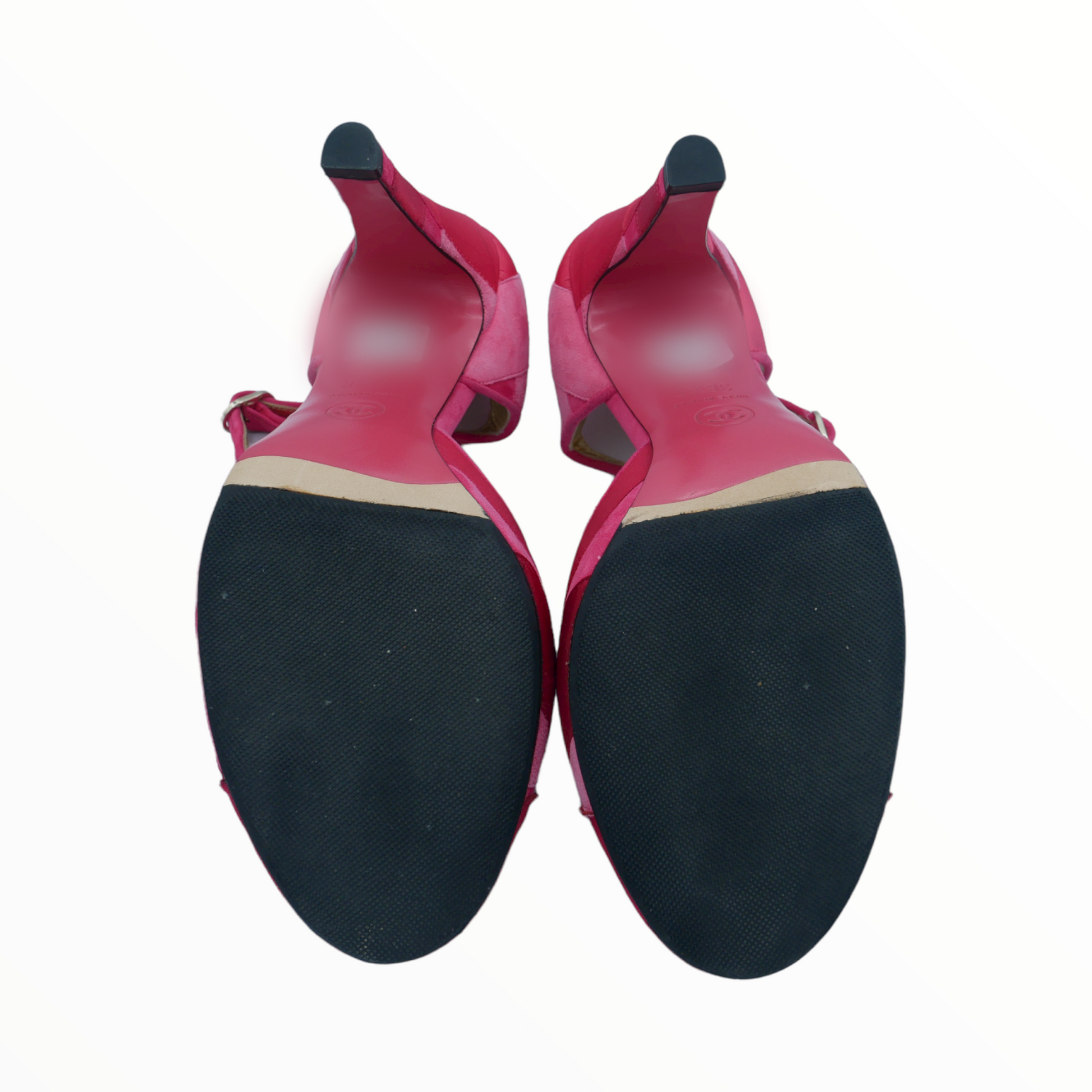 DESCRIPTION: Chanel 2017 pink patchwork ankle mary jane strap sandal heel pumps.