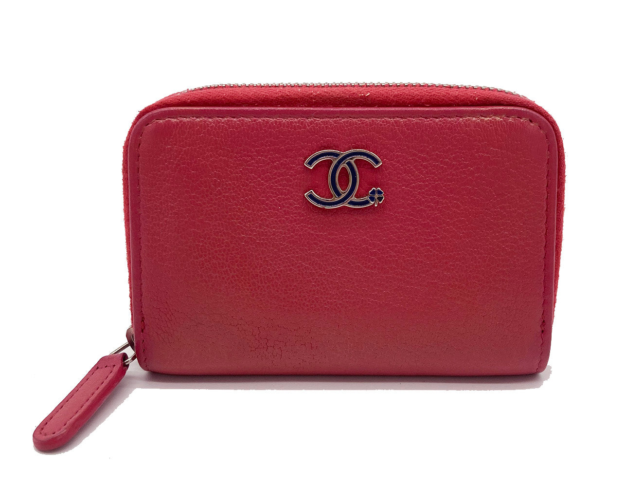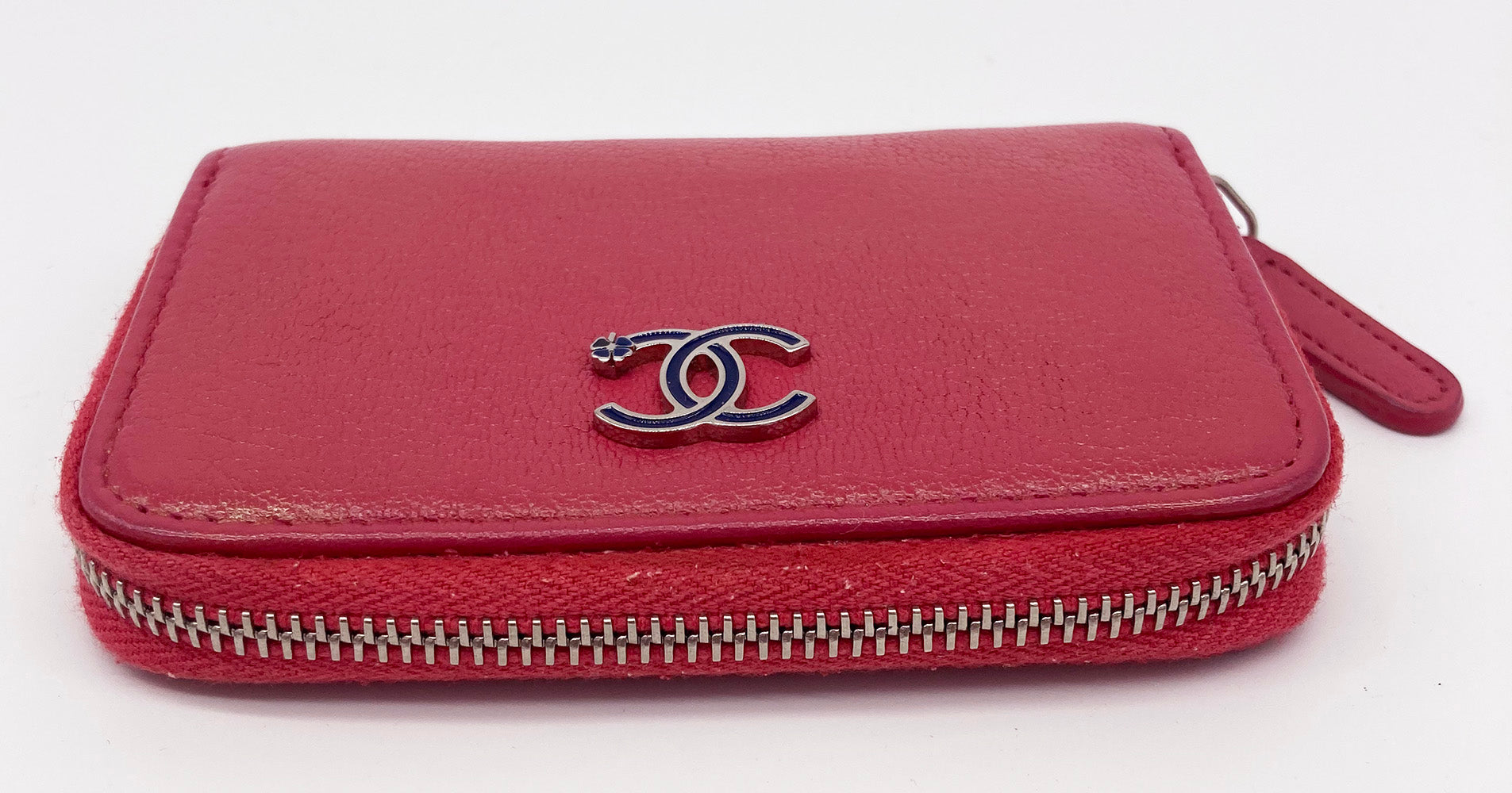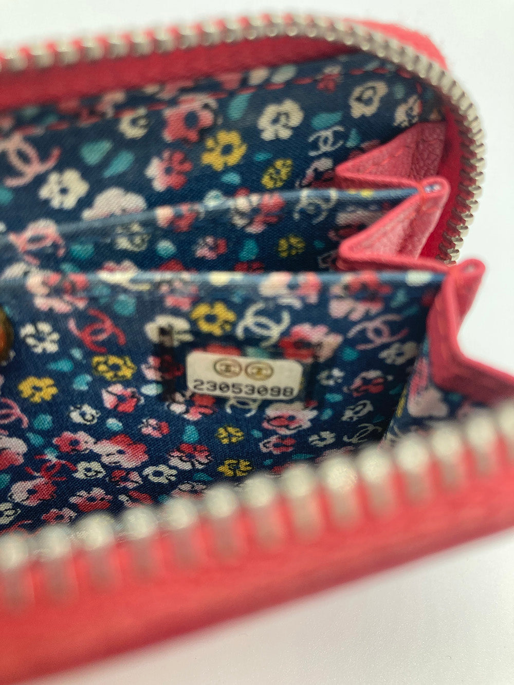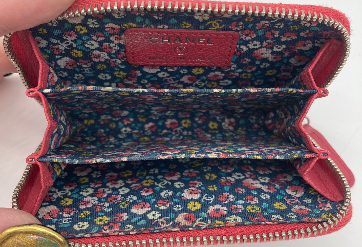Coral pink leather with zip around sides and small cc enamel logo along front side. 3 interior card compartments lined in floral fabric. no stains smells or scuffs. clean corners edges and interior. measurements: 4.25"x3"