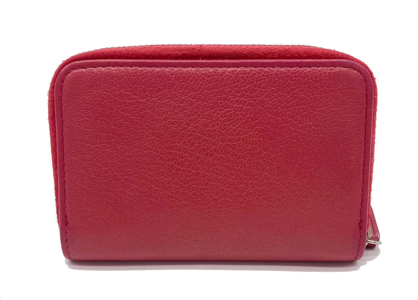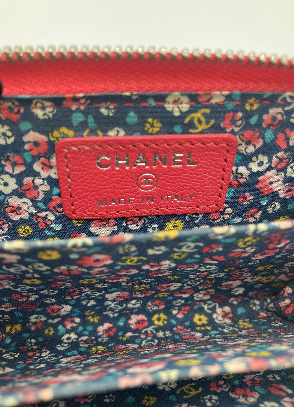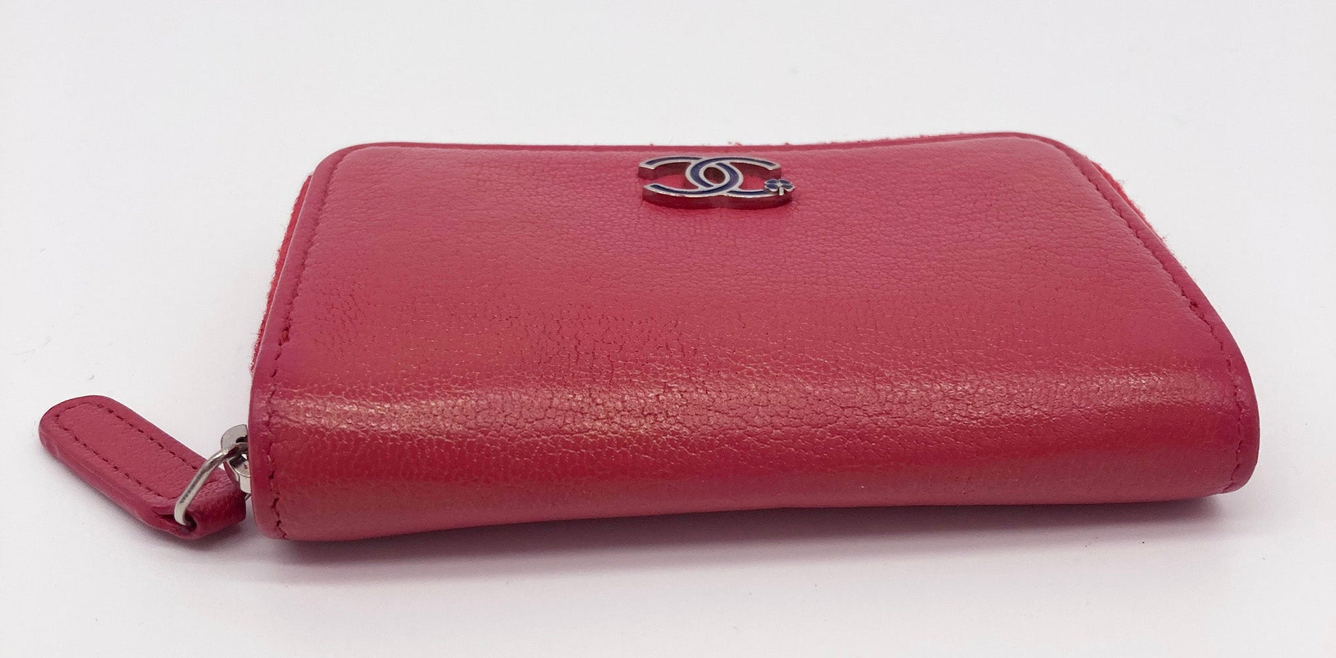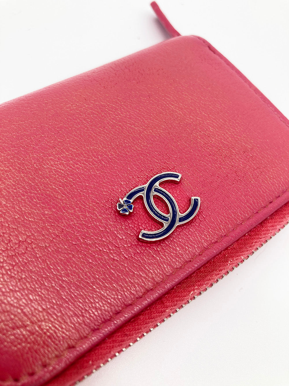 Coral pink leather with zip around sides and small cc enamel logo along front side. 3 interior card compartments lined in floral fabric. no stains smells or scuffs. clean corners edges and interior. measurements: 4.25"x3"