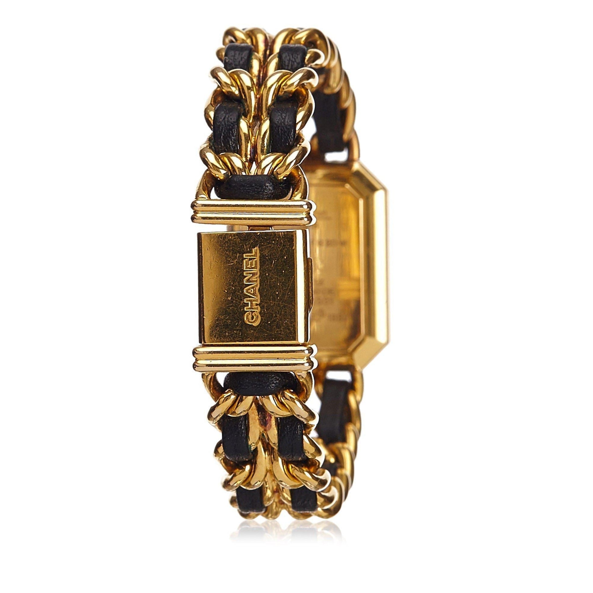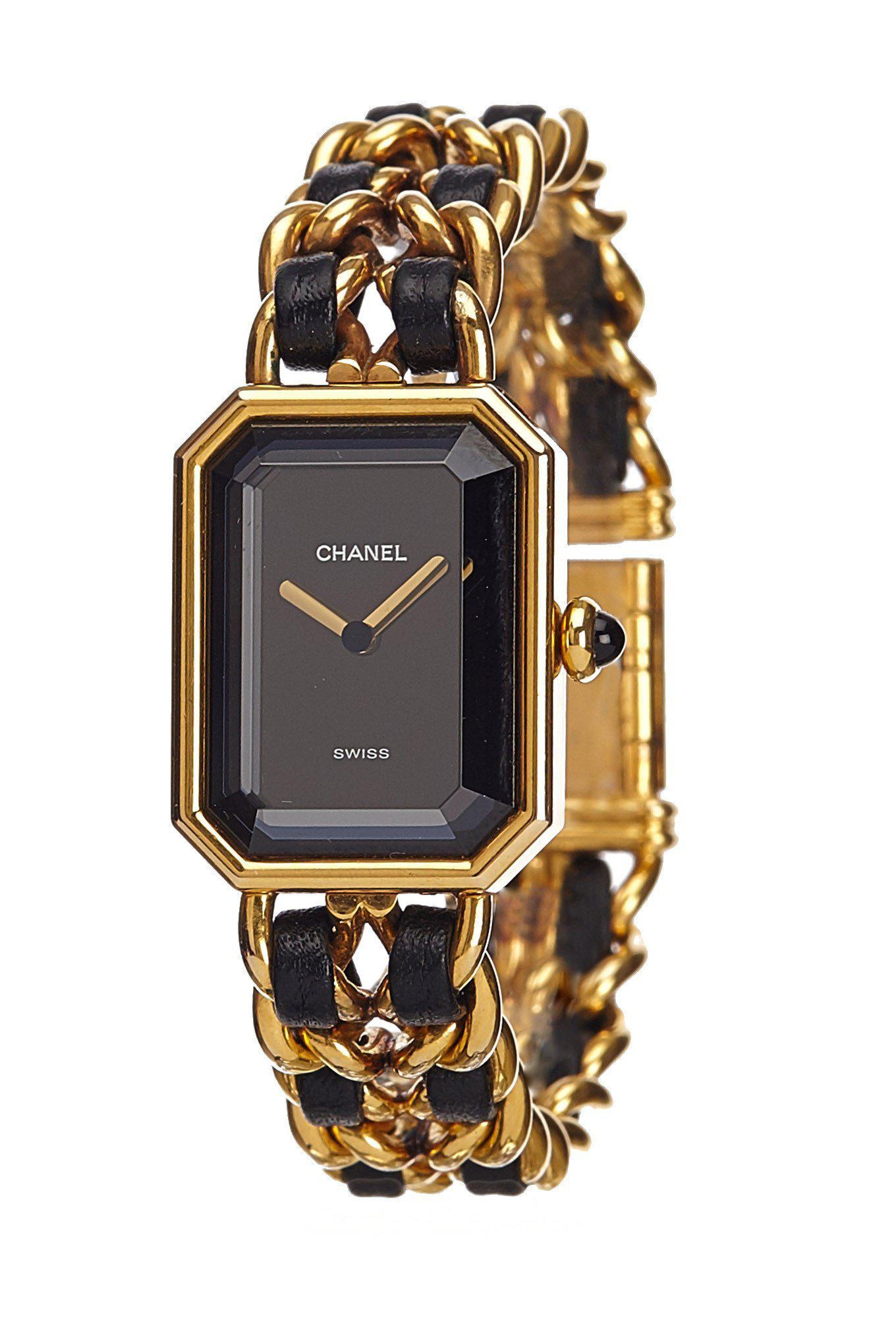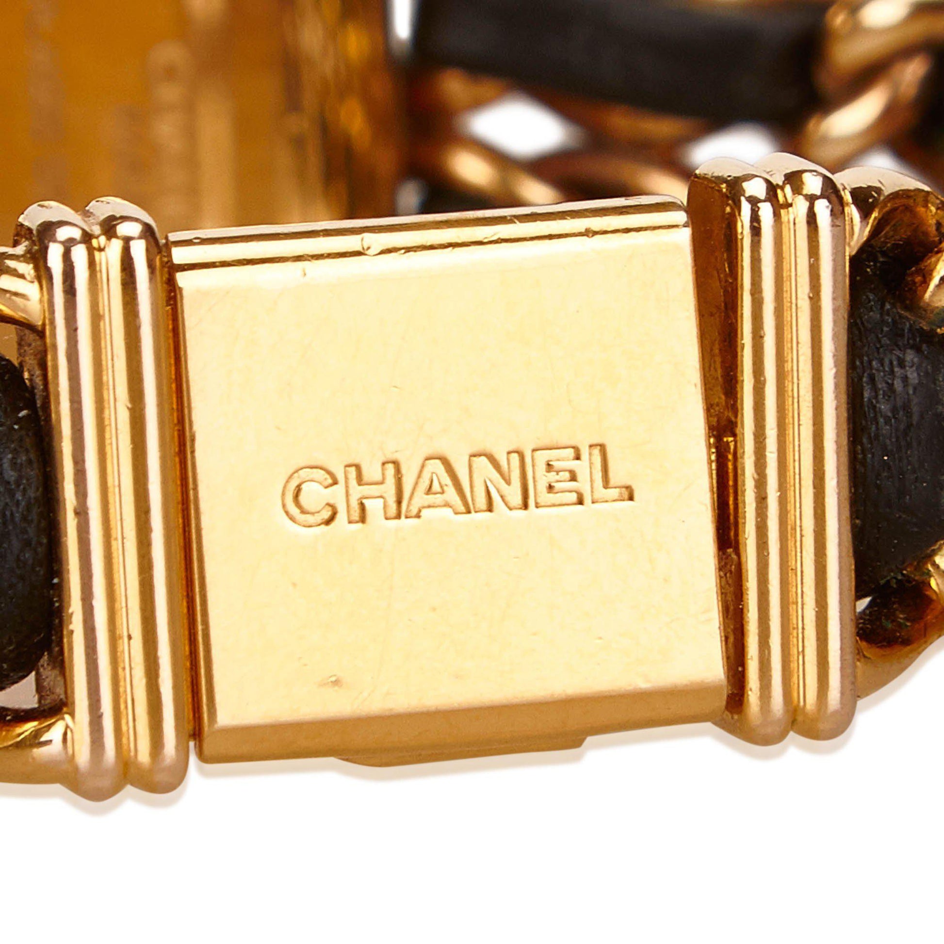 We the ity of this 27mm Chanel Premiere Rock Watch featuring 18K yellow gold-plated stainless steel, leather detail, quartz movement, asmooth bezelwithblack dial and hinged clasp closure.
