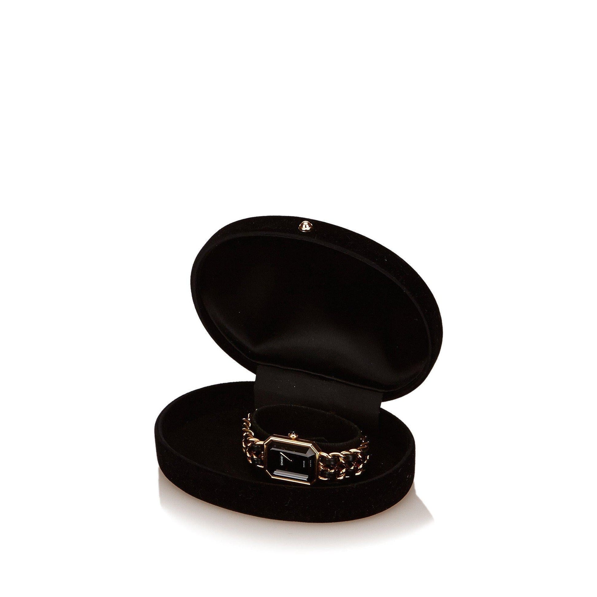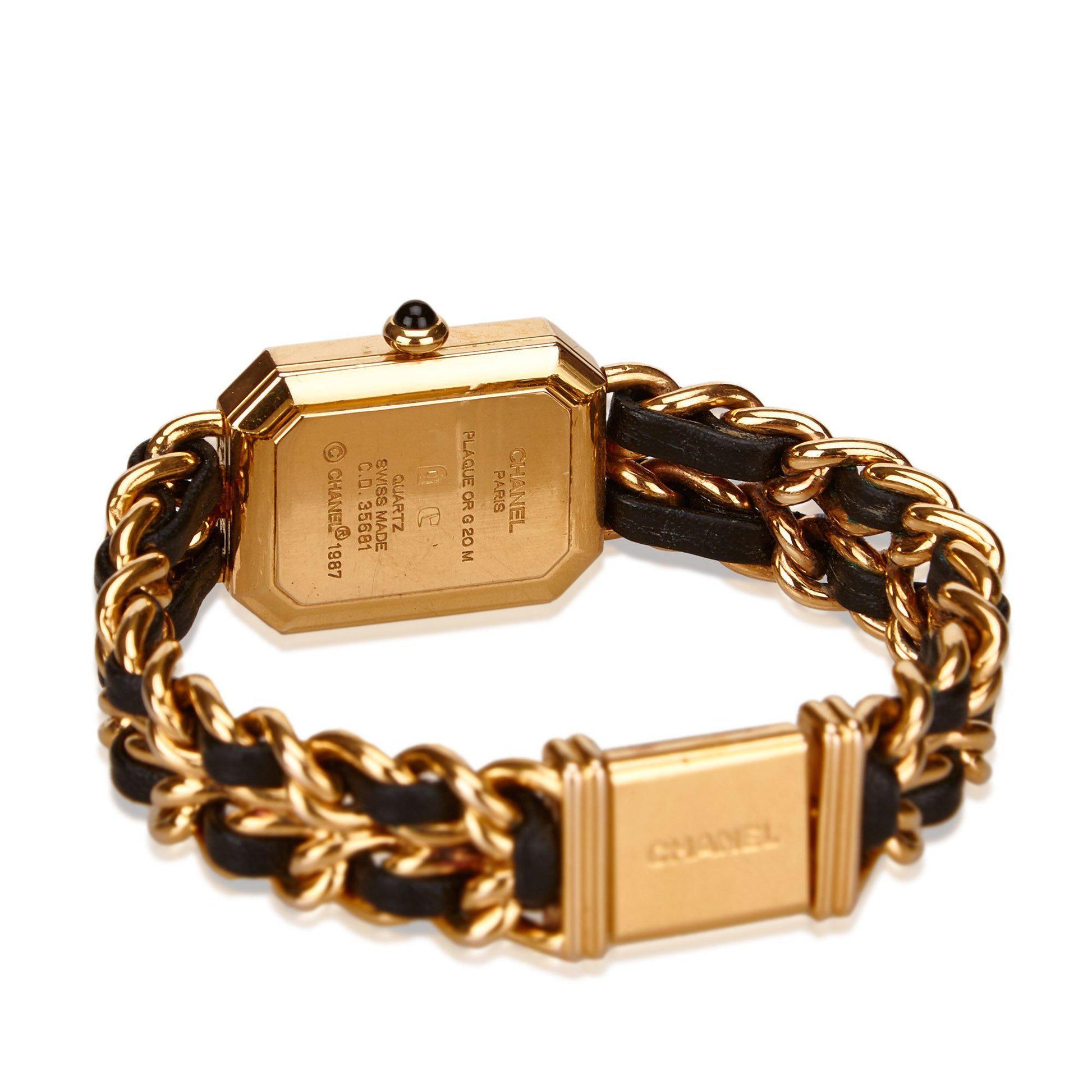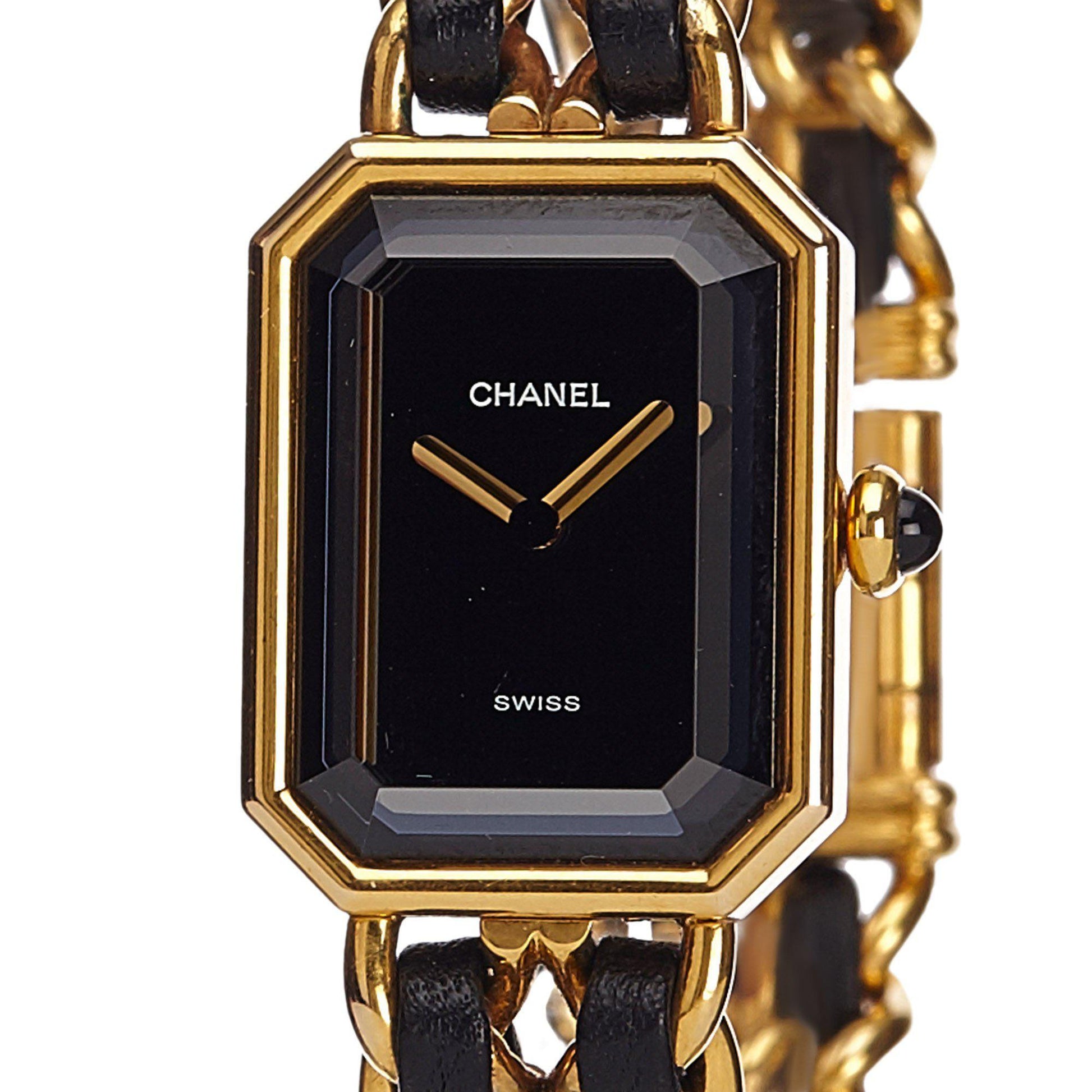 We the ity of this 27mm Chanel Premiere Rock Watch featuring 18K yellow gold-plated stainless steel, leather detail, quartz movement, asmooth bezelwithblack dial and hinged clasp closure.
