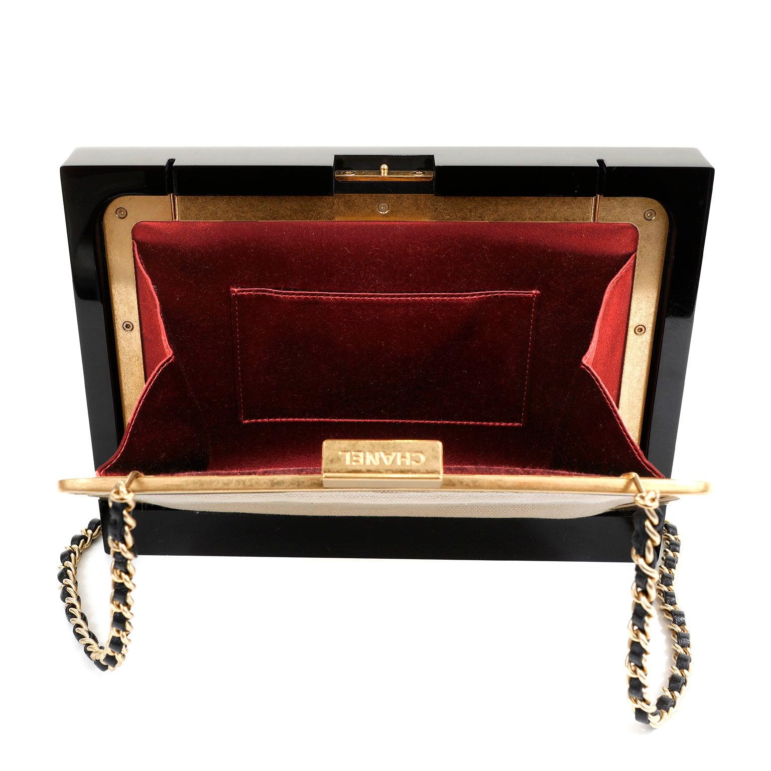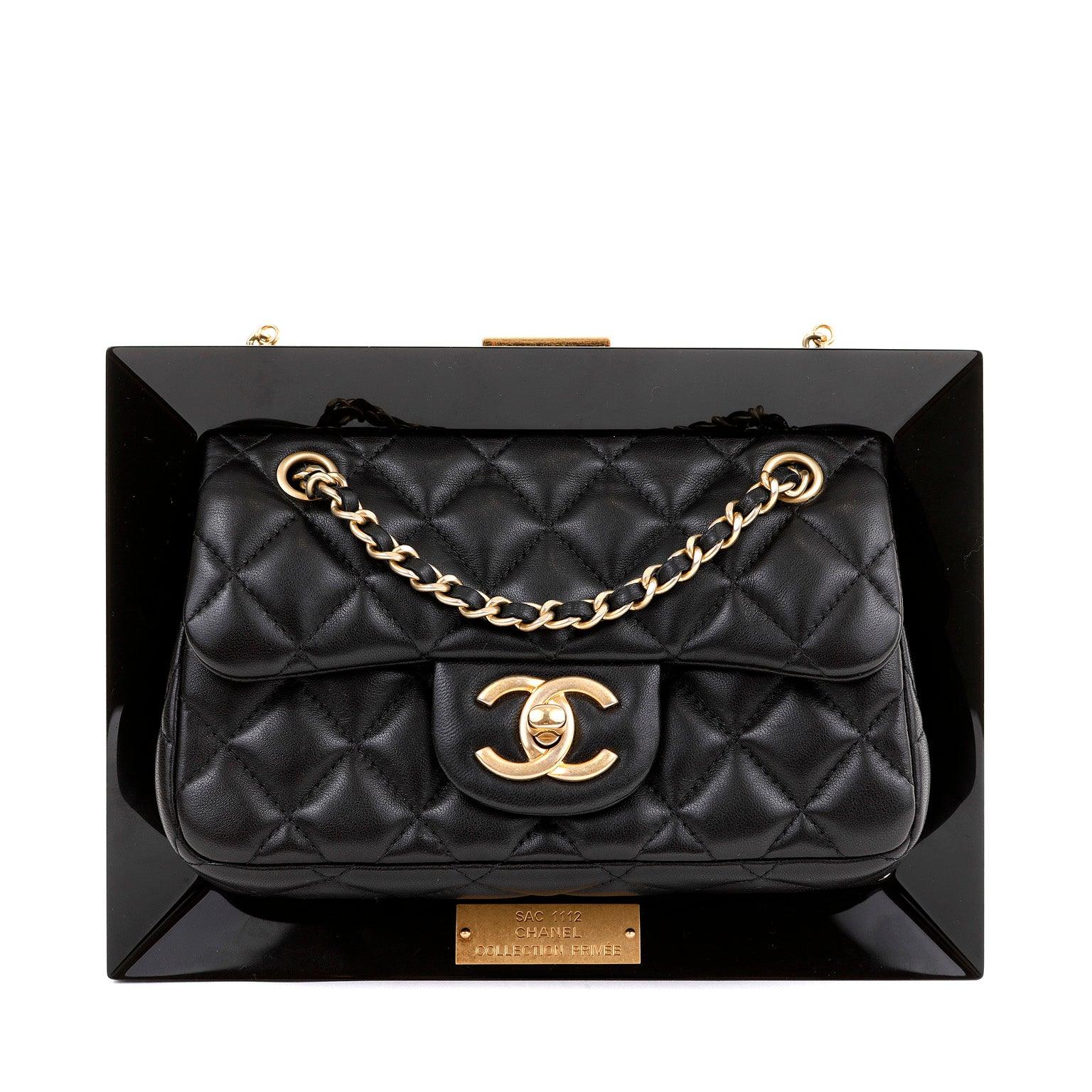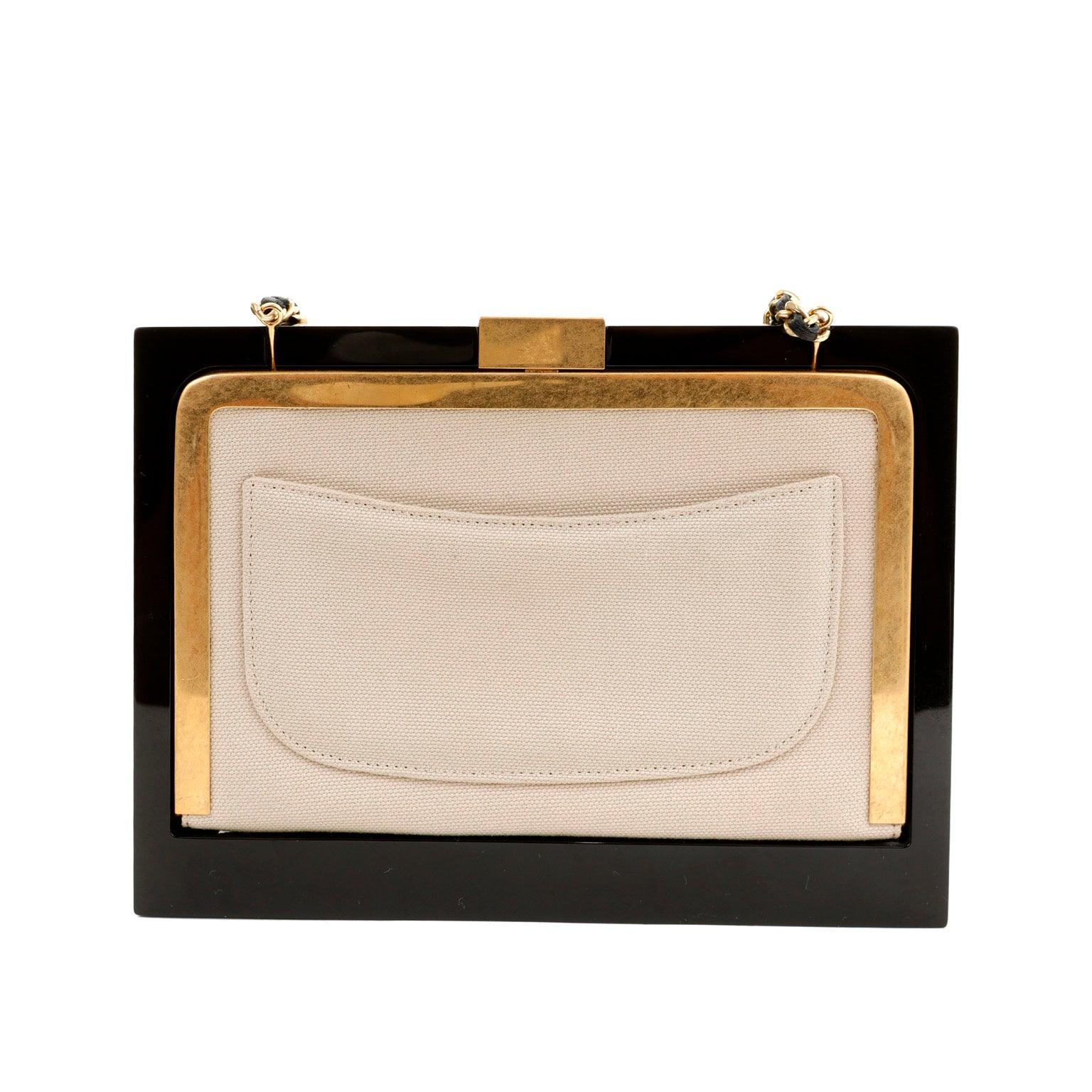Black quilted lambskin flap bag is attached to slim Plexiglass frame. Gold tone interlocking CC twist lock on the flap portion with a framed hinge lock clasp on top. May be carried by the strap or as a clutch. Dust bag included.