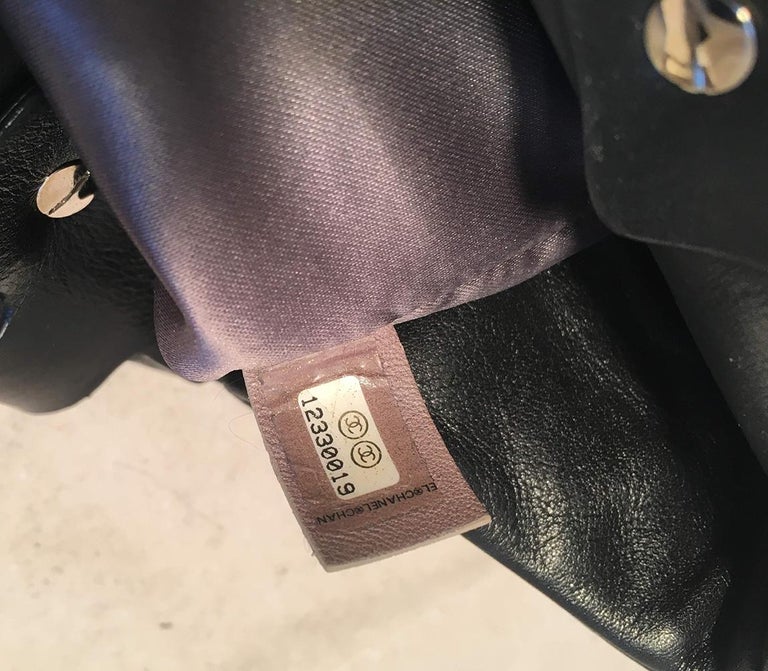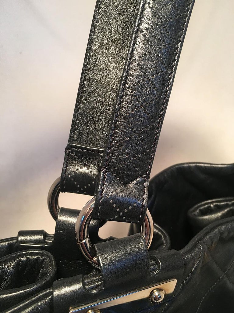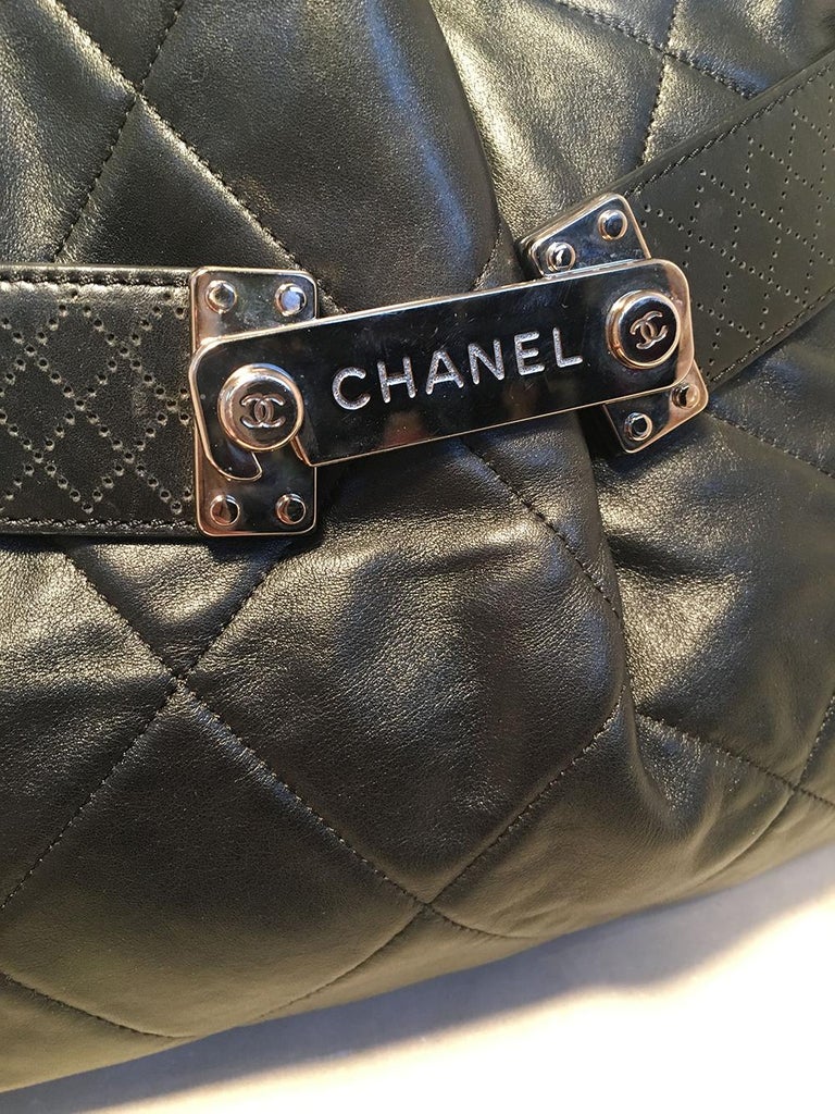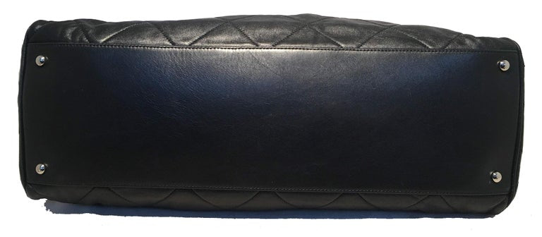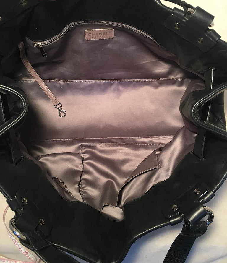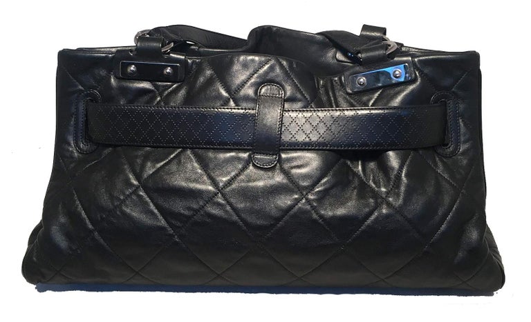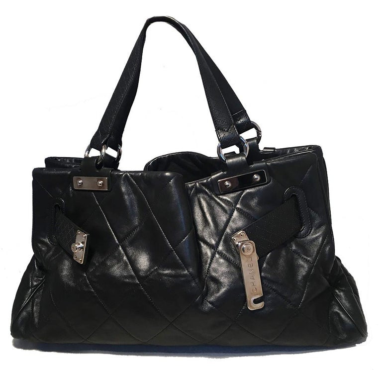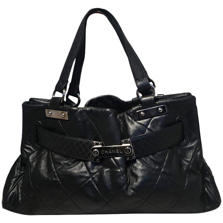 Chanel Quilted Black Leather Latch Front Tote Bag in excellent condition. Black quilted lambskin leather exterior trimmed with silver hardware, double top handles, and unique woven latch front double strap front closure. Grey satin lined interior with plenty of space for all your belongings and more with one zipped and 2 slit side pockets. No stains or scuffs. Clean corners and edges. Light signs of use inside consistent with gentle use. Purchase includes a dust cover. Measurements: 18"x9.5"x7" 7.5" handle drop