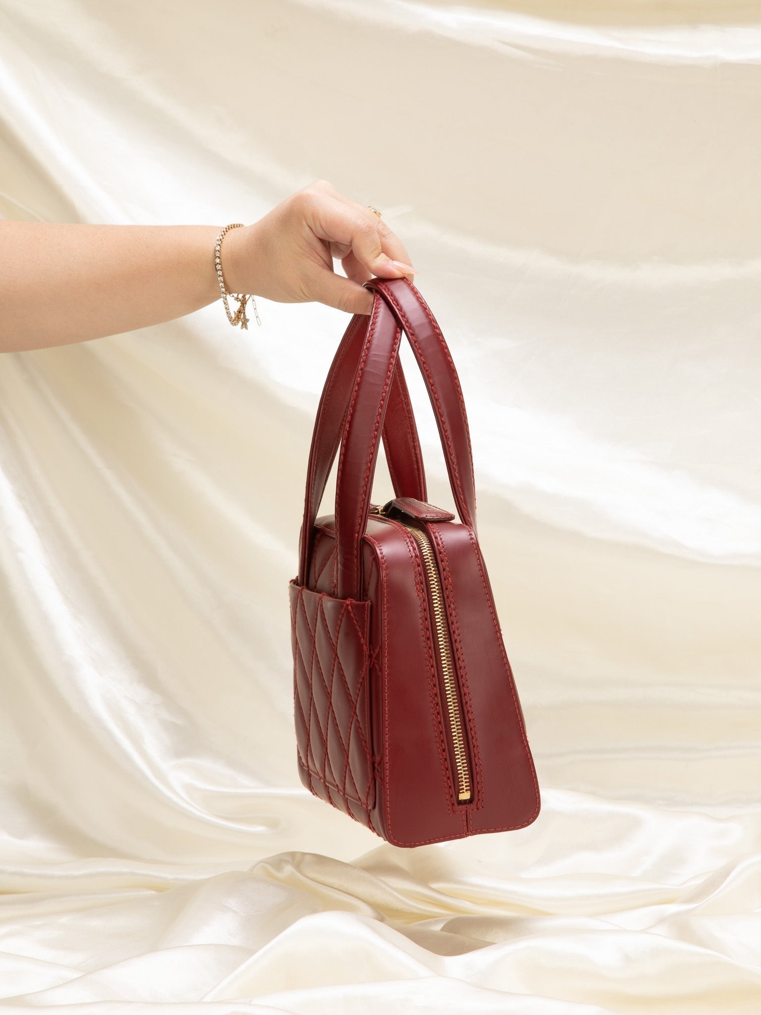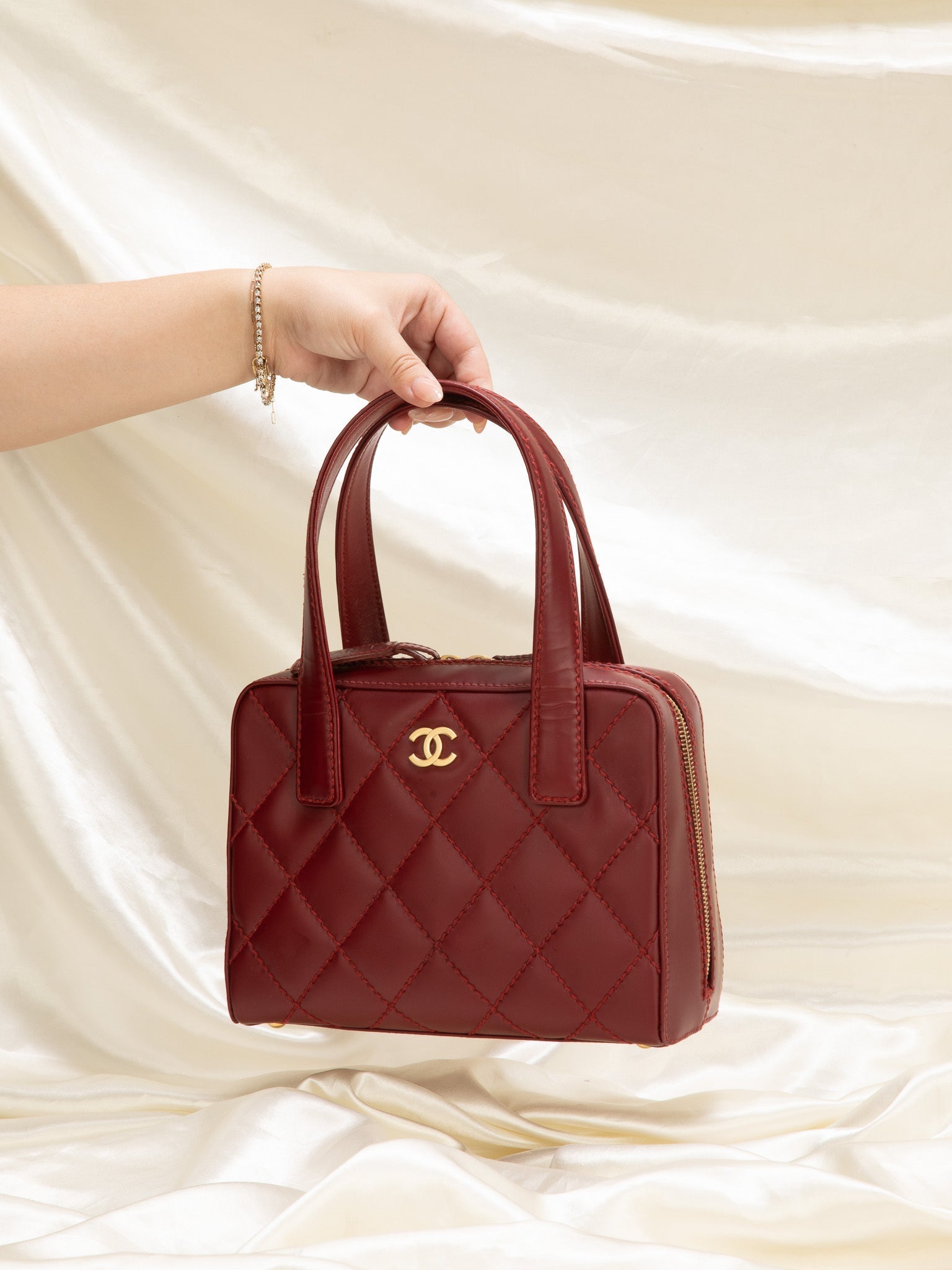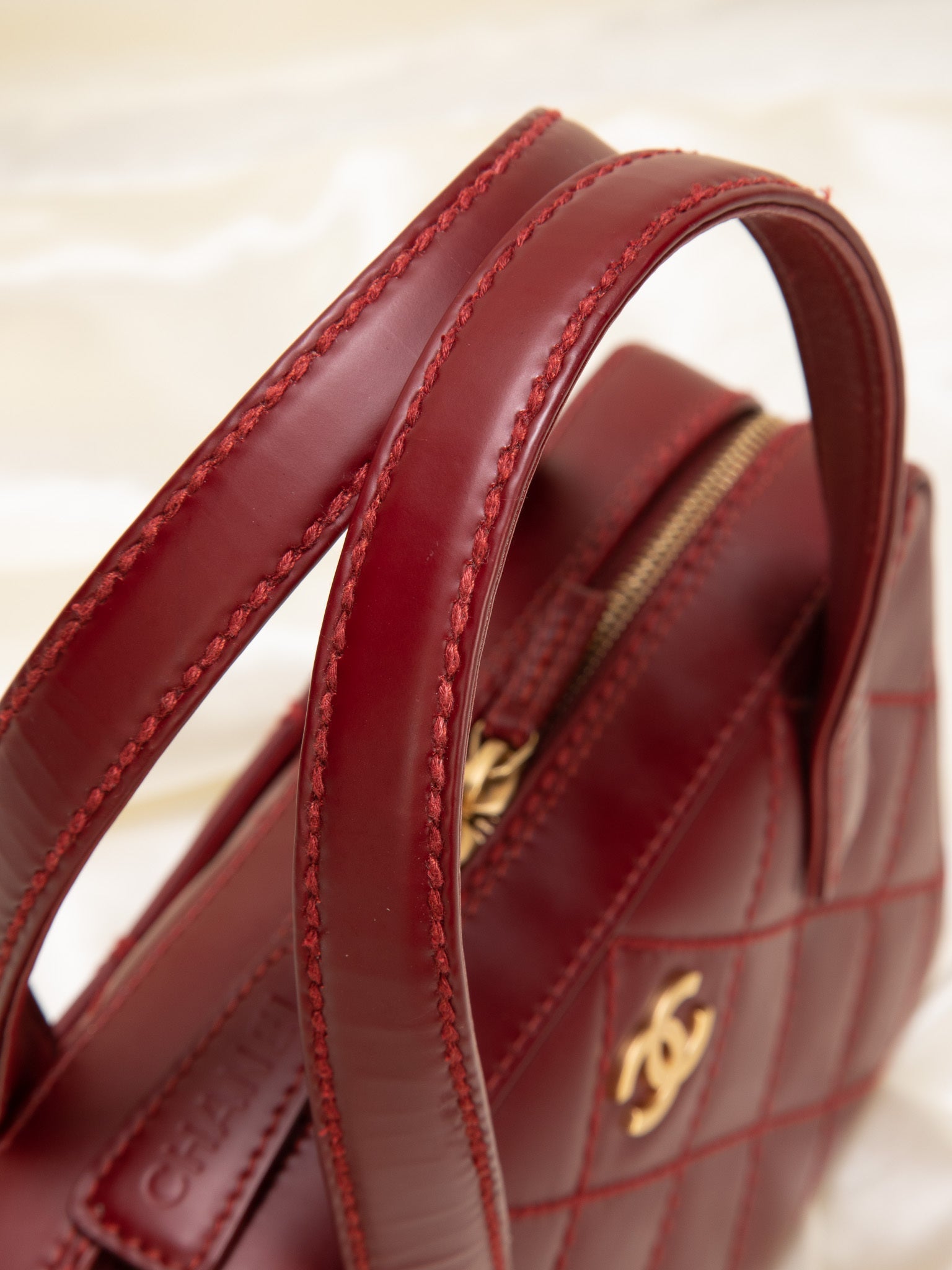 A beautiful burgundy Chanel with matching red contrast stitching.?Unique and perfect for everyday use! Calfskin?material allows for more durability.?