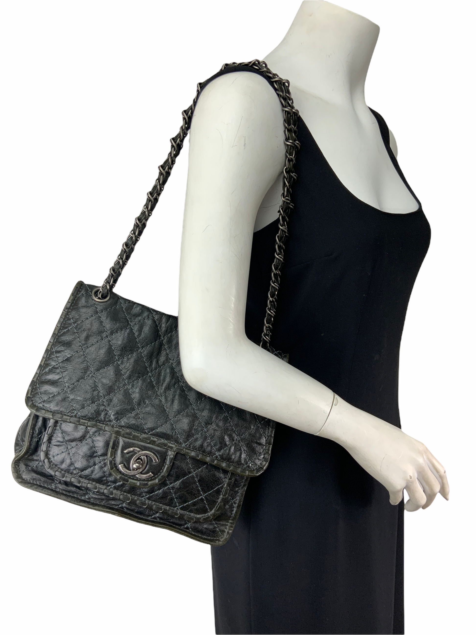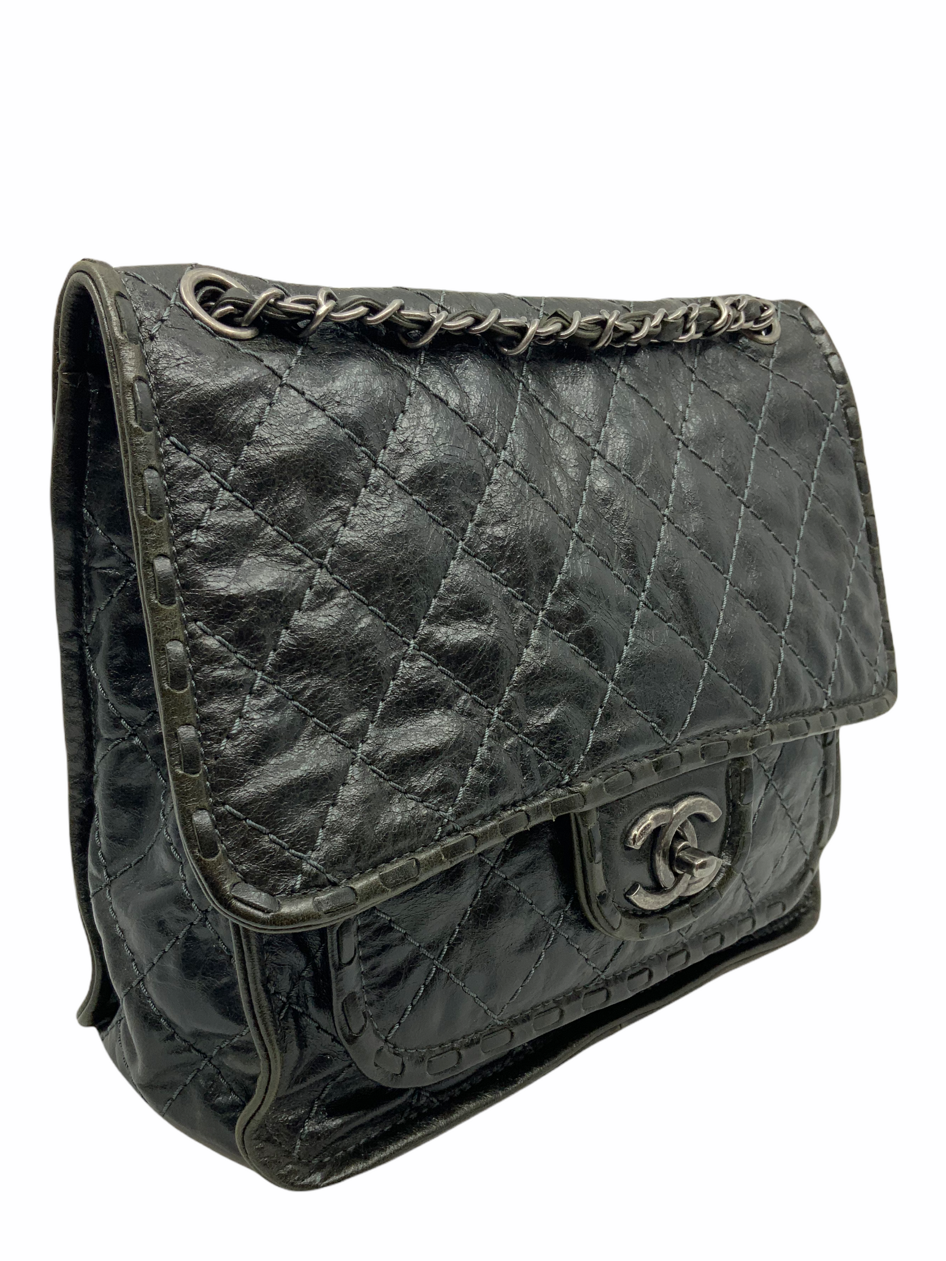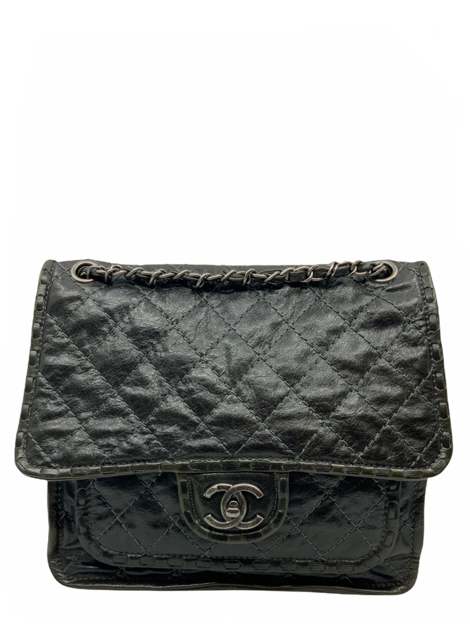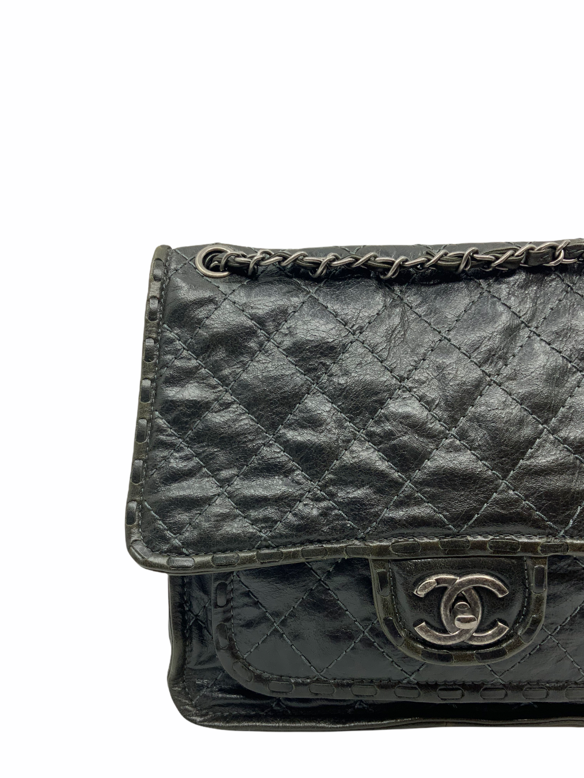 Add this Chanel Quilted Calfskin Whipstitch Flap Bag 2015 to your collection today! This chic and sophisticatedshoulder bag has a sleek design and is beautifullycrafted fromblack distressed quiltedcalfskin with elegant ruthenium hardware.Featuring double chain link straps that can be long or doubled,a whipstitch trim detail around the edges of the bag and a signature 'CC' turn-lock to secure it. Shop designer handbags by Chanelat.