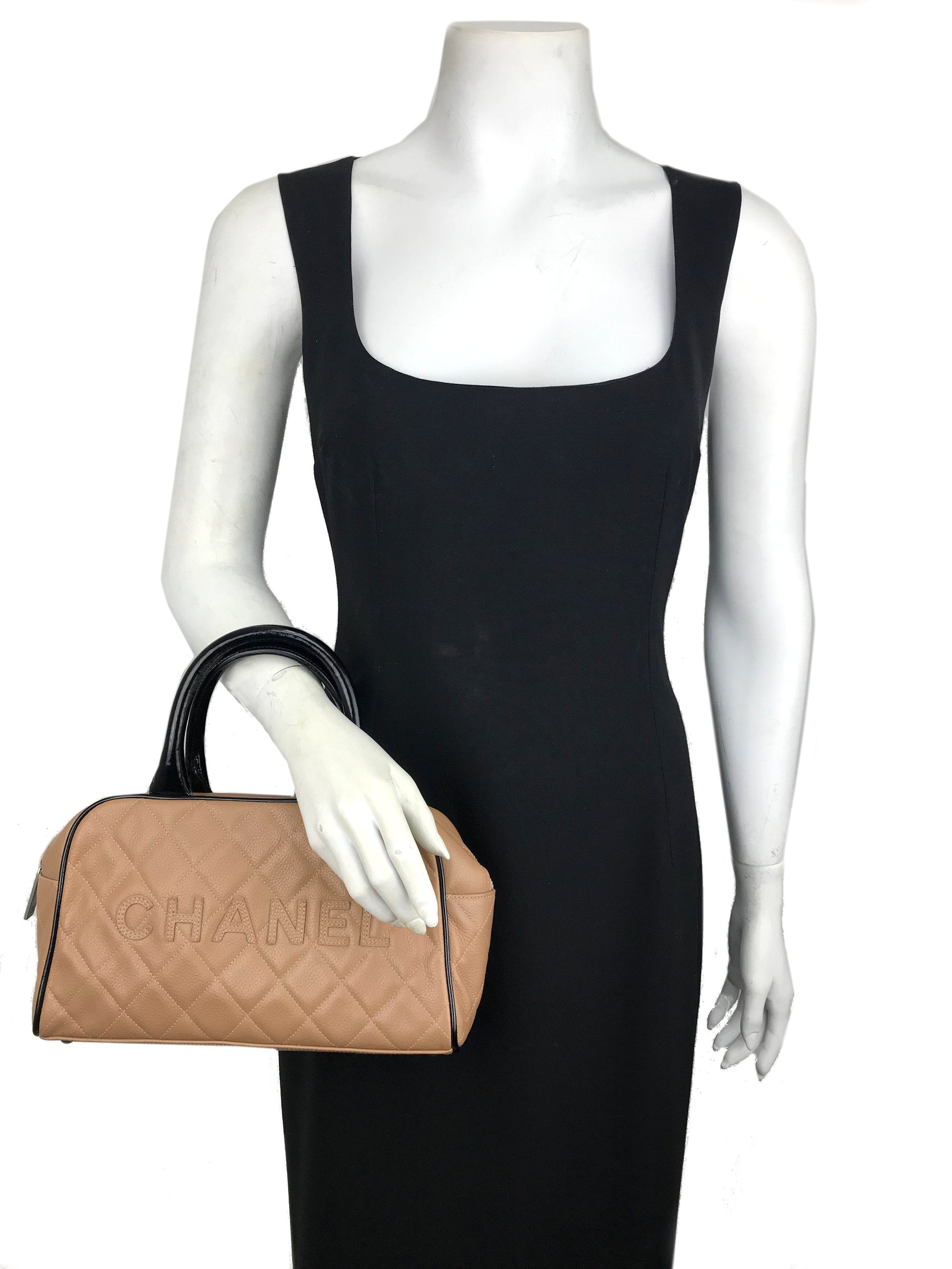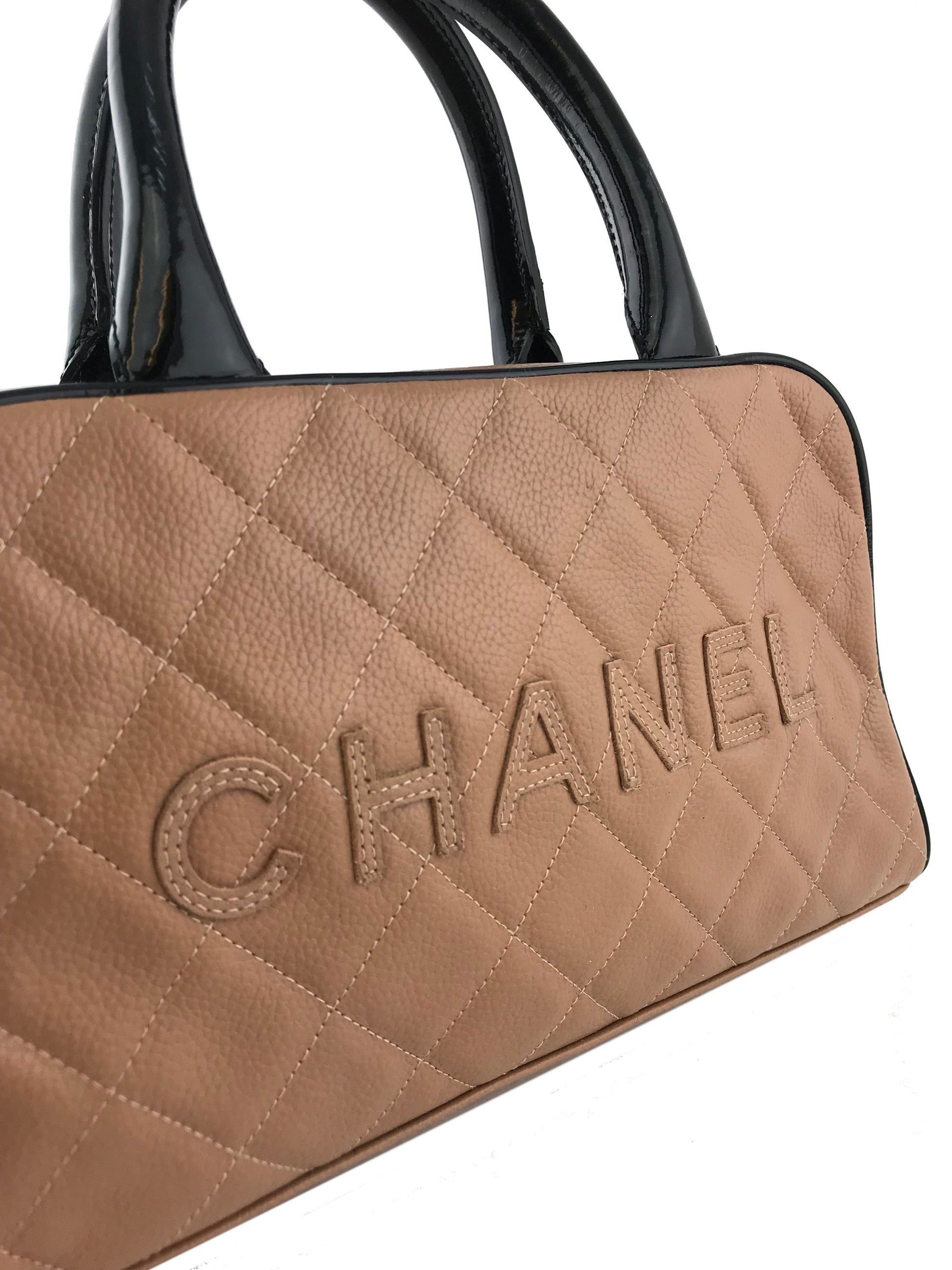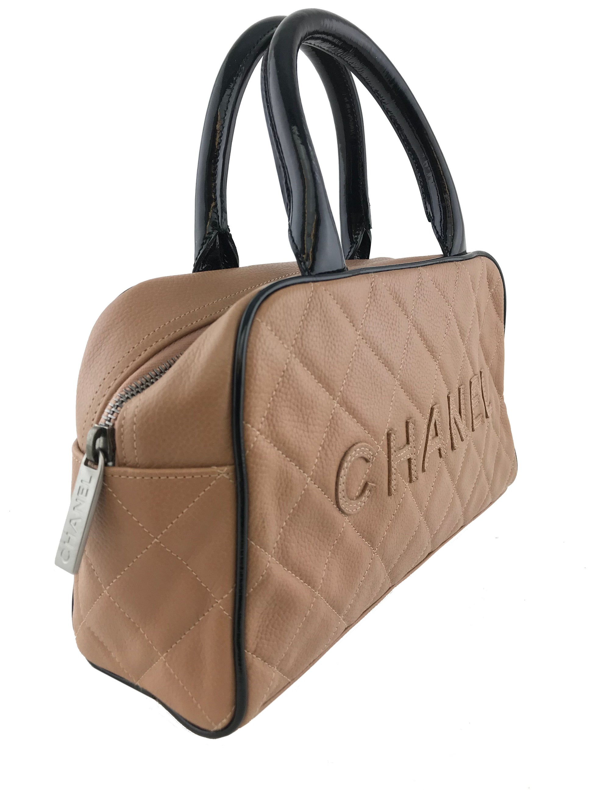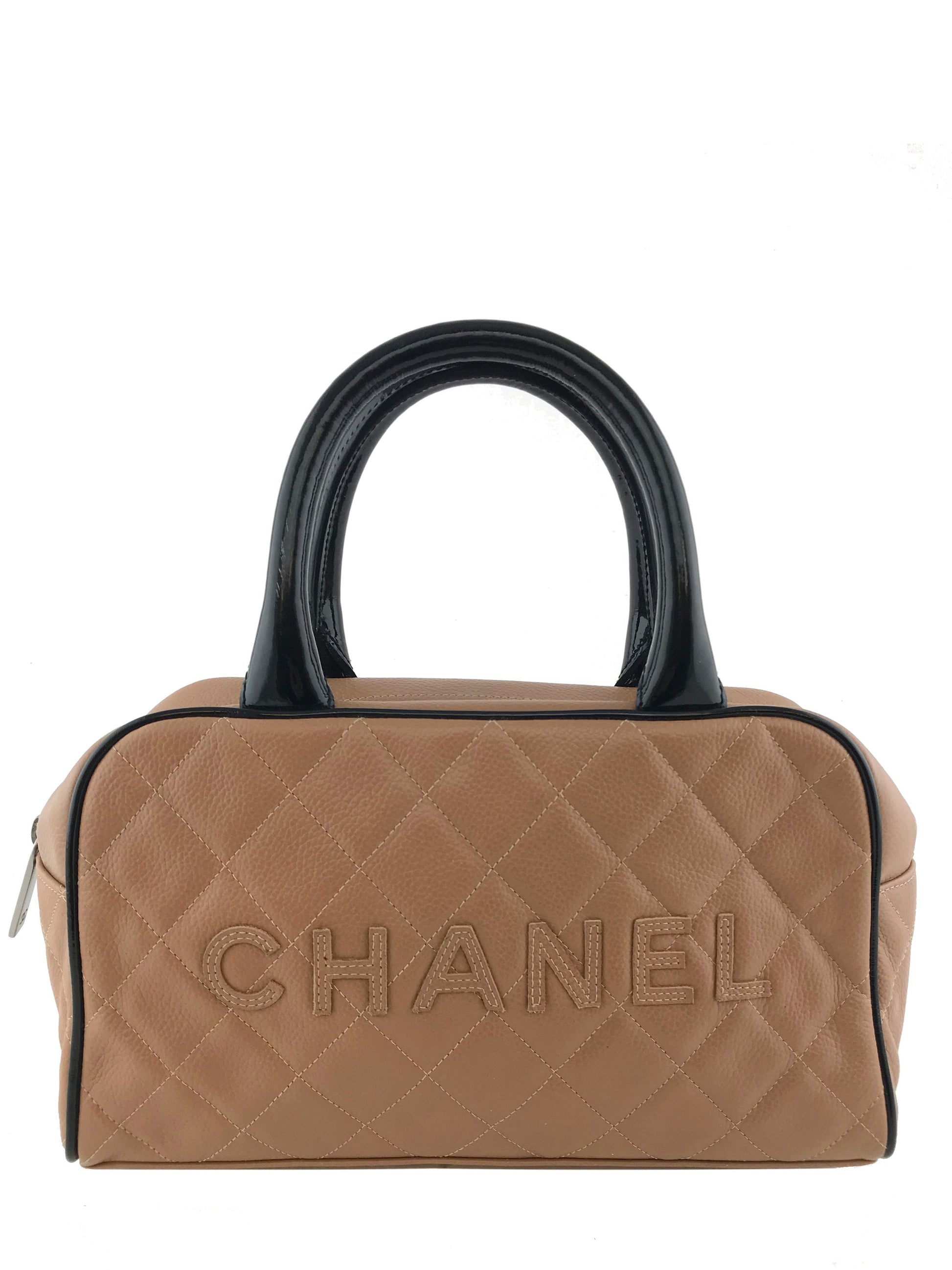 We the ity of this chic and sophisticated Chanel Quilted Caviar Leather Small Bowler Bag crafted from light brown diamond quilted caviar leather andsilver platedhardware. This highly sought after bag featuresrolled black patent leather top handles and a signature logo accent across the front of the bag.