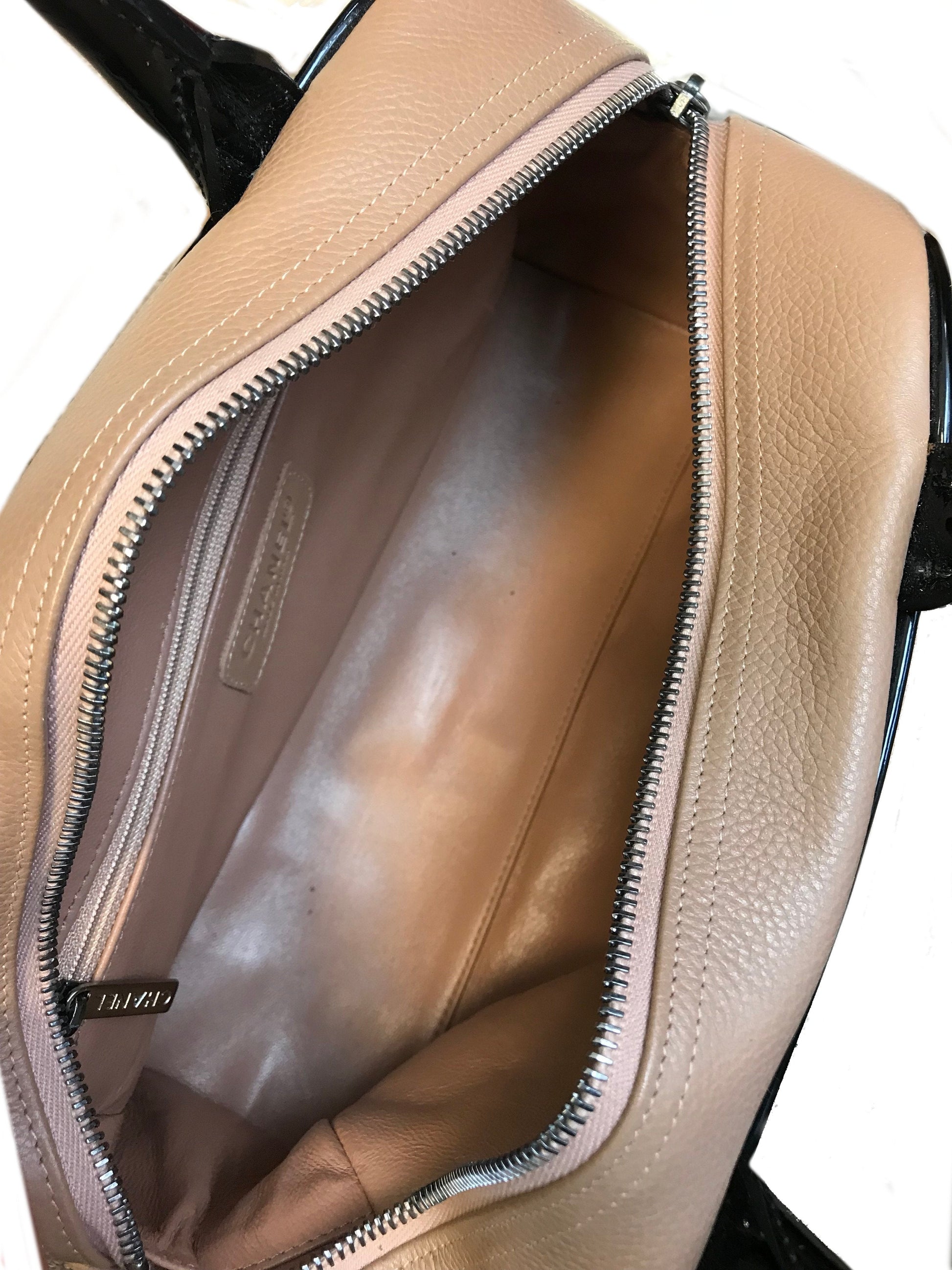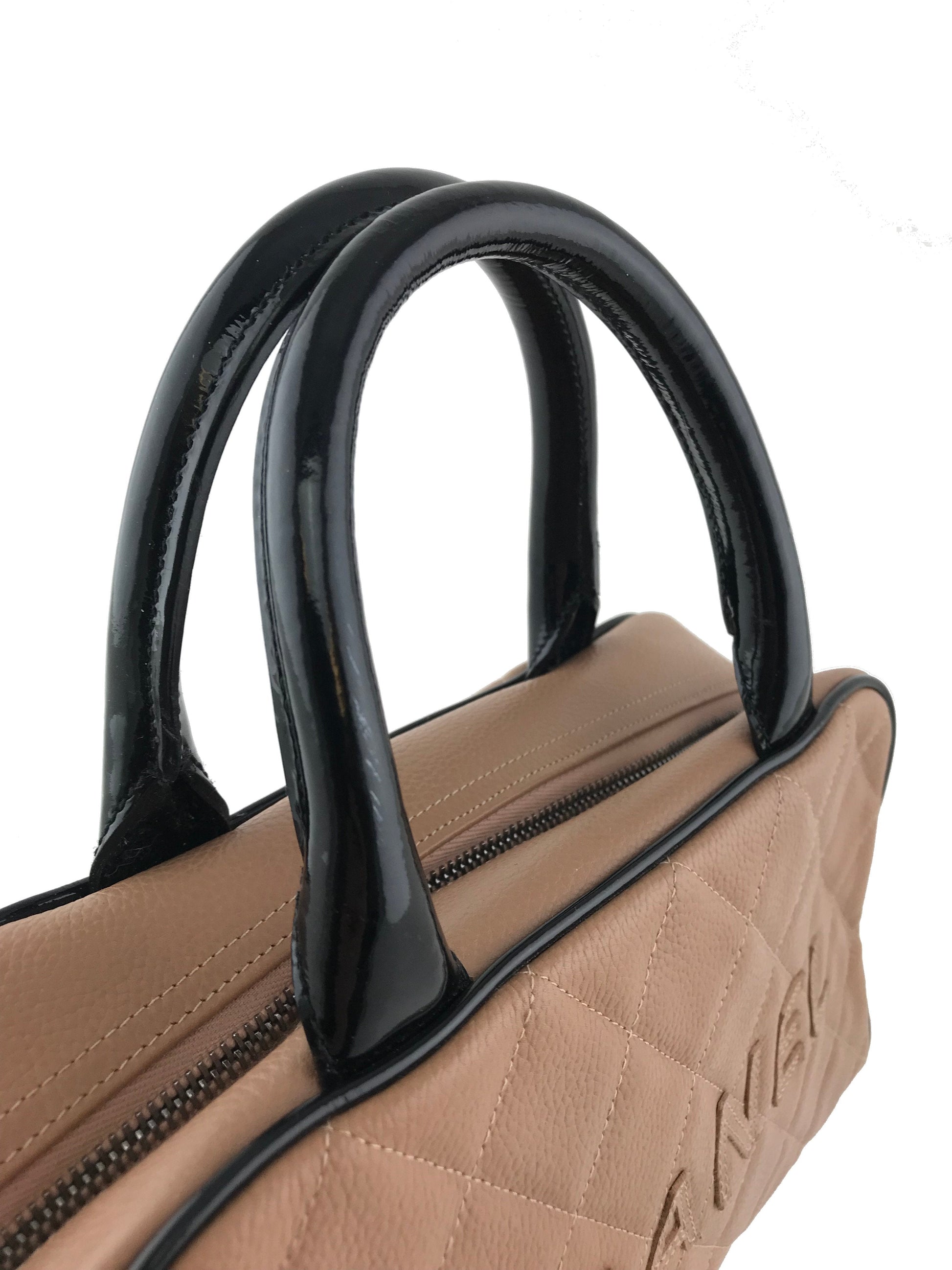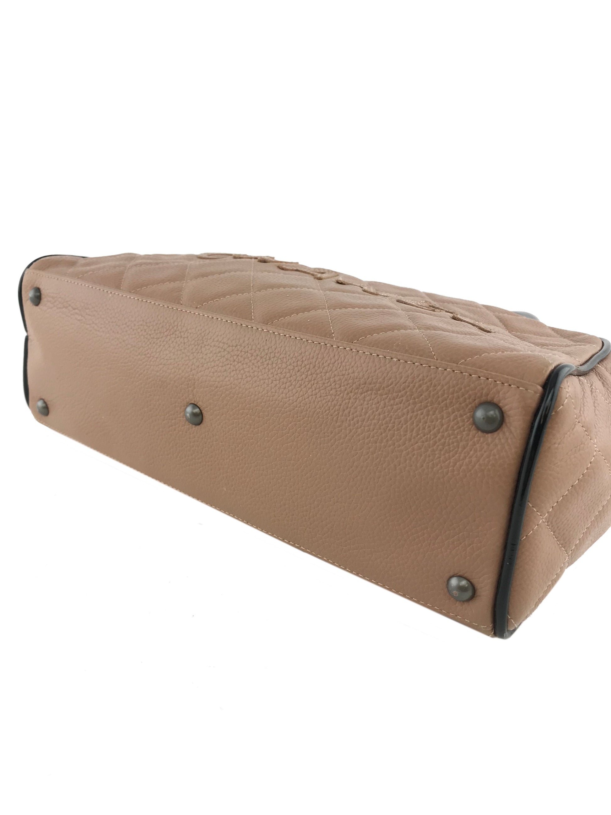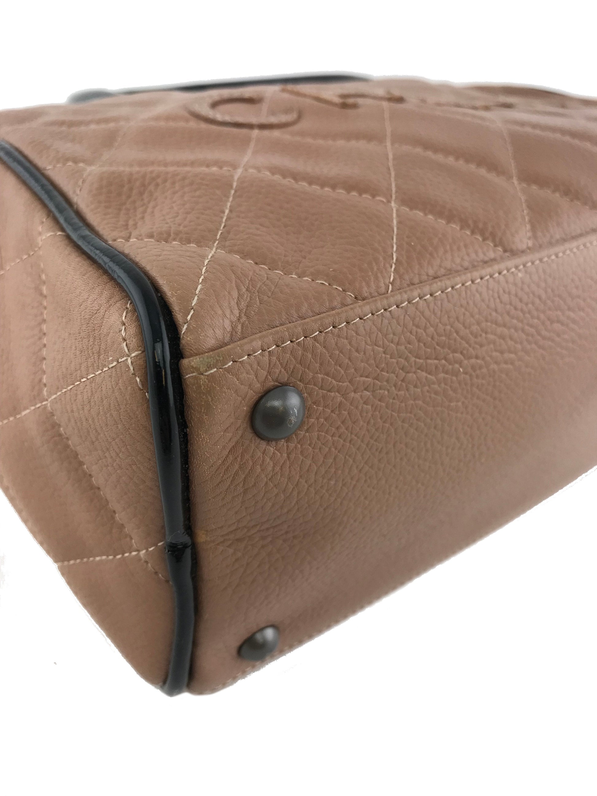 We the ity of this chic and sophisticated Chanel Quilted Caviar Leather Small Bowler Bag crafted from light brown diamond quilted caviar leather andsilver platedhardware. This highly sought after bag featuresrolled black patent leather top handles and a signature logo accent across the front of the bag.