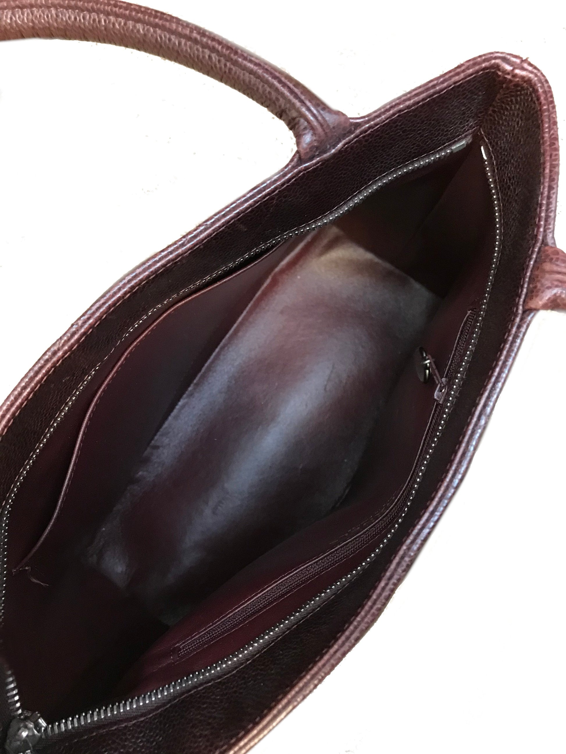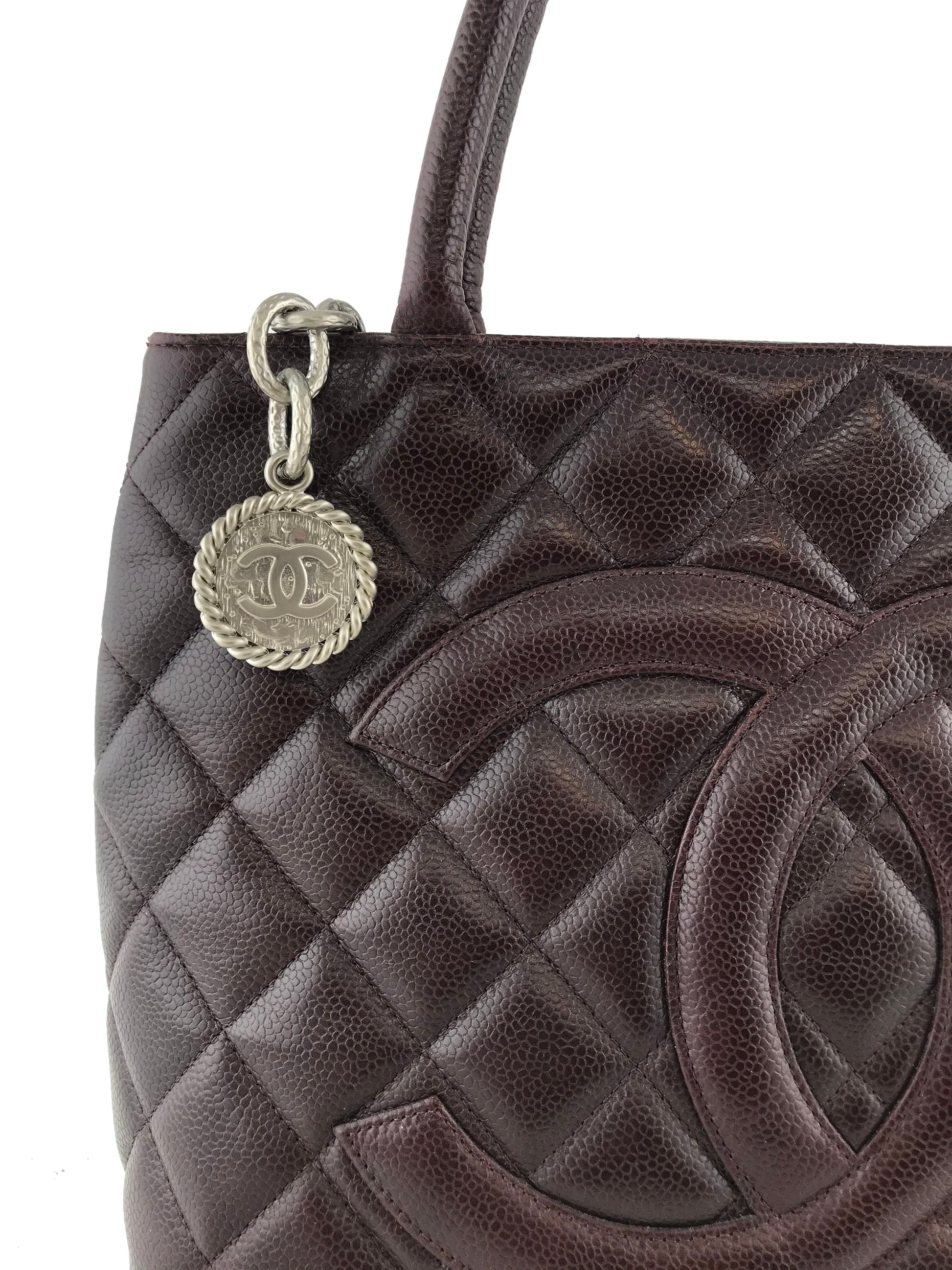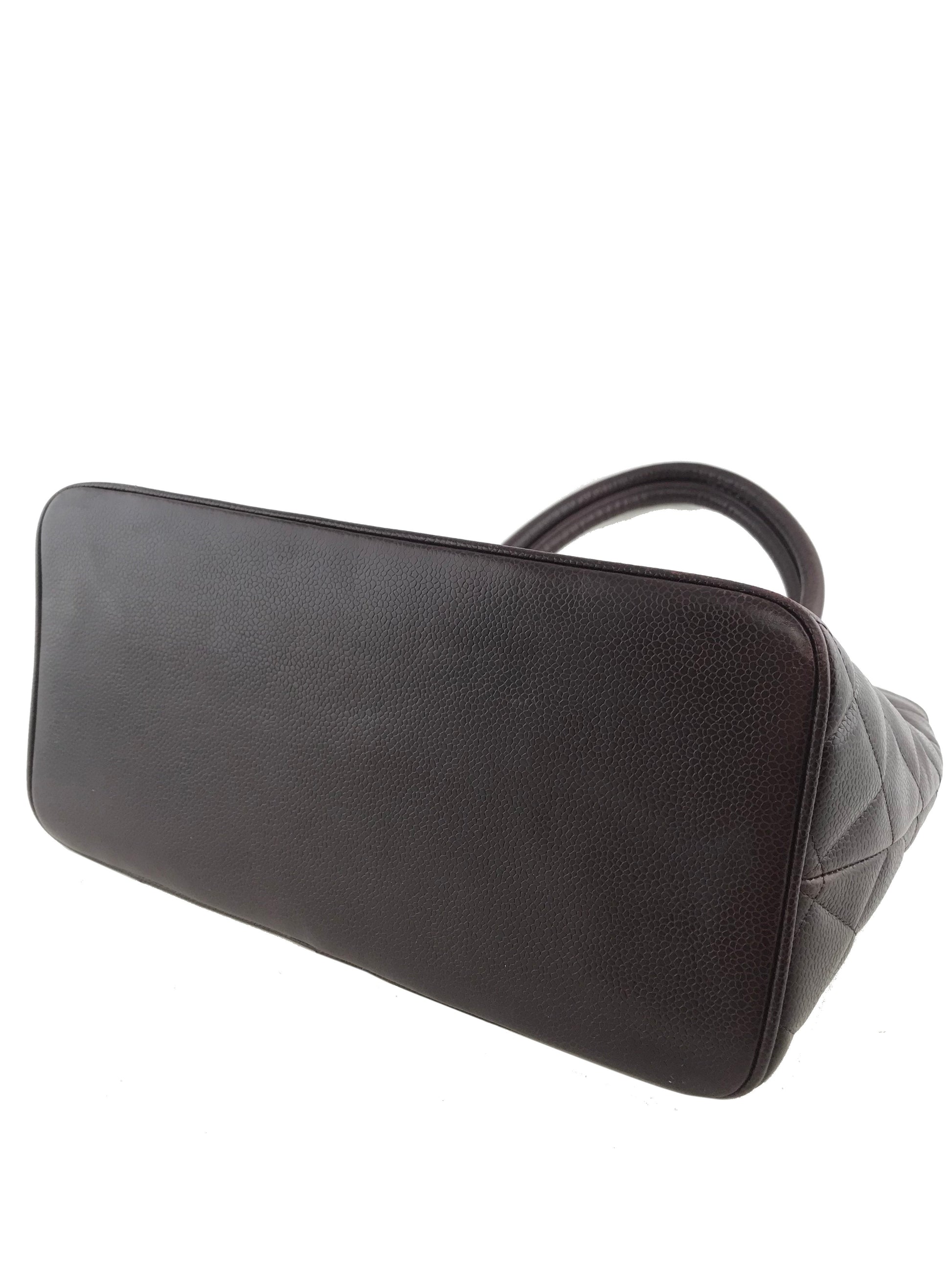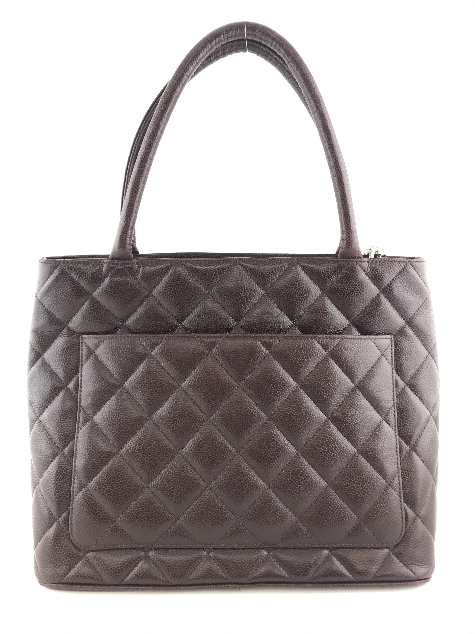 This and highly sought-after Chanel Quilted Caviar Medallion Tote Bag is a must-have in any fashionista's collection. This iconicbag is crafted fromsignature brown diamond quilted caviar leather and silver-tone hardware. It features a bold large 'CC' stitched logo at front, rolled tote handles and a 'CC' medallion zip closure.