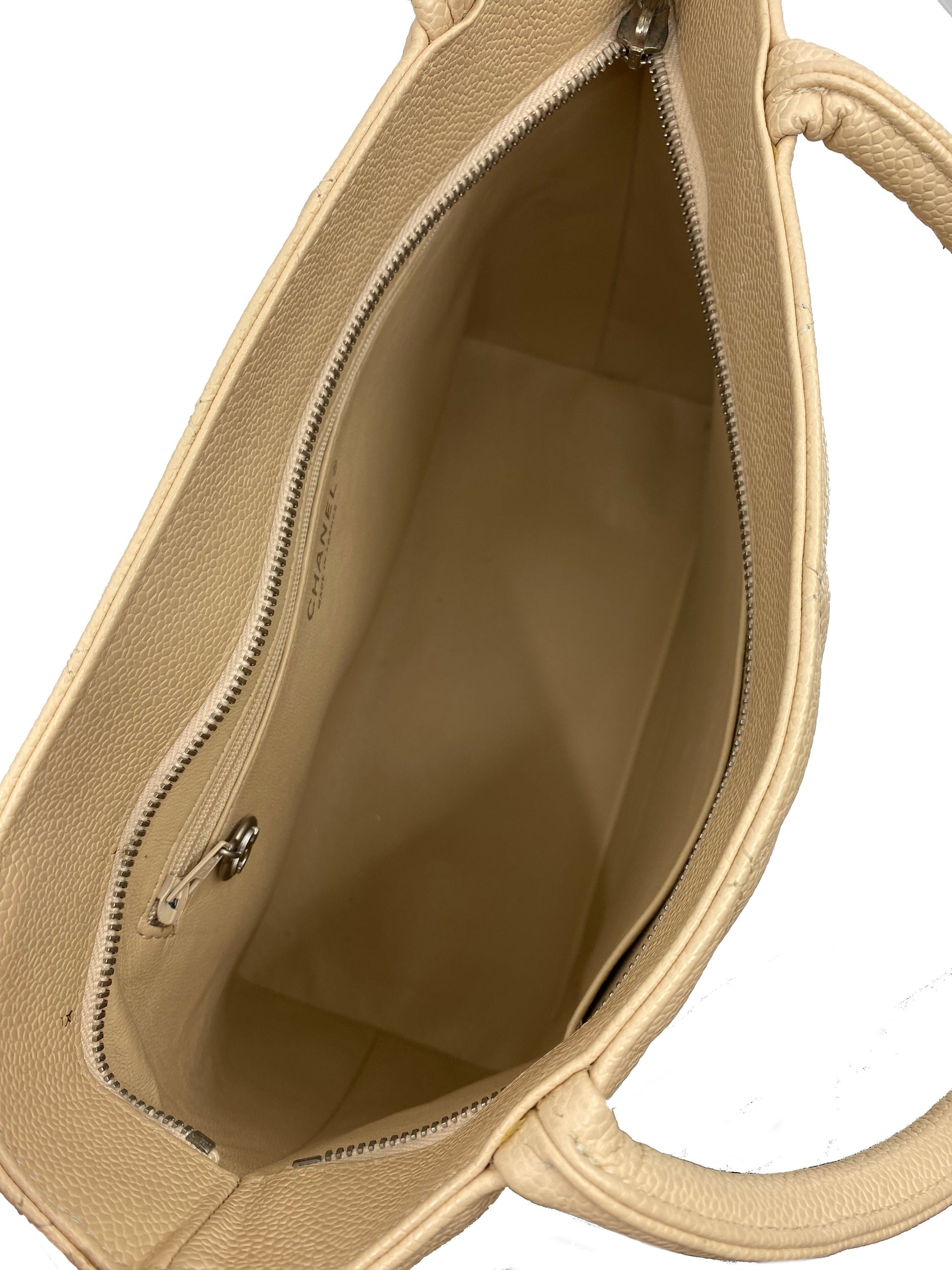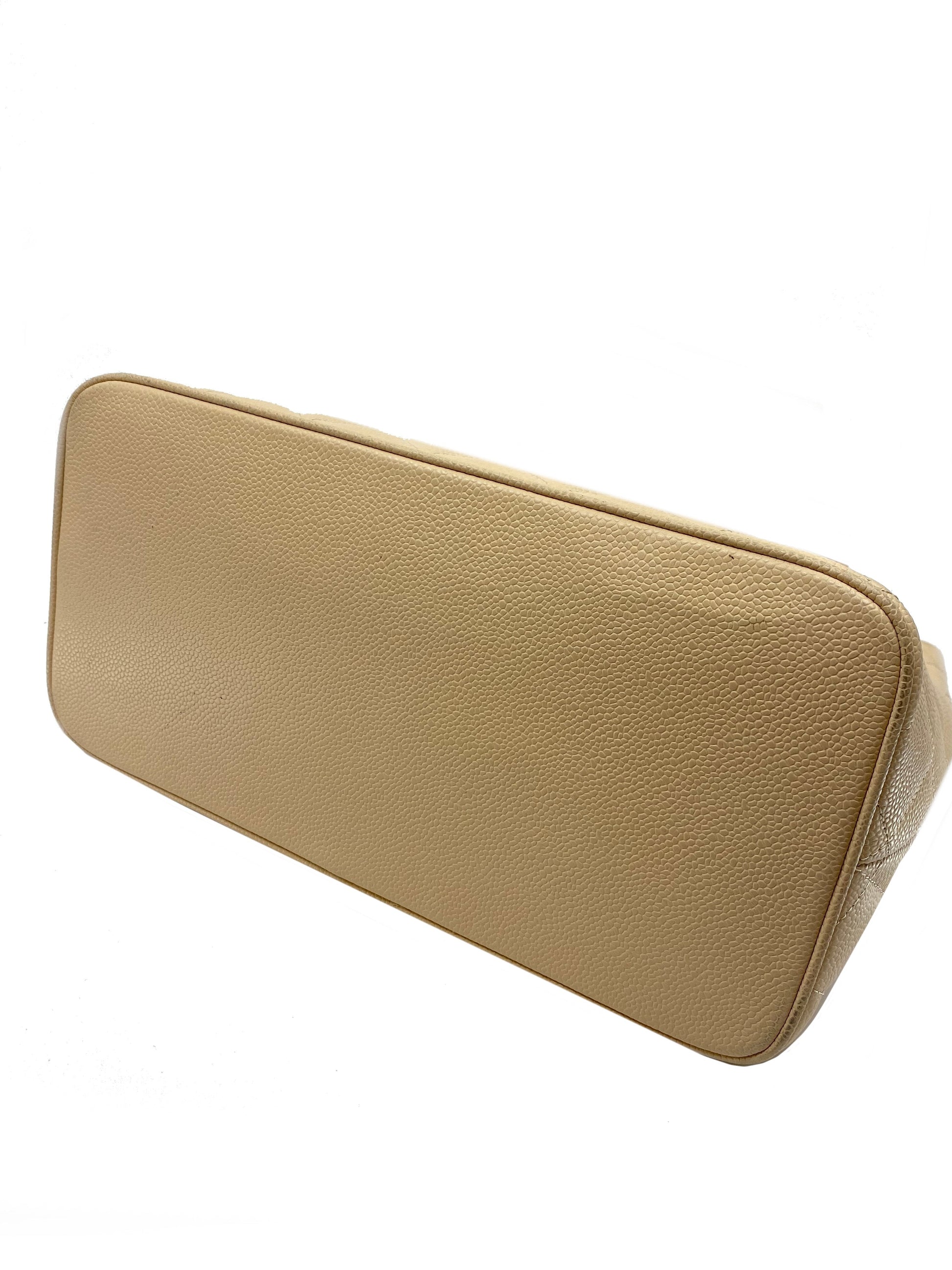 This and highly sought-after Chanel Quilted Caviar Medallion Tote Bag is a must-have in any fashionista's collection. This iconicbag is crafted fromsignature cream diamond quilted caviar leather and silver-tone hardware. It features a bold large 'CC' stitched logo at front, rolled tote handles and a 'CC' medallion zip closure.