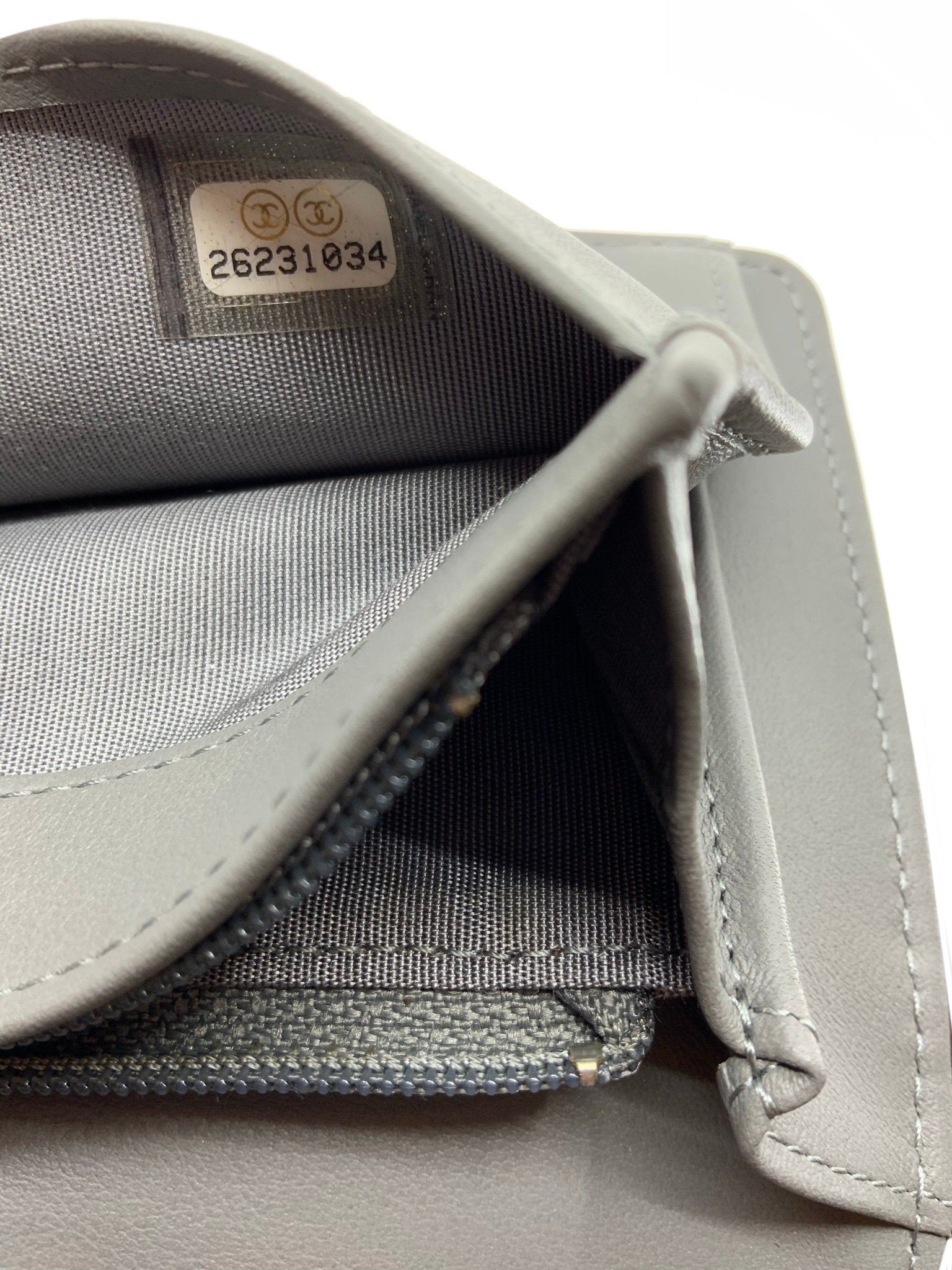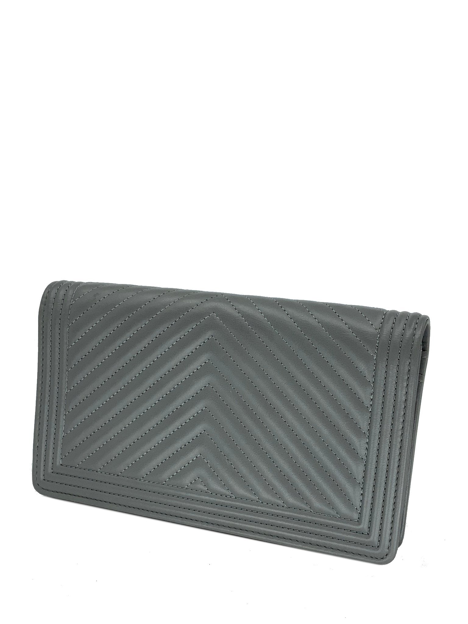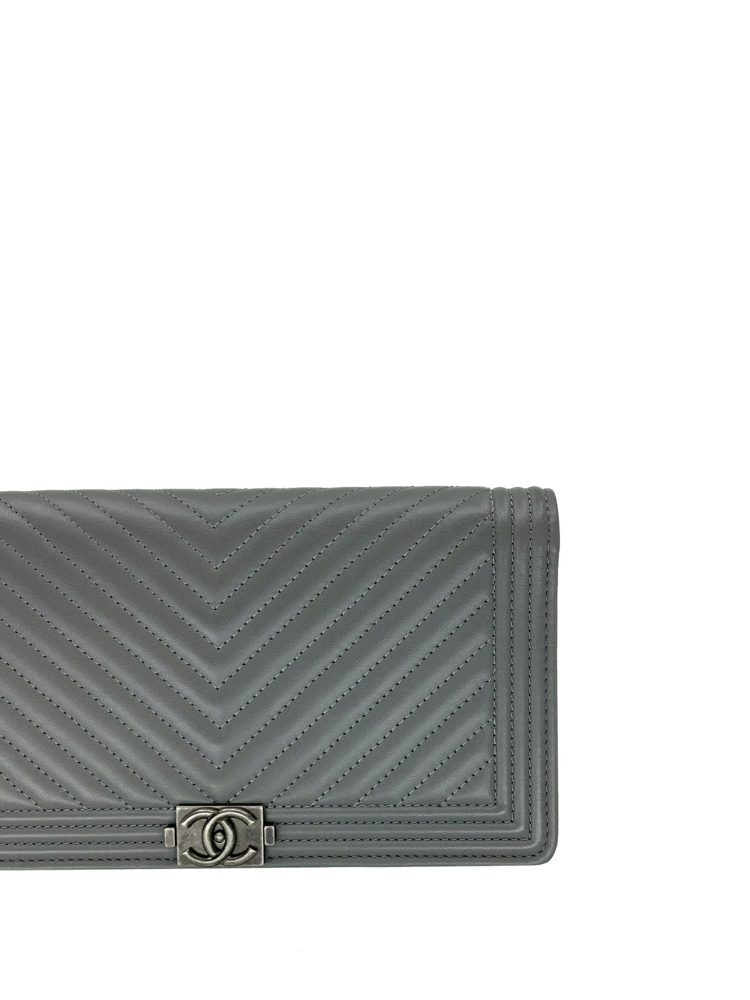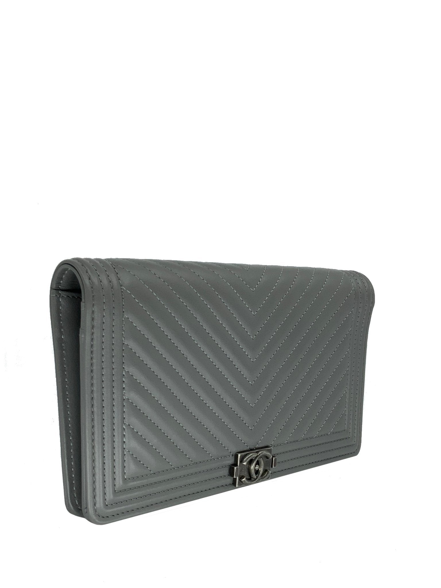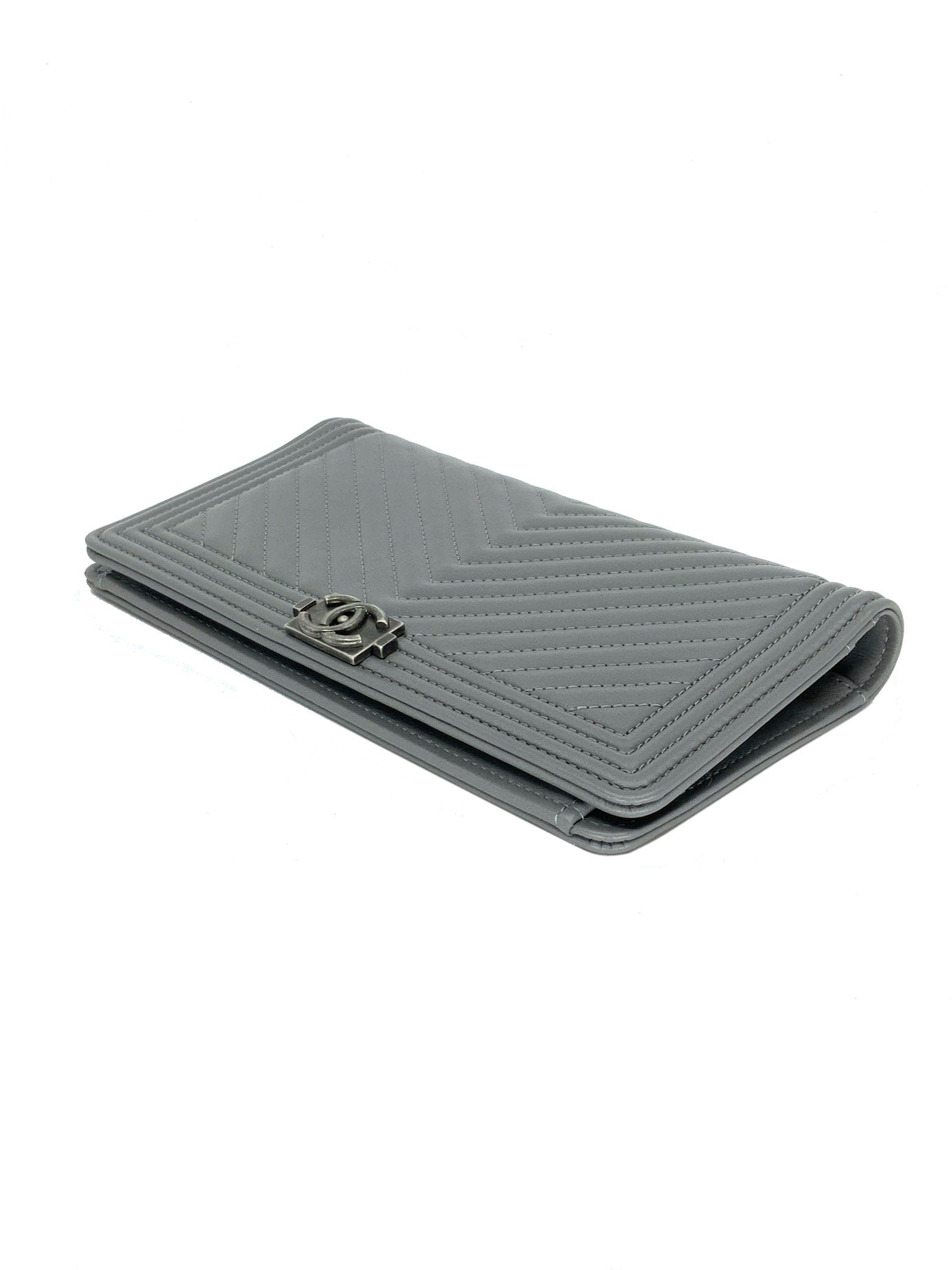 Organize your essentials like bills and credit cards in style with thisd Chanel Quilted Chevron Lambskin Leather Long Boy Wallet crafted from gray chevron quilted lambskin with a signature 'CC' logo at front.Thischicwallet features matching tonal interior leather lining and multiple card slots and bill compartments.
