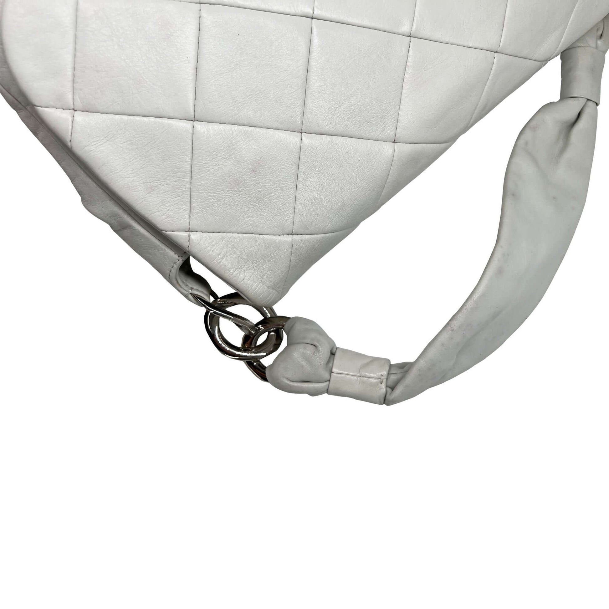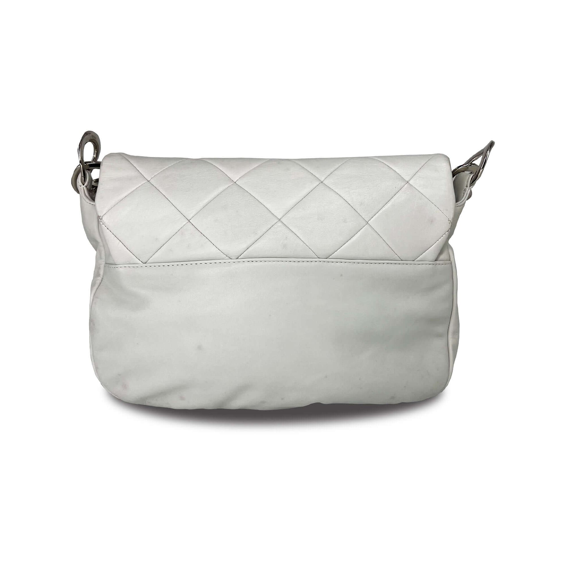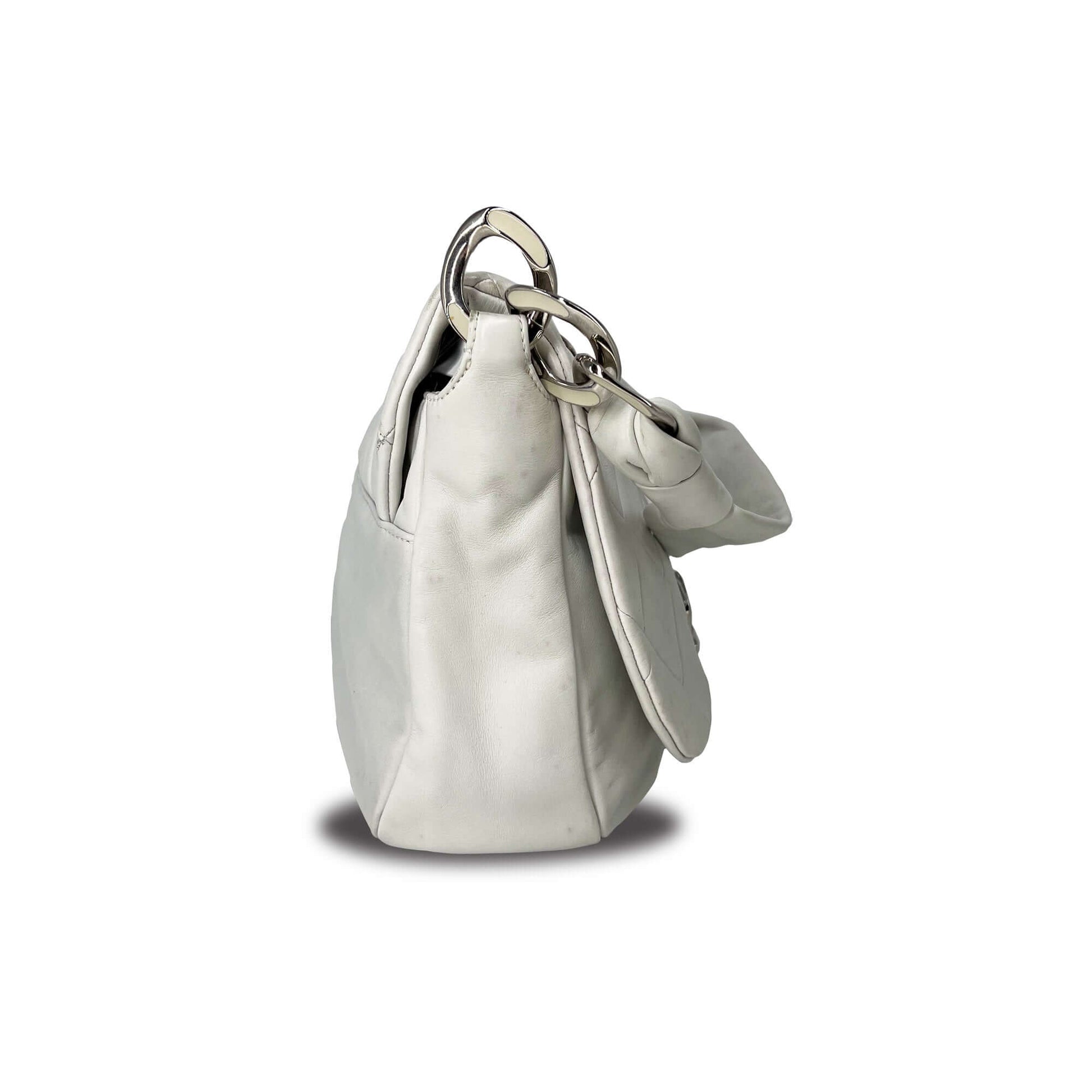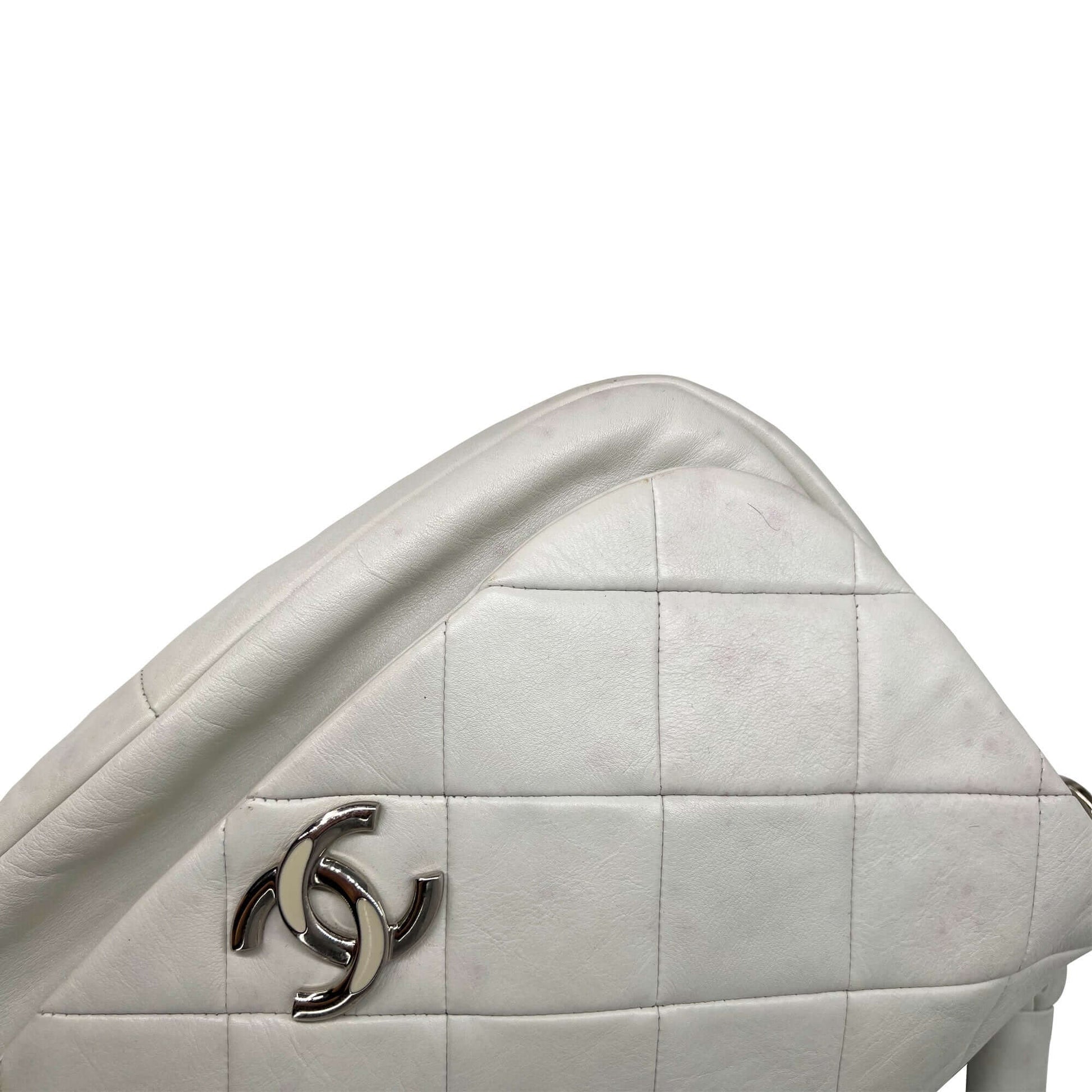 A vintage piece from Chanel in white quilted leather featuring silver tone CC logo on top of the magnetic closure.