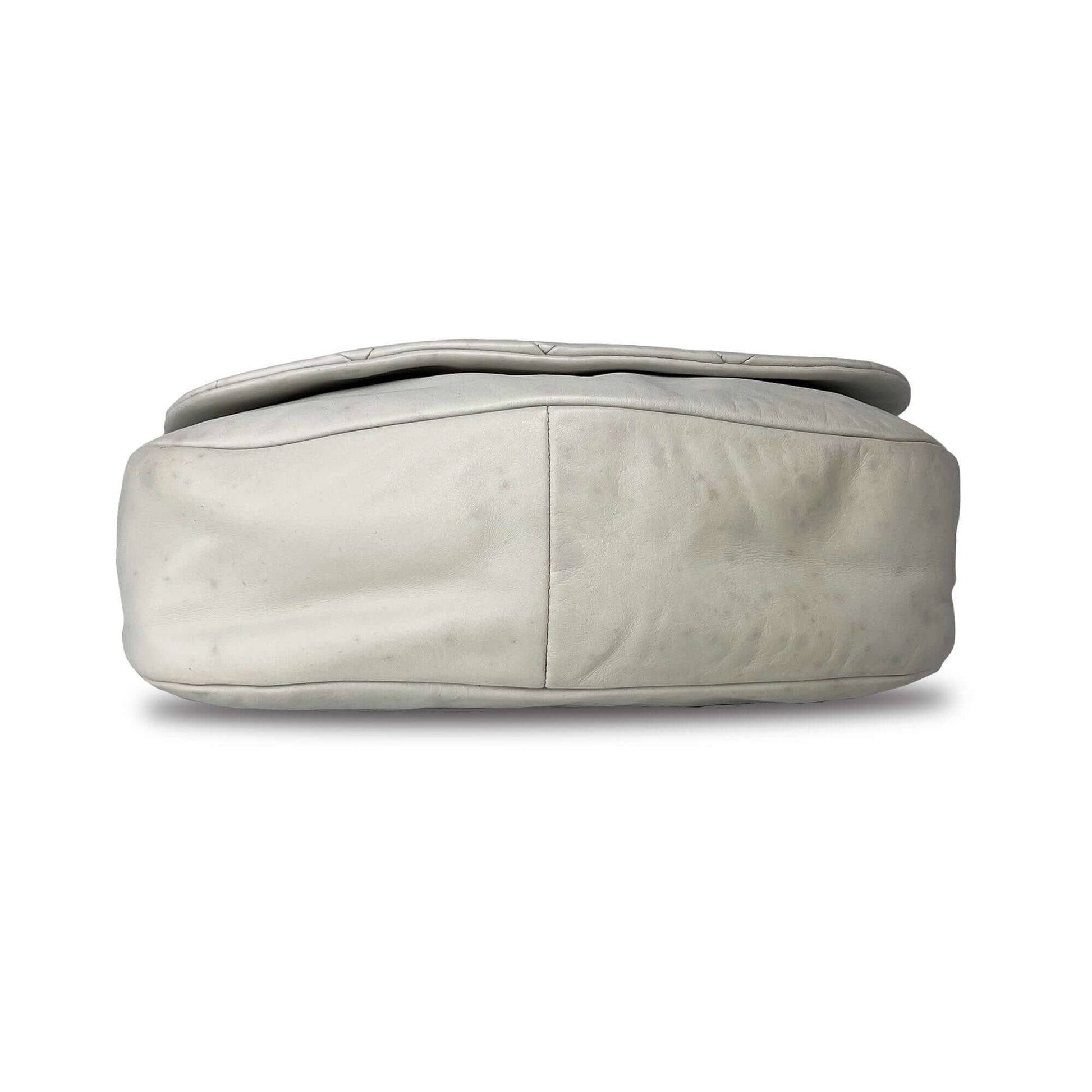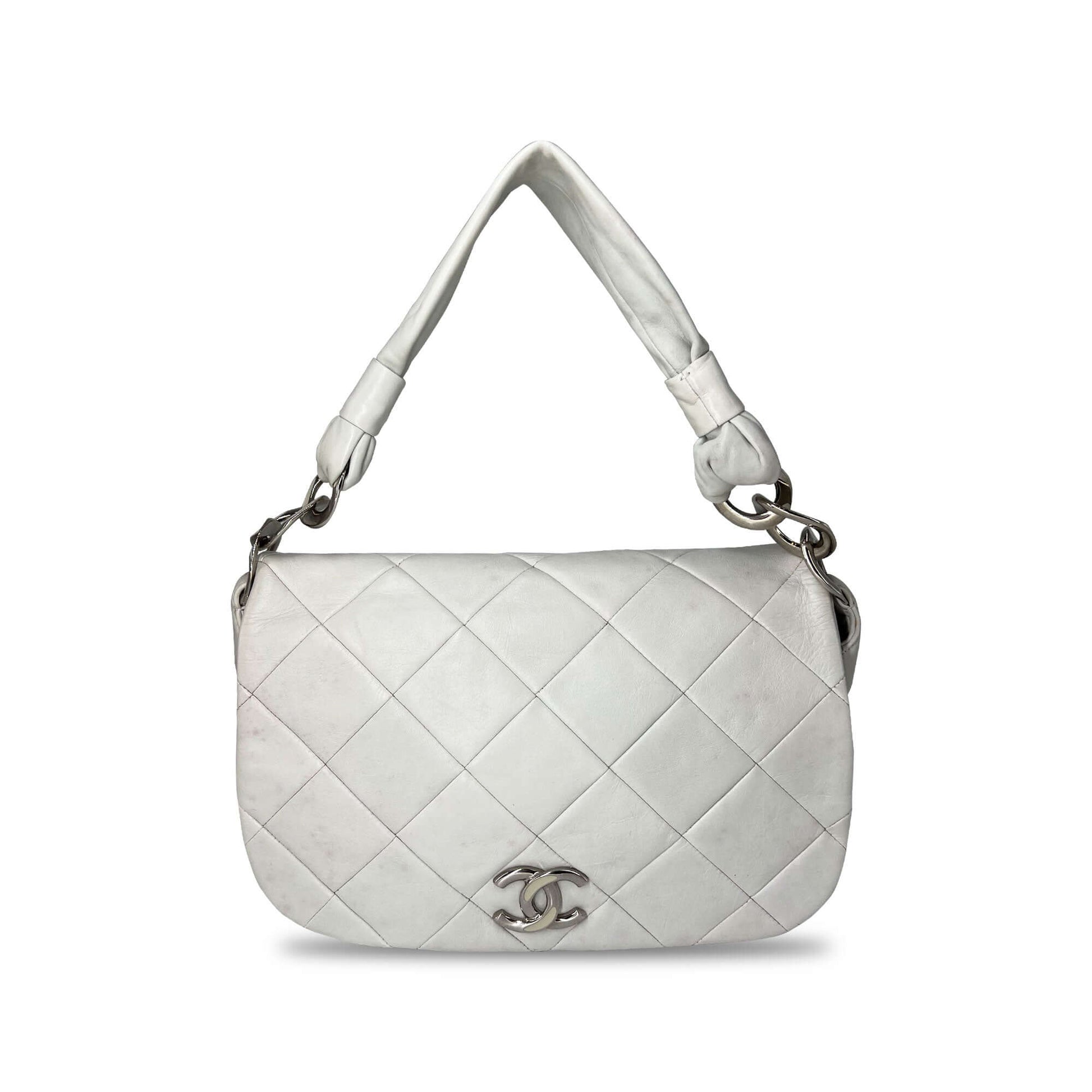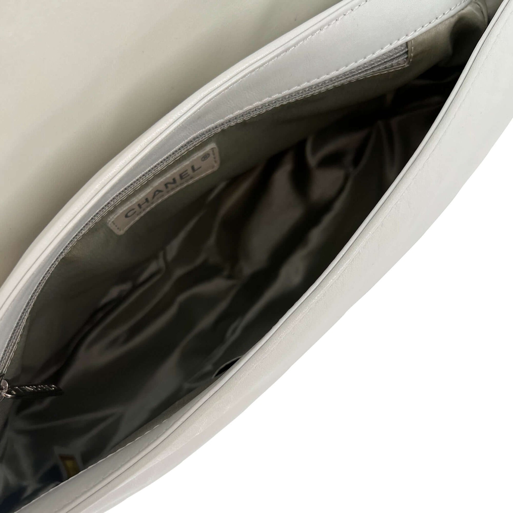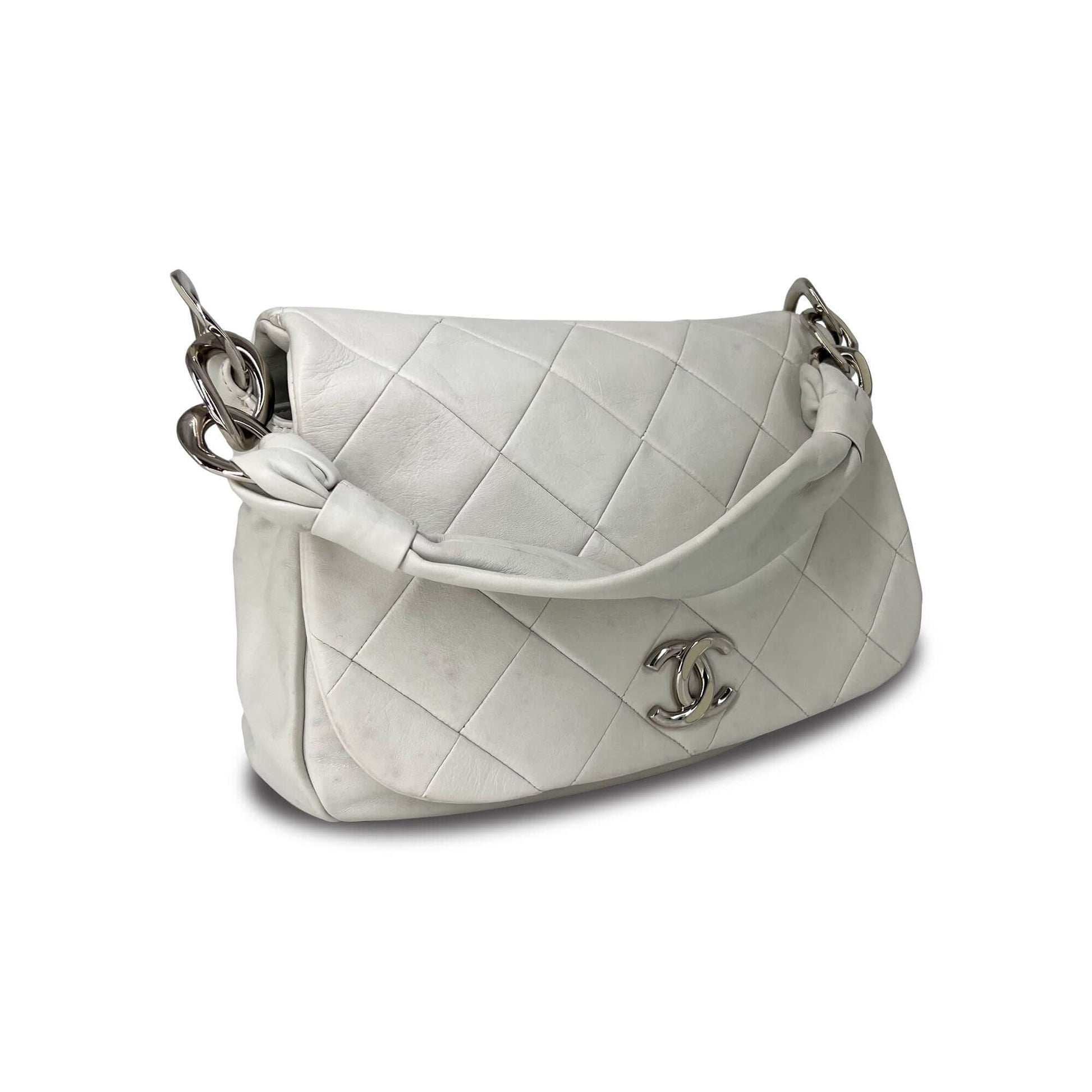 A vintage piece from Chanel in white quilted leather featuring silver tone CC logo on top of the magnetic closure.