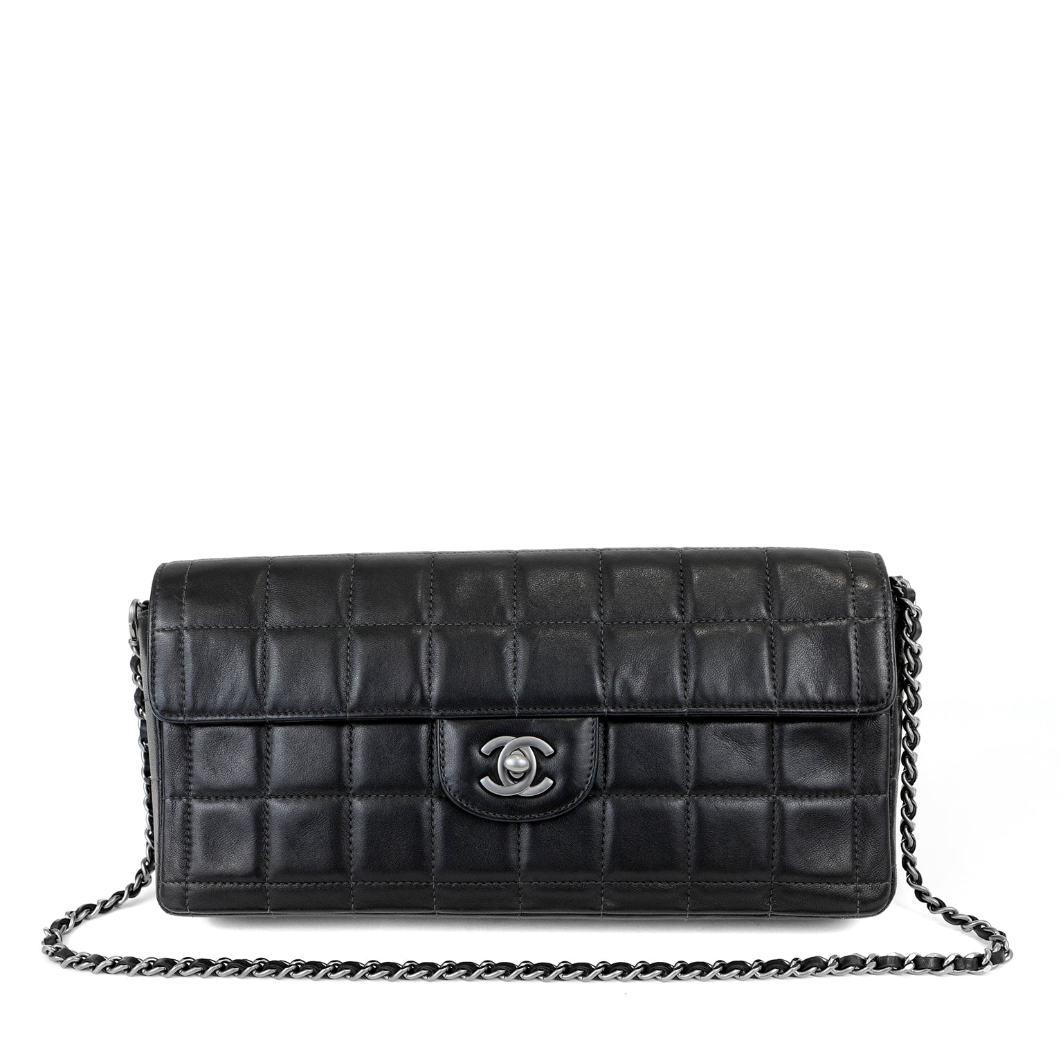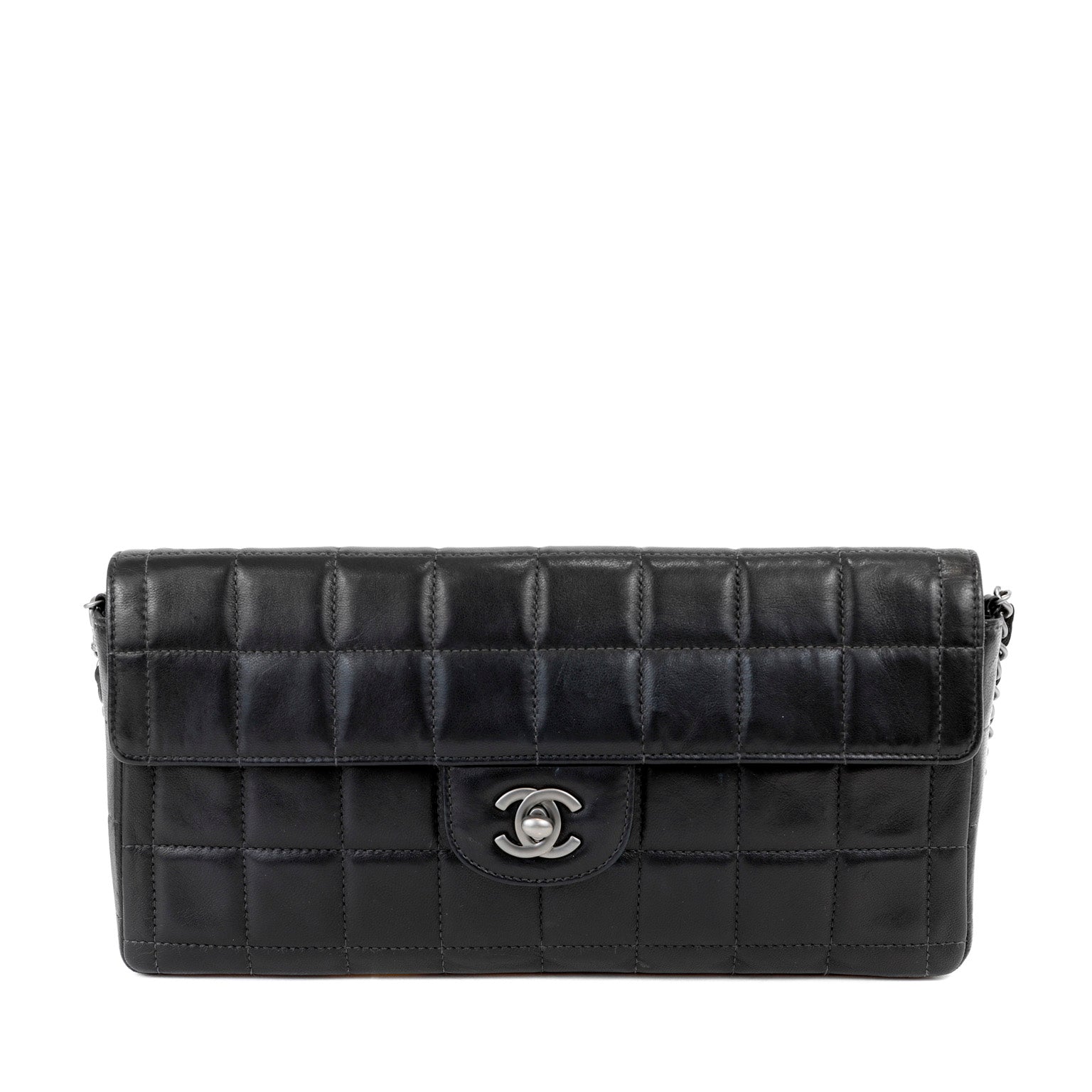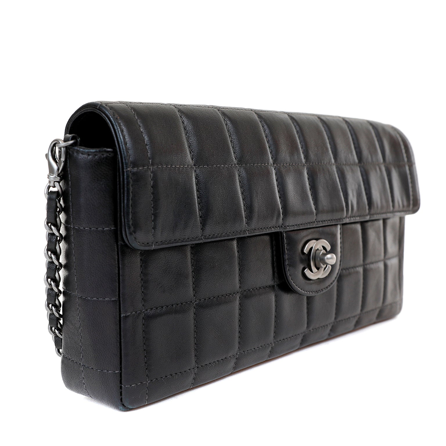This Chanel Black Lambskin Chocolate Bar Quilted East West Classic is in excellent condition. Supple black lambskin is quilted in square pattern with matte silver interlocking CC twist lock closure. Leather and chain entwined single strap. Dust bag included.