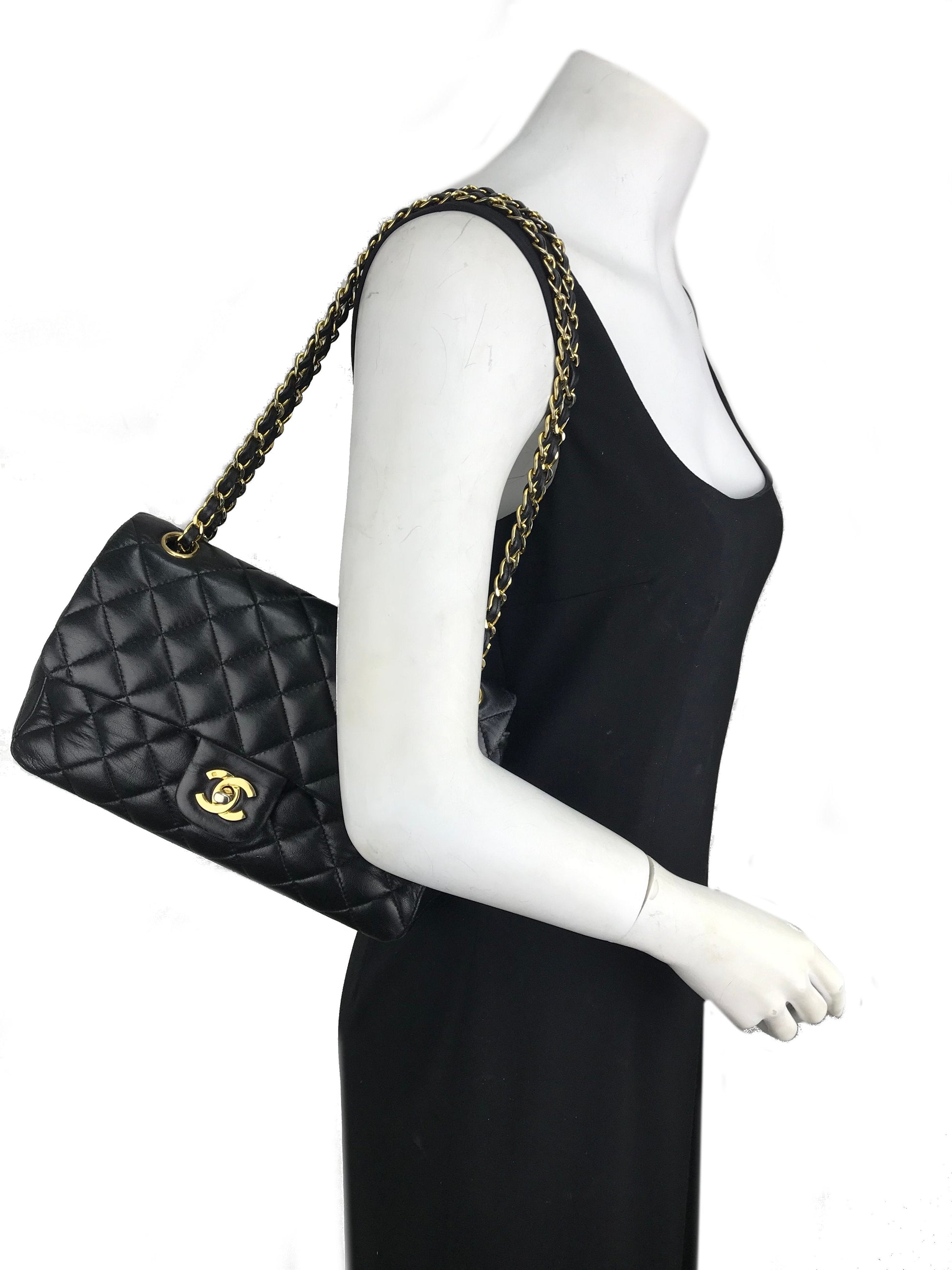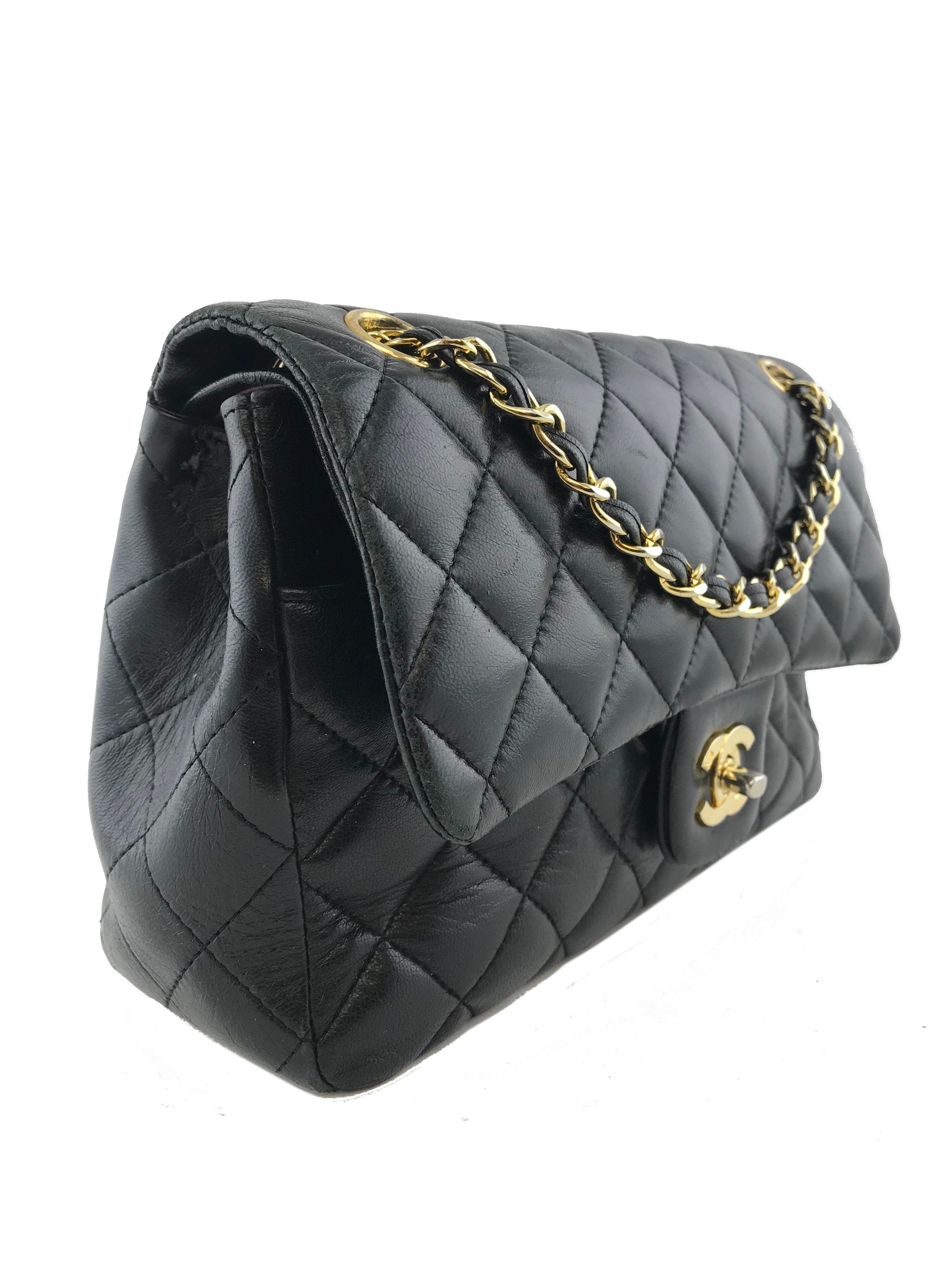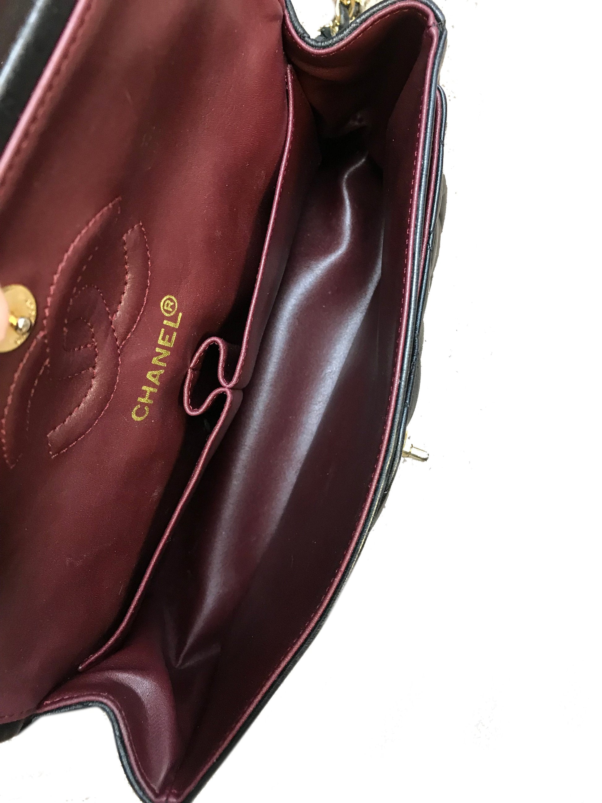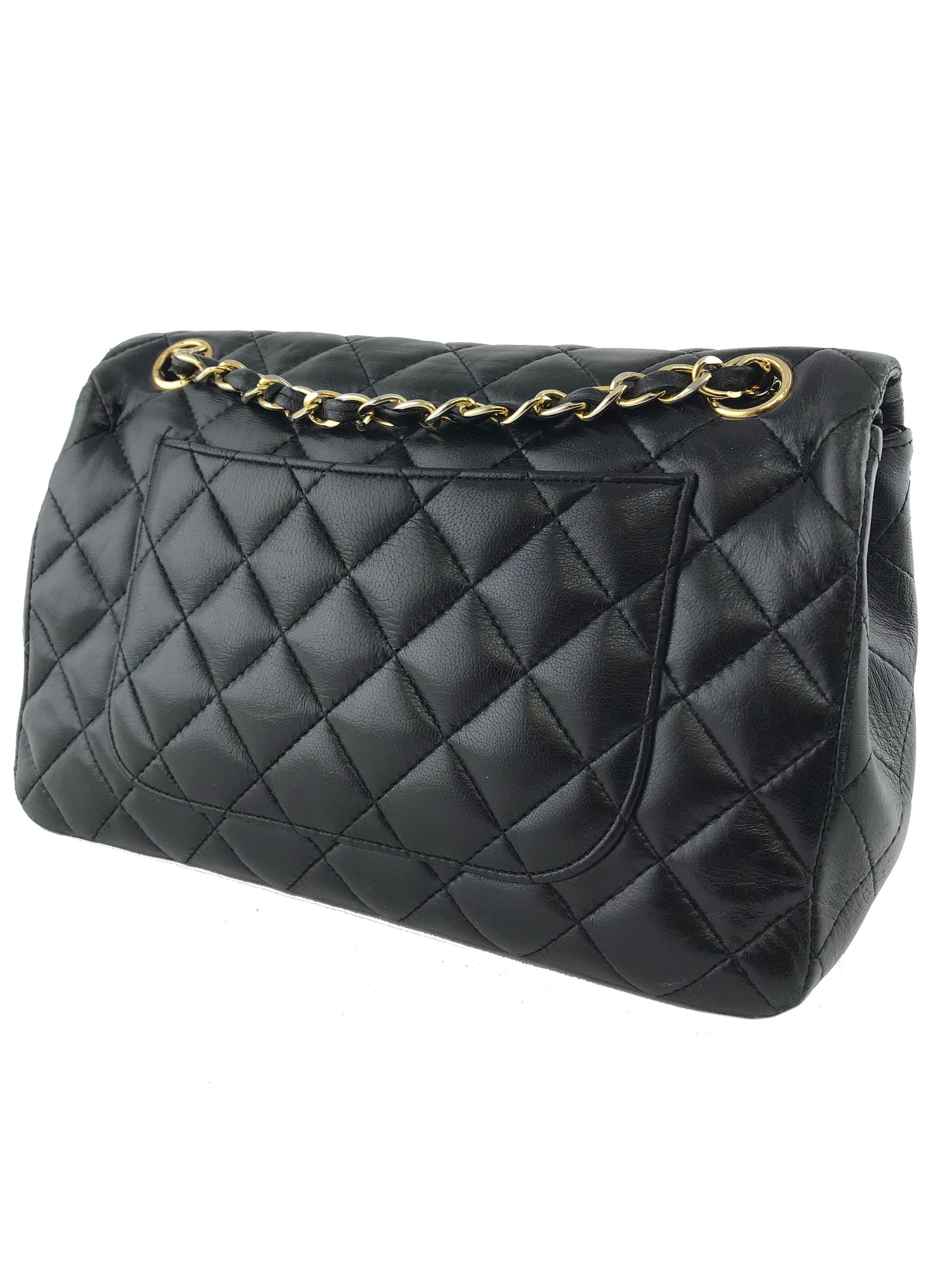 We the ity of this chic and sophisticated vintage Chanel Quilted Lambskin Classic Medium Double Flap Bag crafted from Chanel's signature blackdiamond quilted leather and24k goldplatedhardware. This highly sought after bag features a chain link and leather strap that has the option of being long over the shoulder or doubled.The frontal flap withsignature 'CC' turn-lock closure opens to a burgundy leather interior withpatch pockets.
