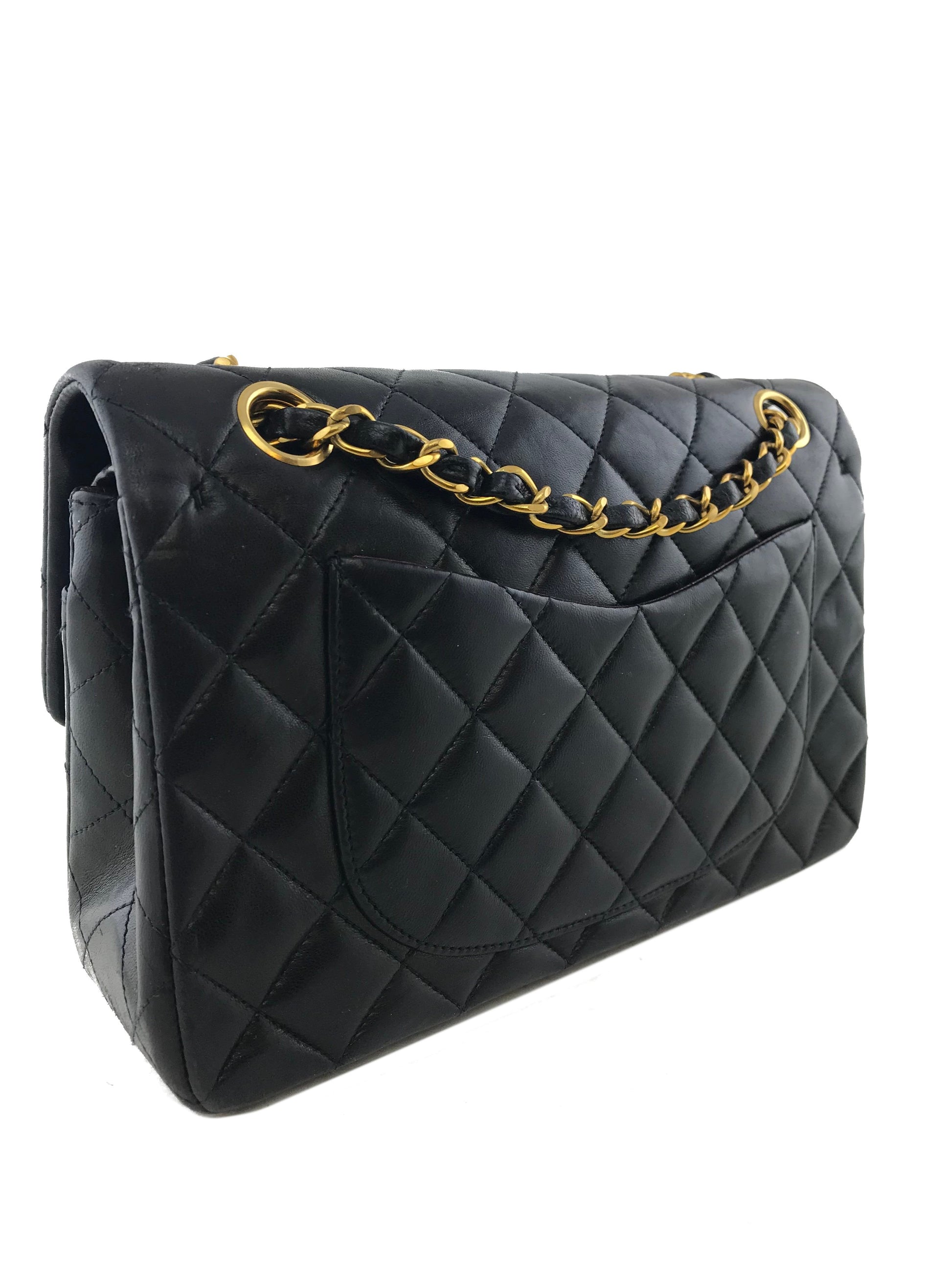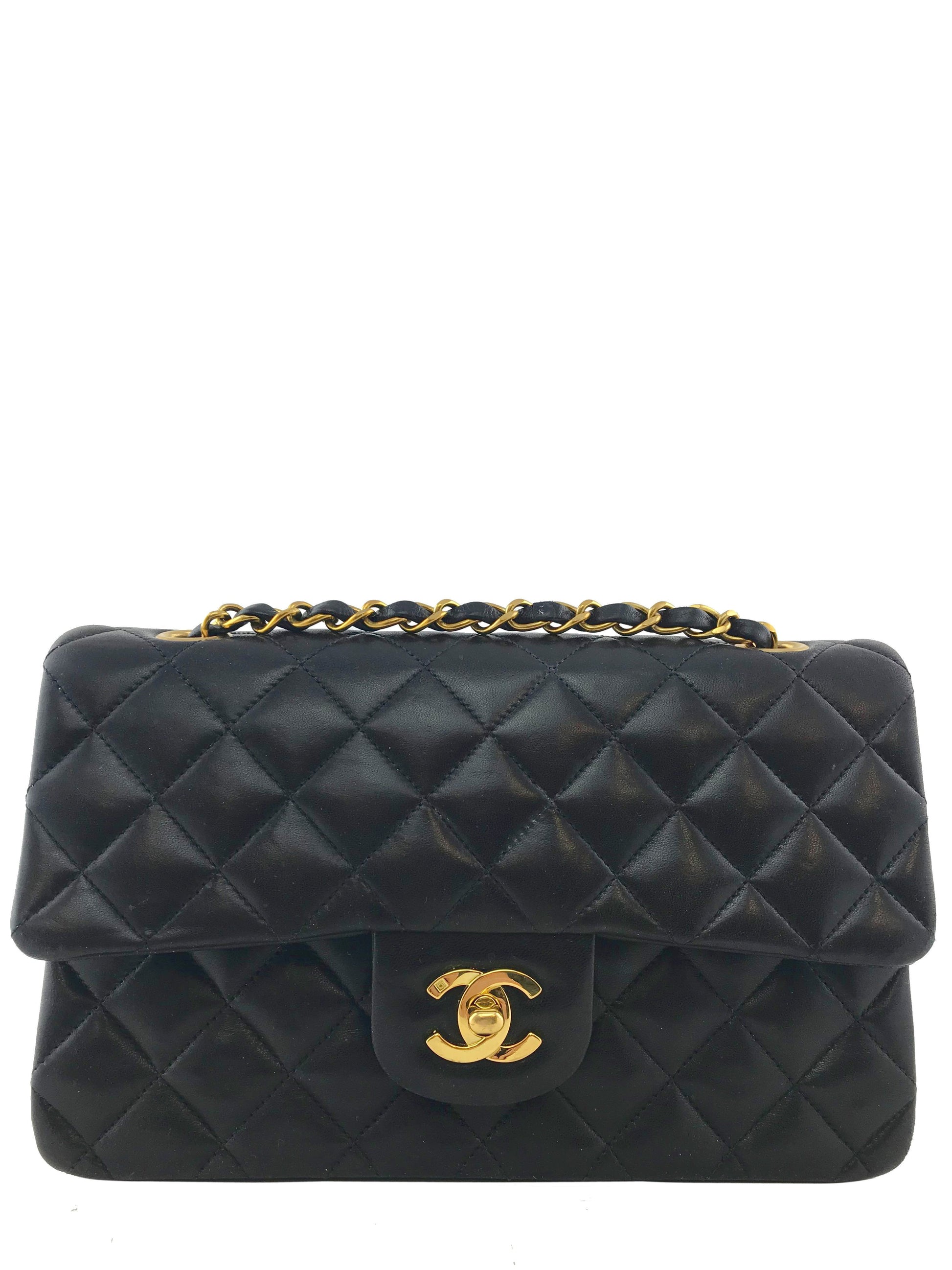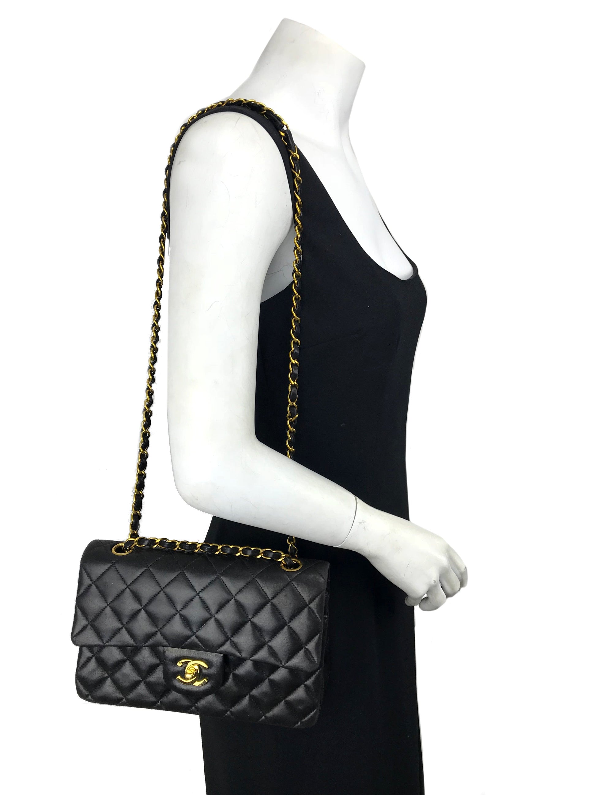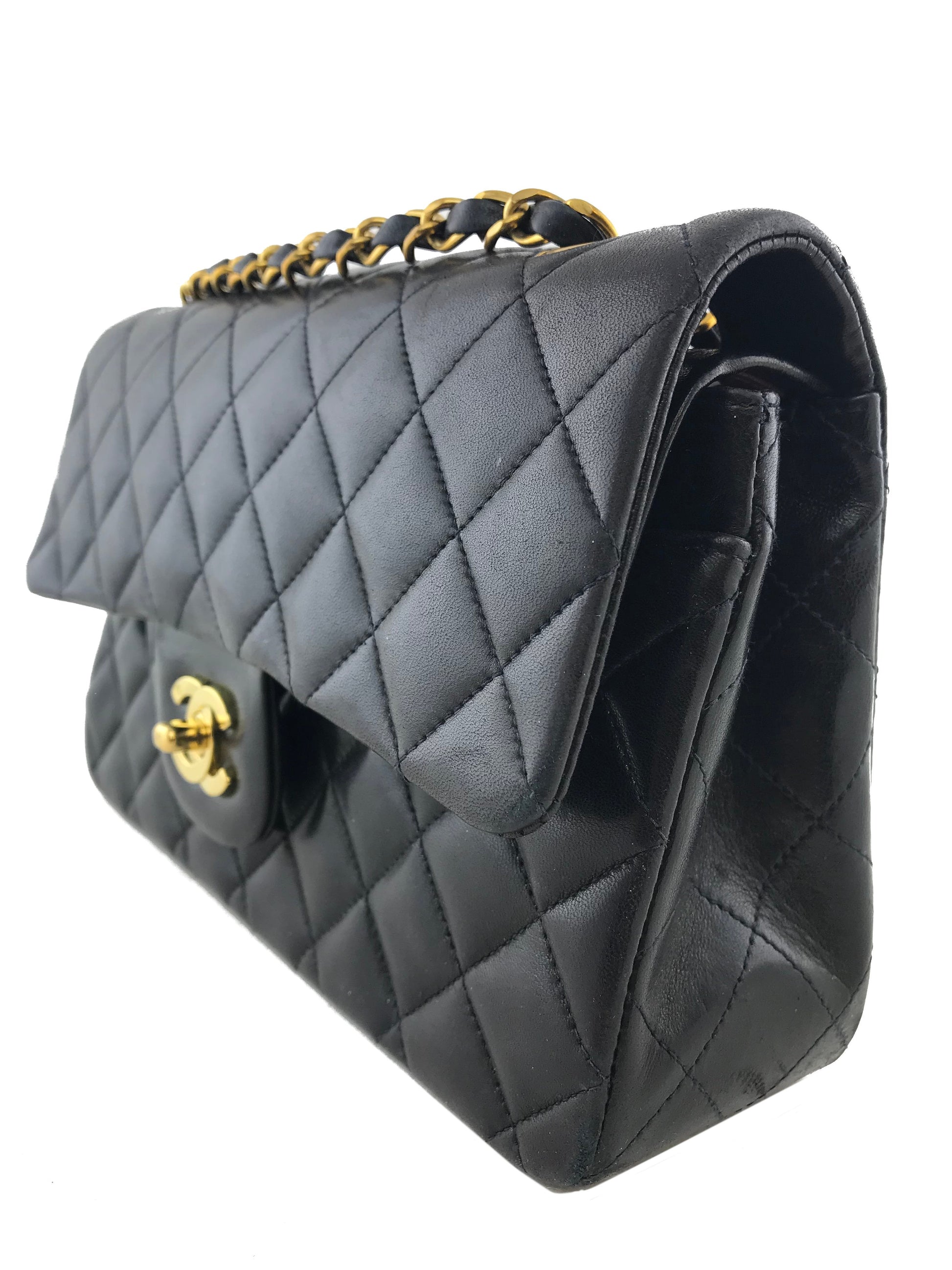 We the ity of this Chanel Quilted Lambskin Small Classic Double Flap Bag crafted in supple black diamond quilted lambskin leather and gold-tone hardware. This iconic bag features a chain link and leather shoulder strap that can be long or doubled, an exterior rear pocket and a double front flap with signature CC turn lock closure.