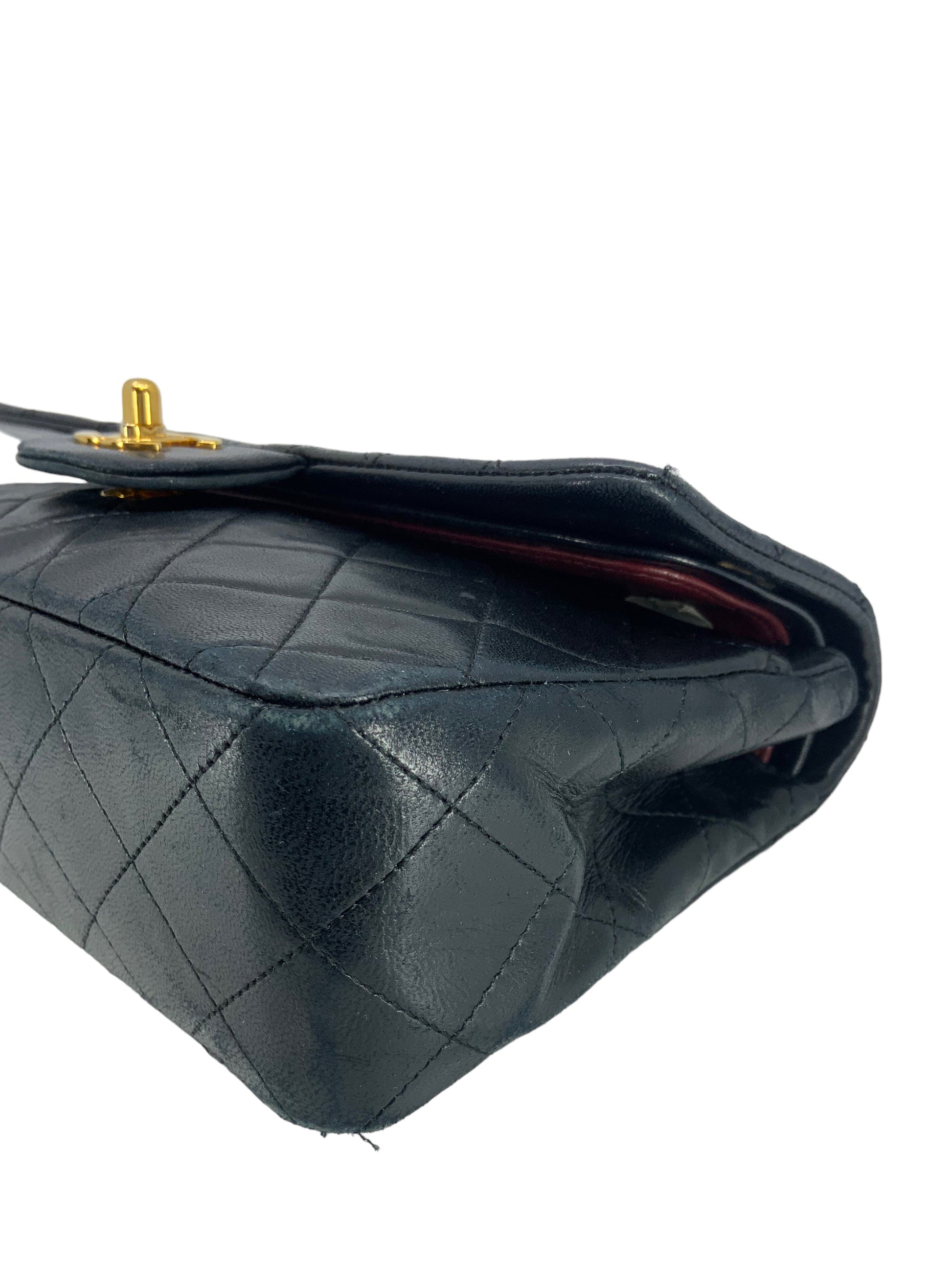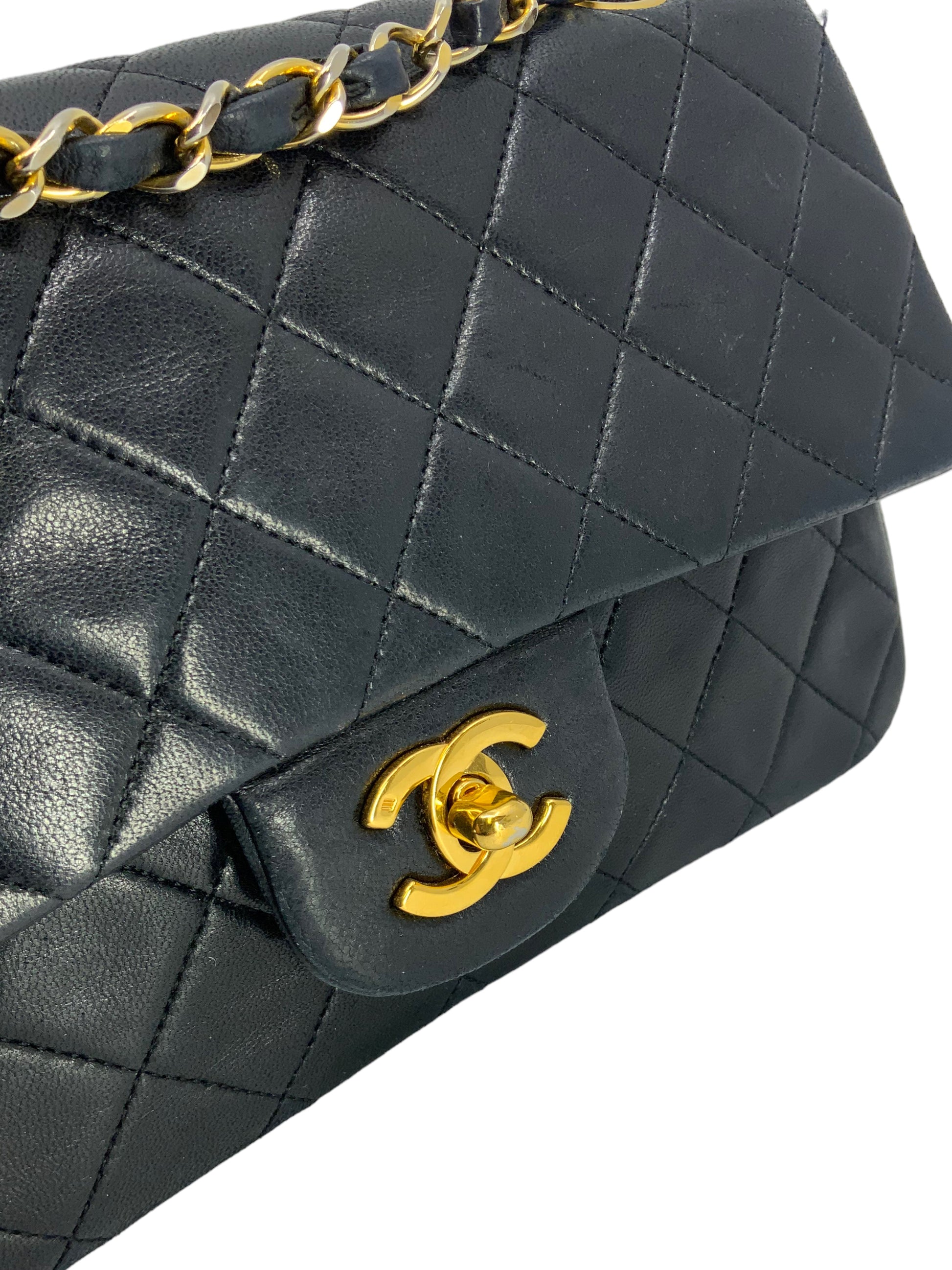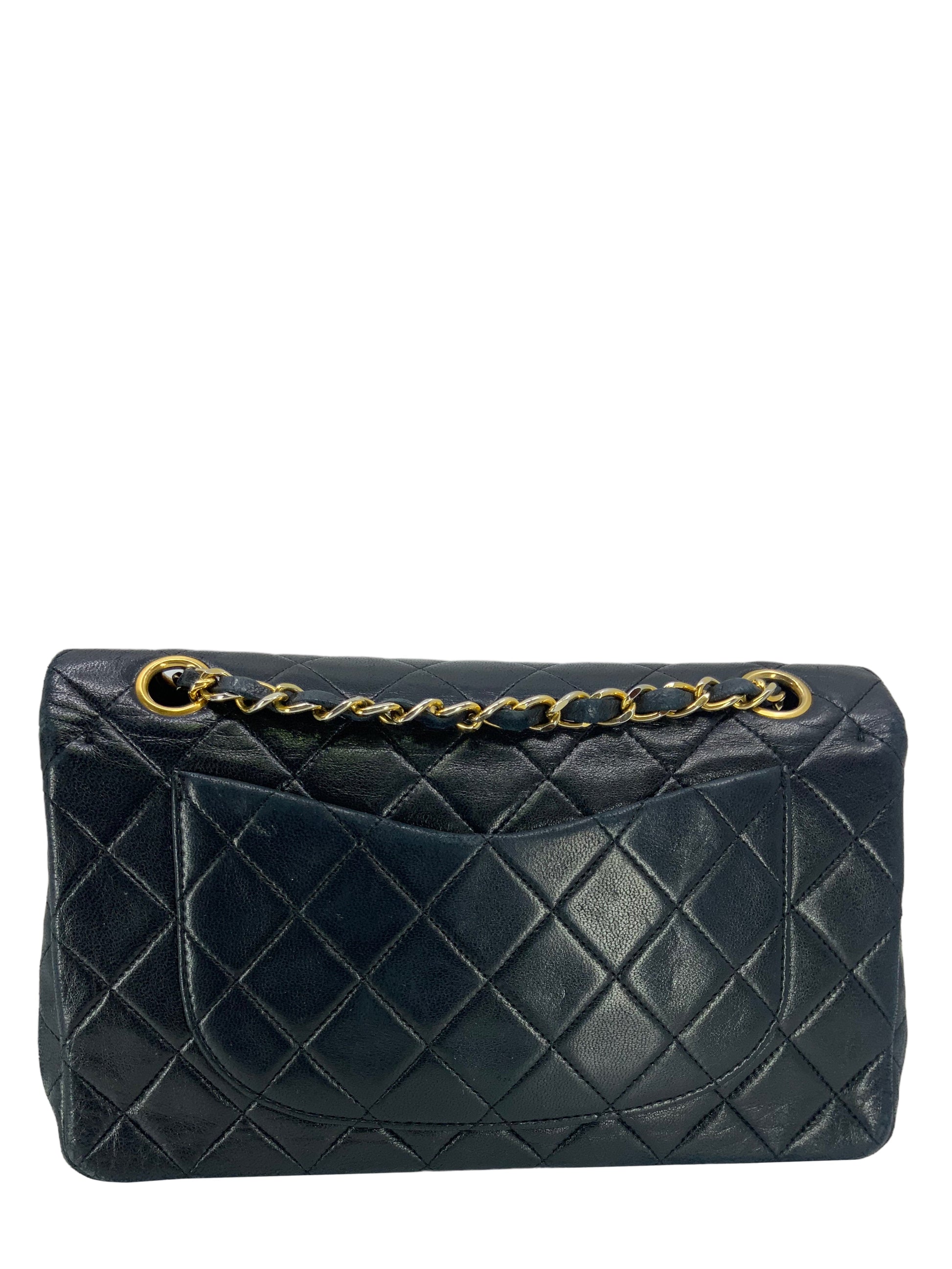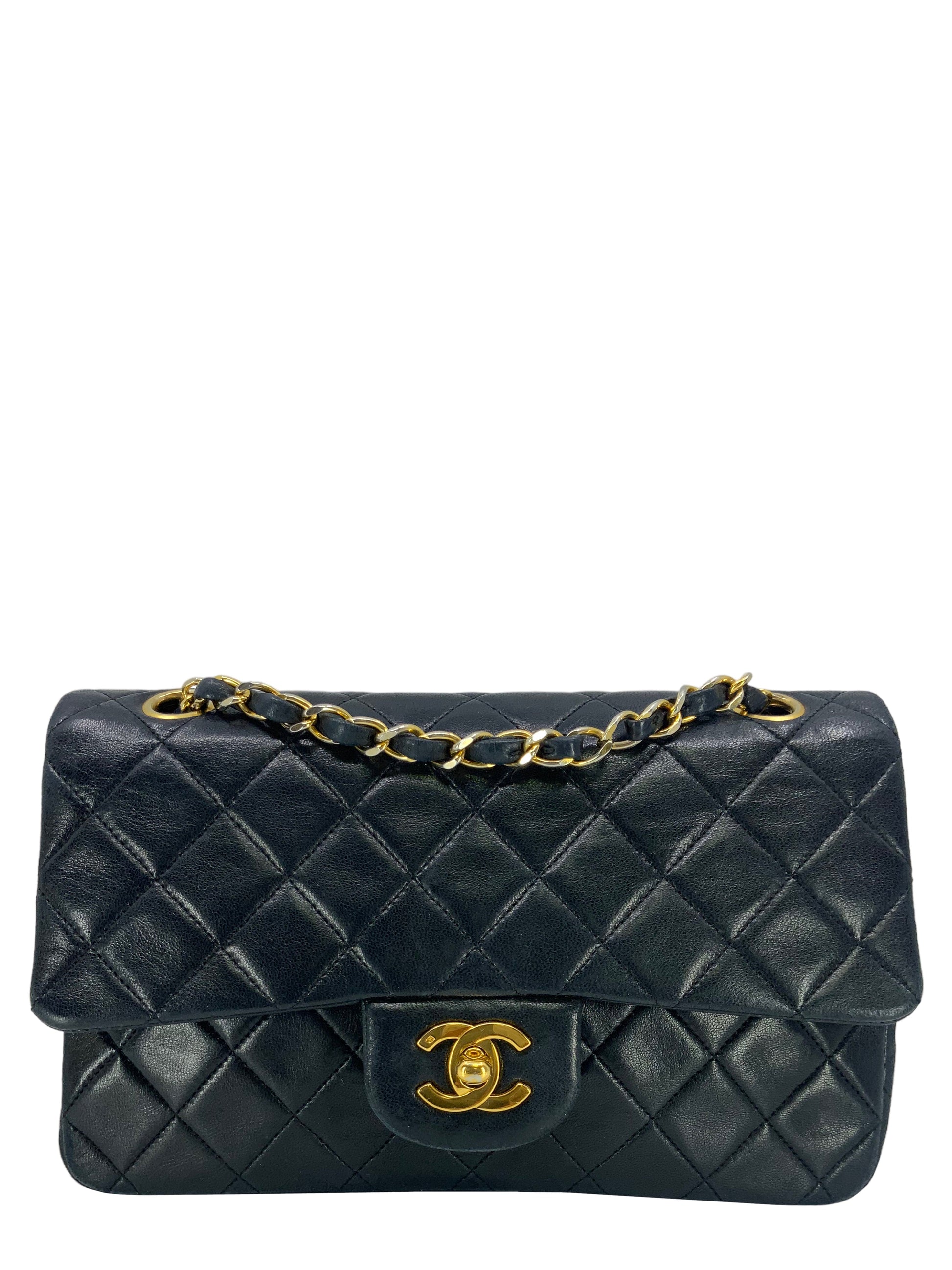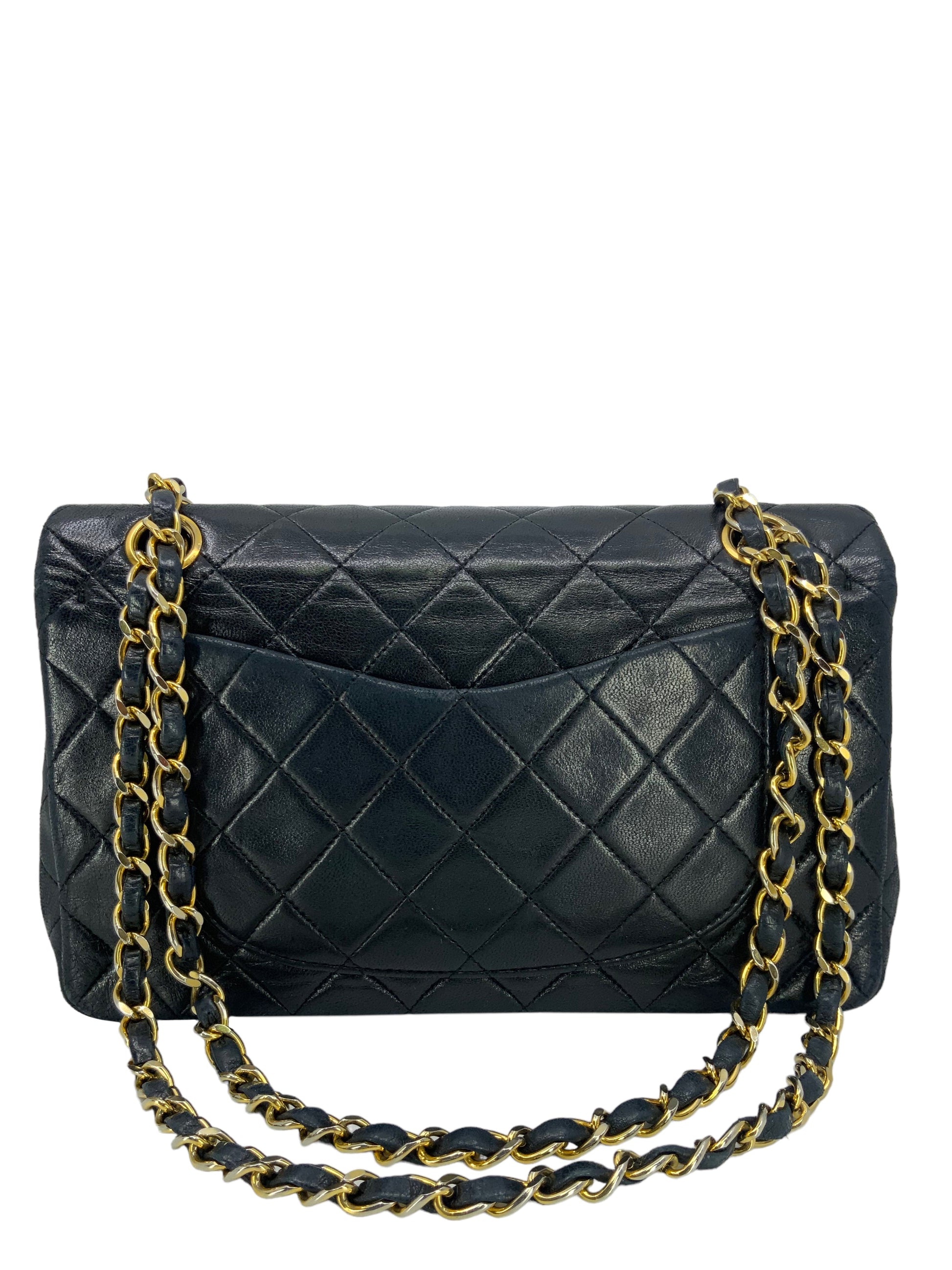 We the ity of this Chanel Quilted Lambskin Small Classic Double Flap Bag crafted in supple dark navy bluediamond quilted lambskin leather and gold-tone hardware. This iconic bag features a chain link and leather shoulder strap that can be long or doubled, an exterior rear pocket and a double front flap with signature CC turn lock closure.