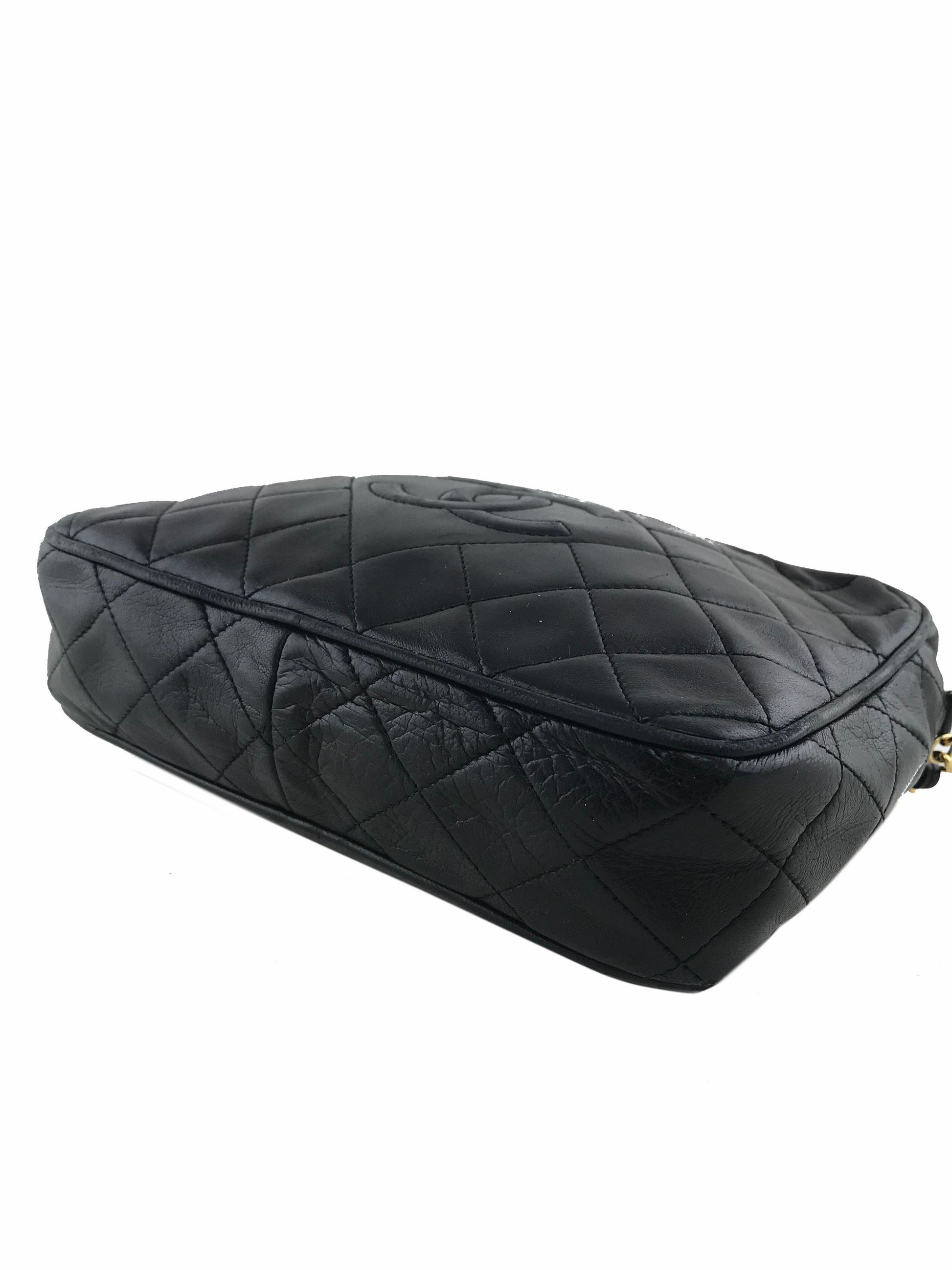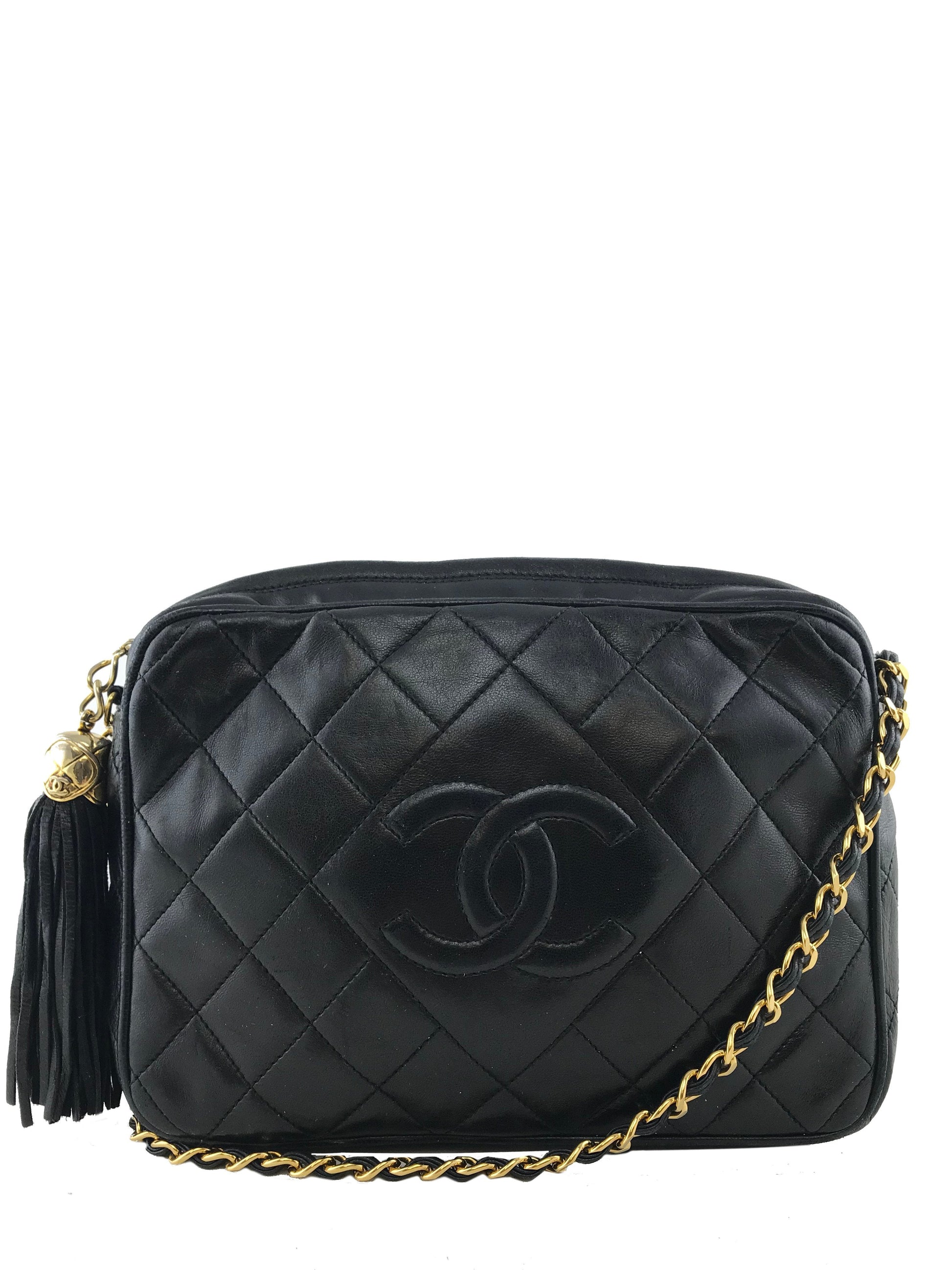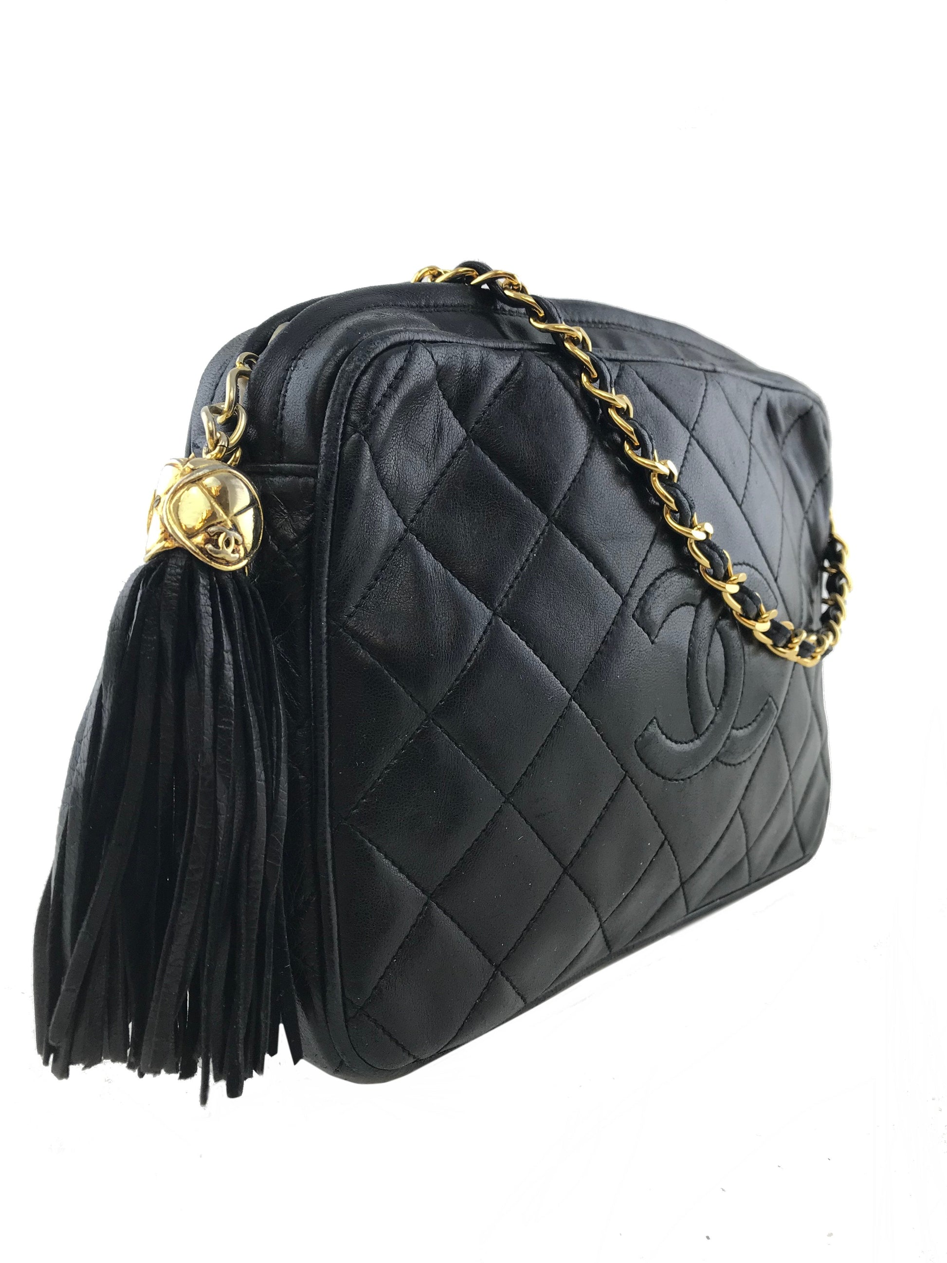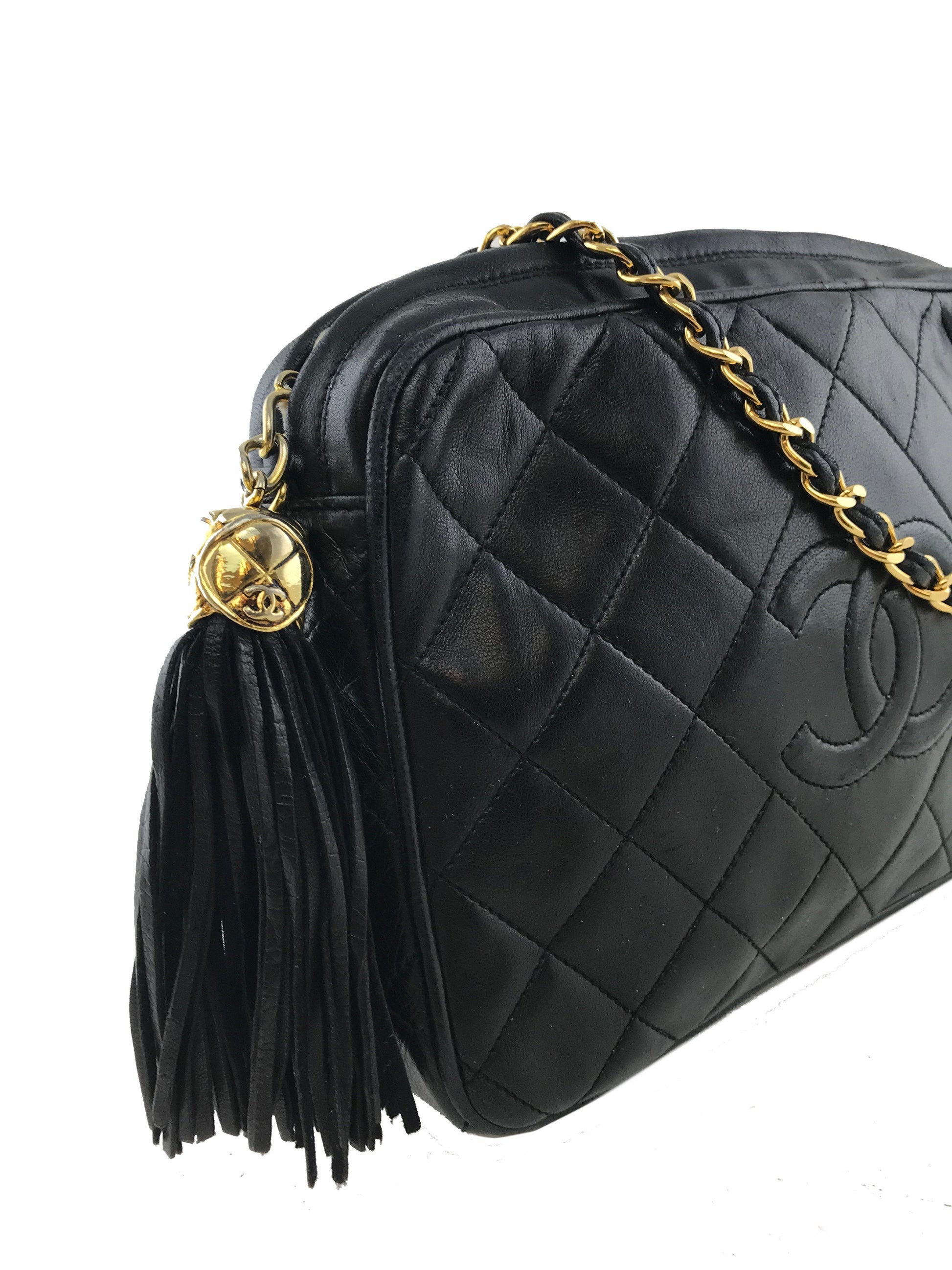 We the ity of this iconic Chanel Quilted Lambskin Tassel Camera Case Bag crafted fromsoft blackdiamond quilted lambskin leather with a signature embossed CC logo at front. Featuring agold-toneand leather chain link shoulder strap anda tassel zipper closure.The interior is beautifully lined in smooth black leather with a singlezipper pocket.