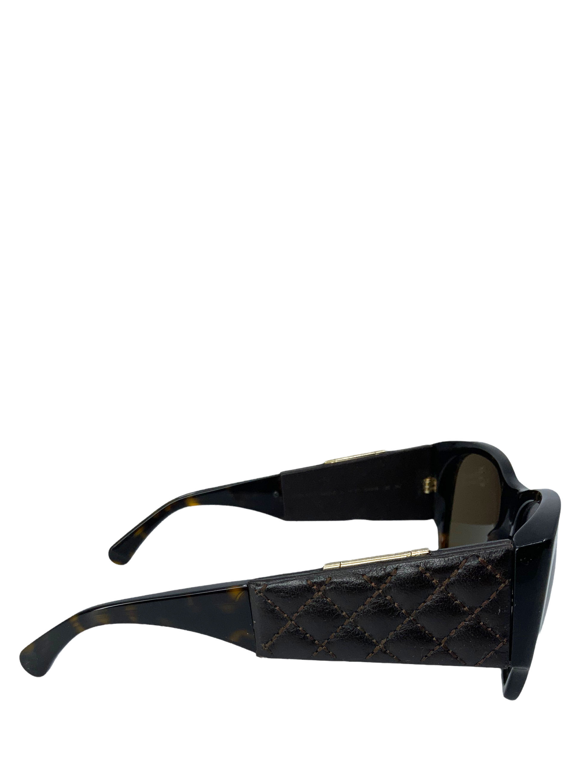 Add to your collection thisd pair of CHANEL Quilted Leather Side Mirror Sunglasses 5202-Q featuringbrownframes and lenses. The wide arms have signature quilted leather that flips open to "CHANEL' logo vanity mirrors on both sides.