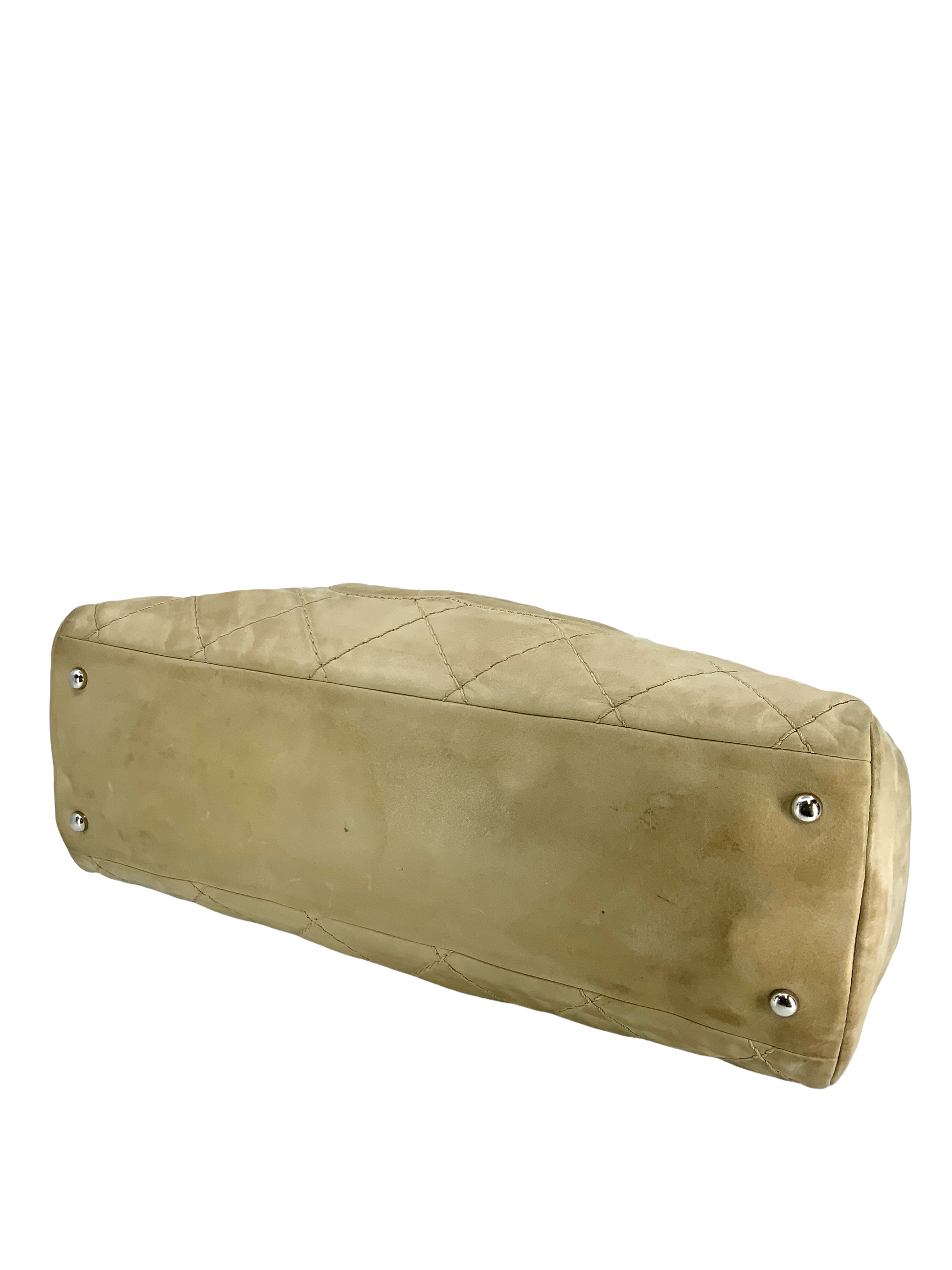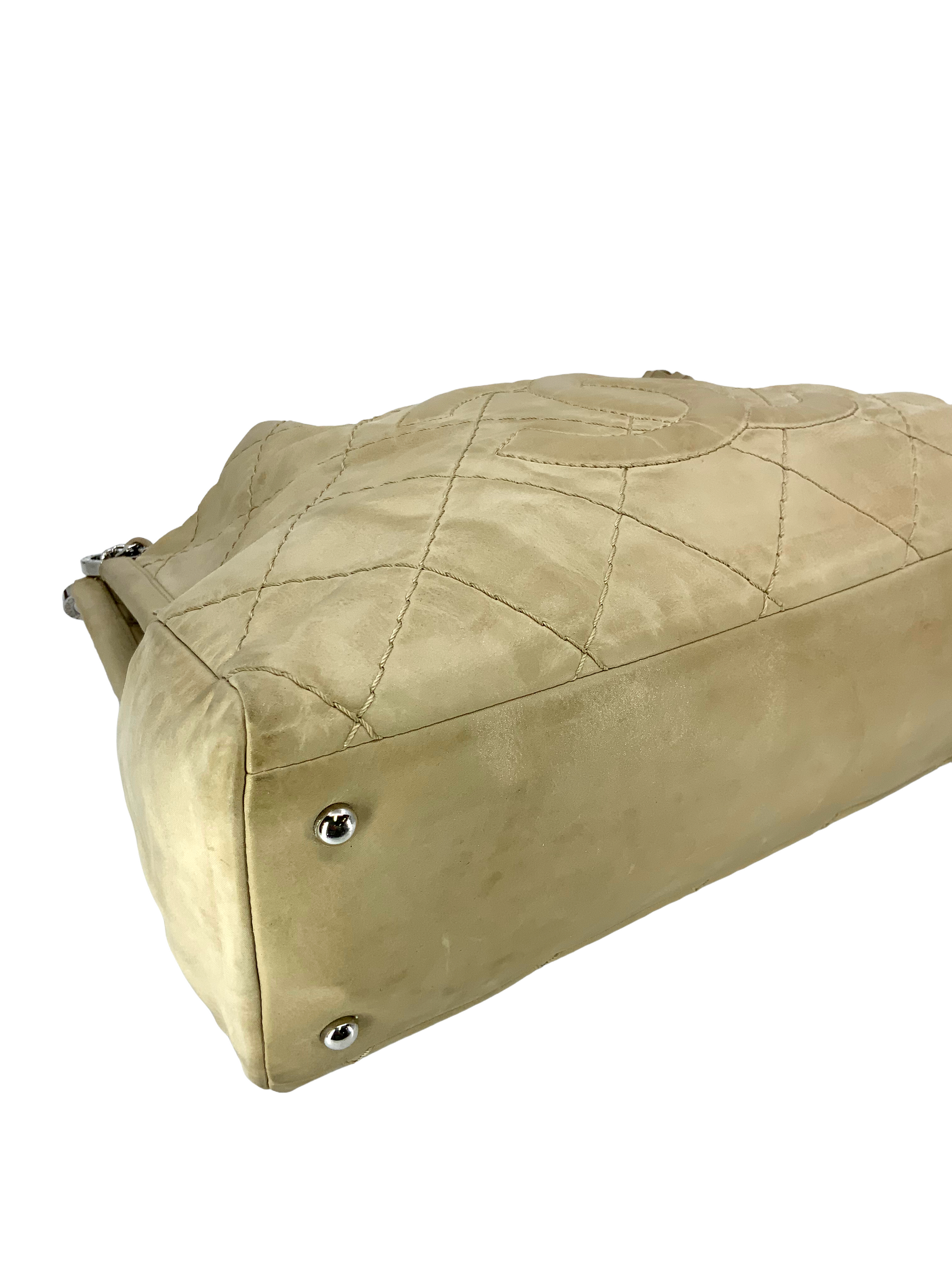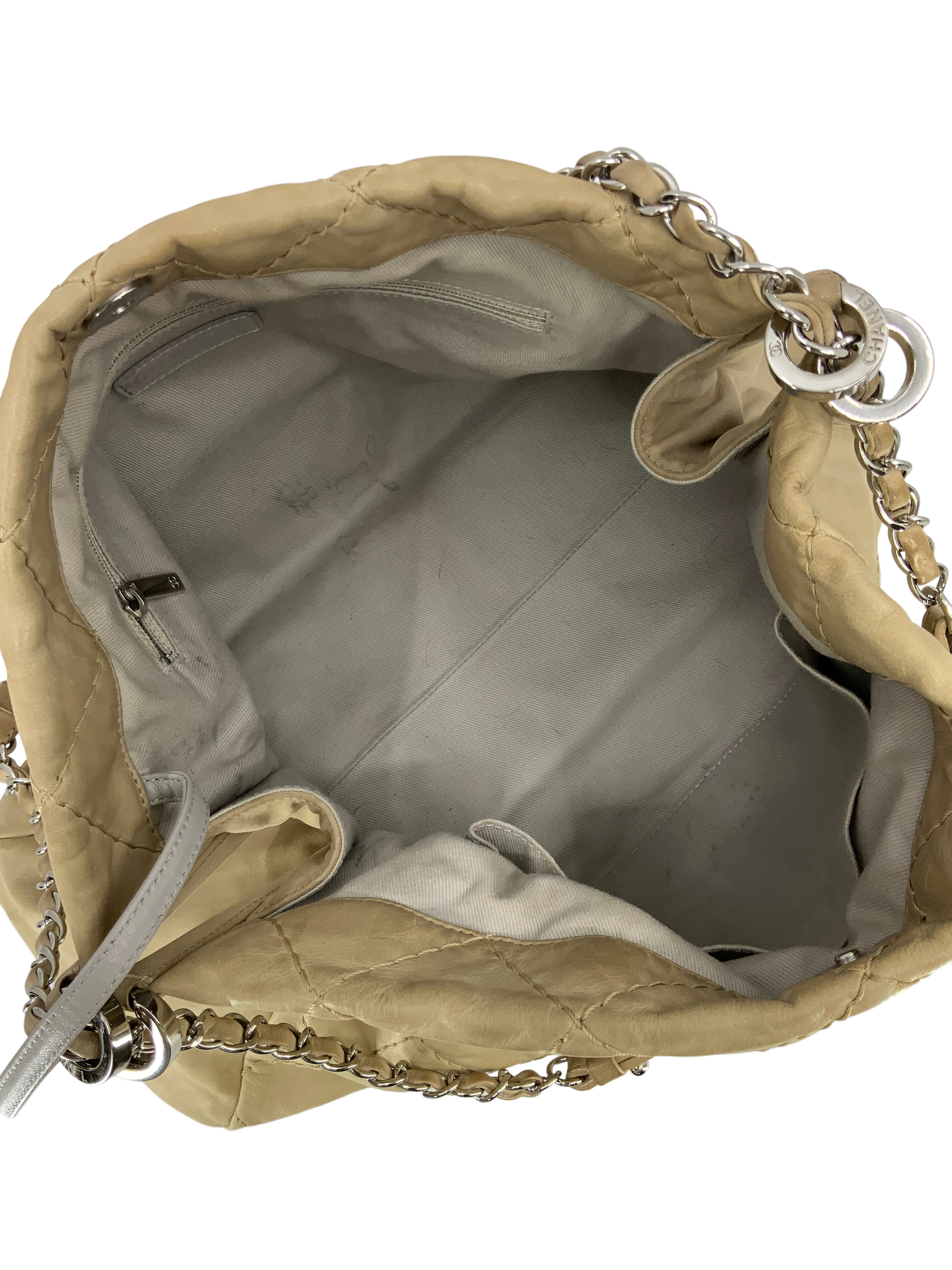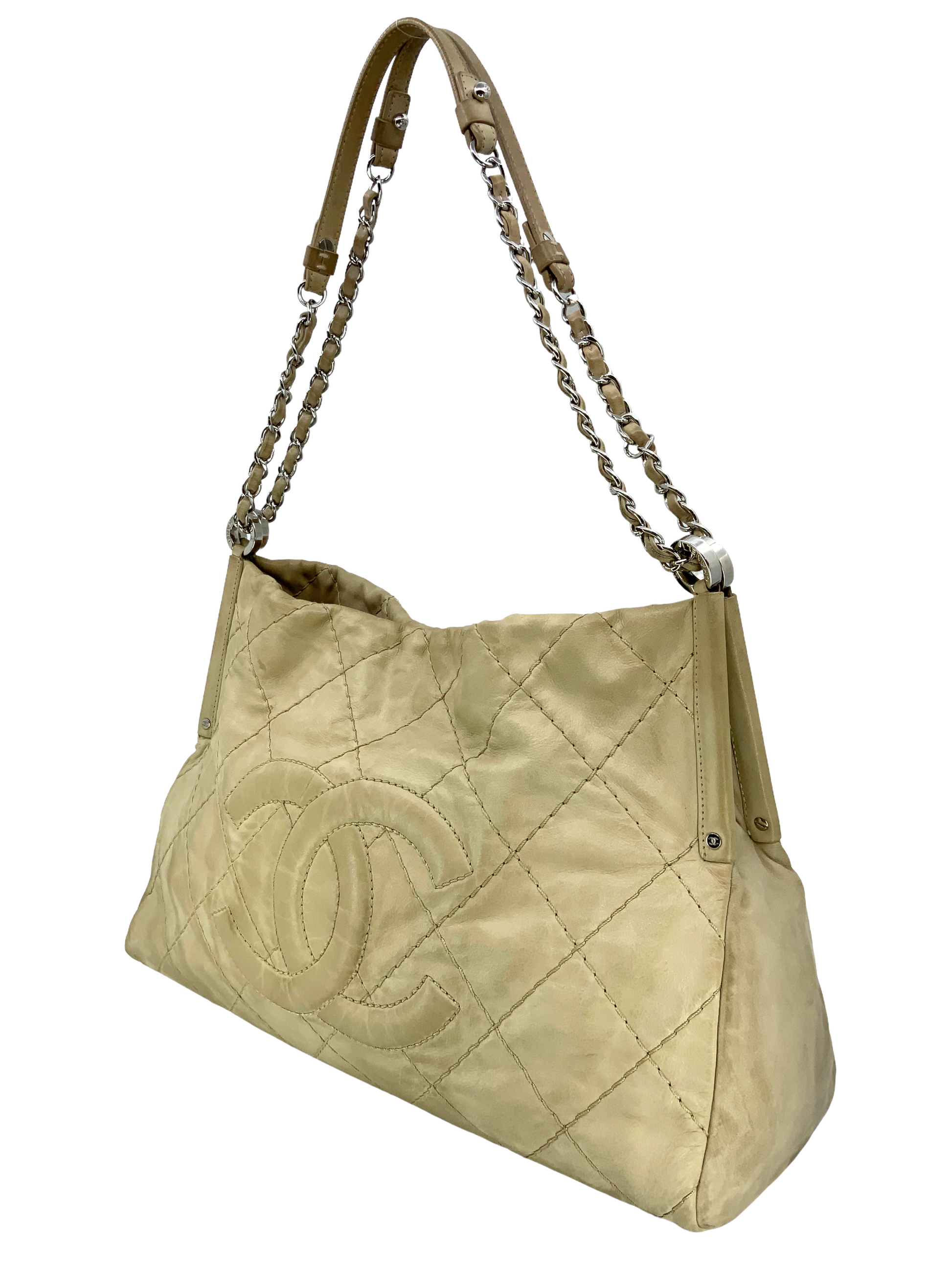 We the ity of this CHANEL Quilted Leather Timeless CC Chain Tote Bag crafted from supple beige quilted leather and silver-tone hardware. This versatile bag features a large embossed 'CC' logo at center, dual chain link shoulder straps threaded with leather that can be long or doubled and an ultra-spacious interior, roomy enough for all your essential belongings.