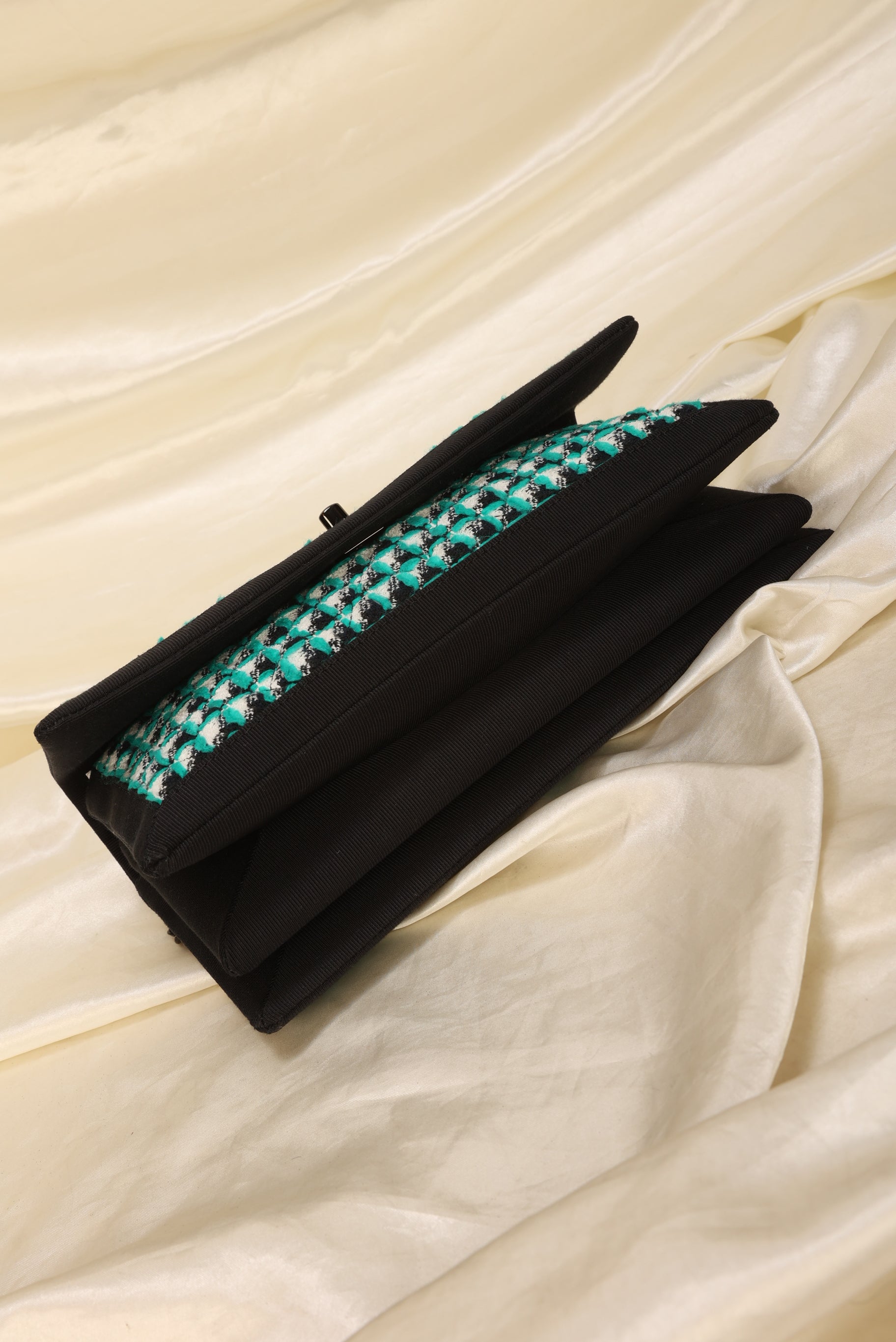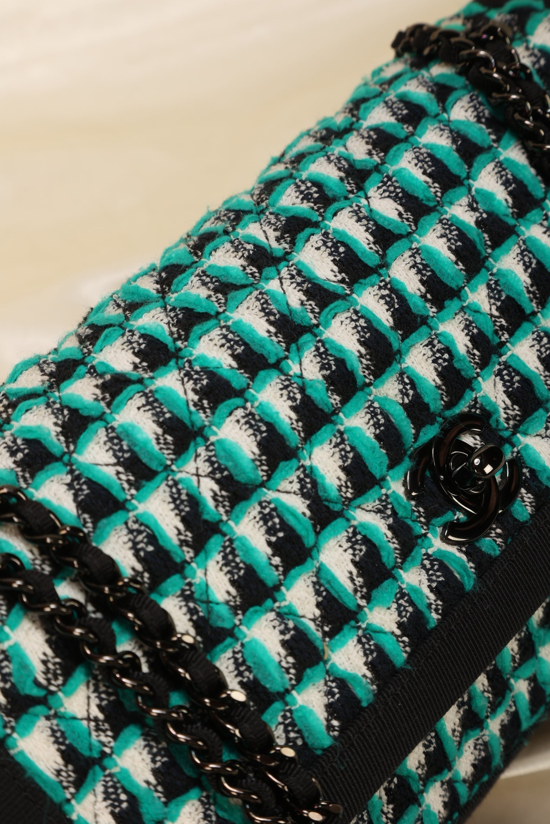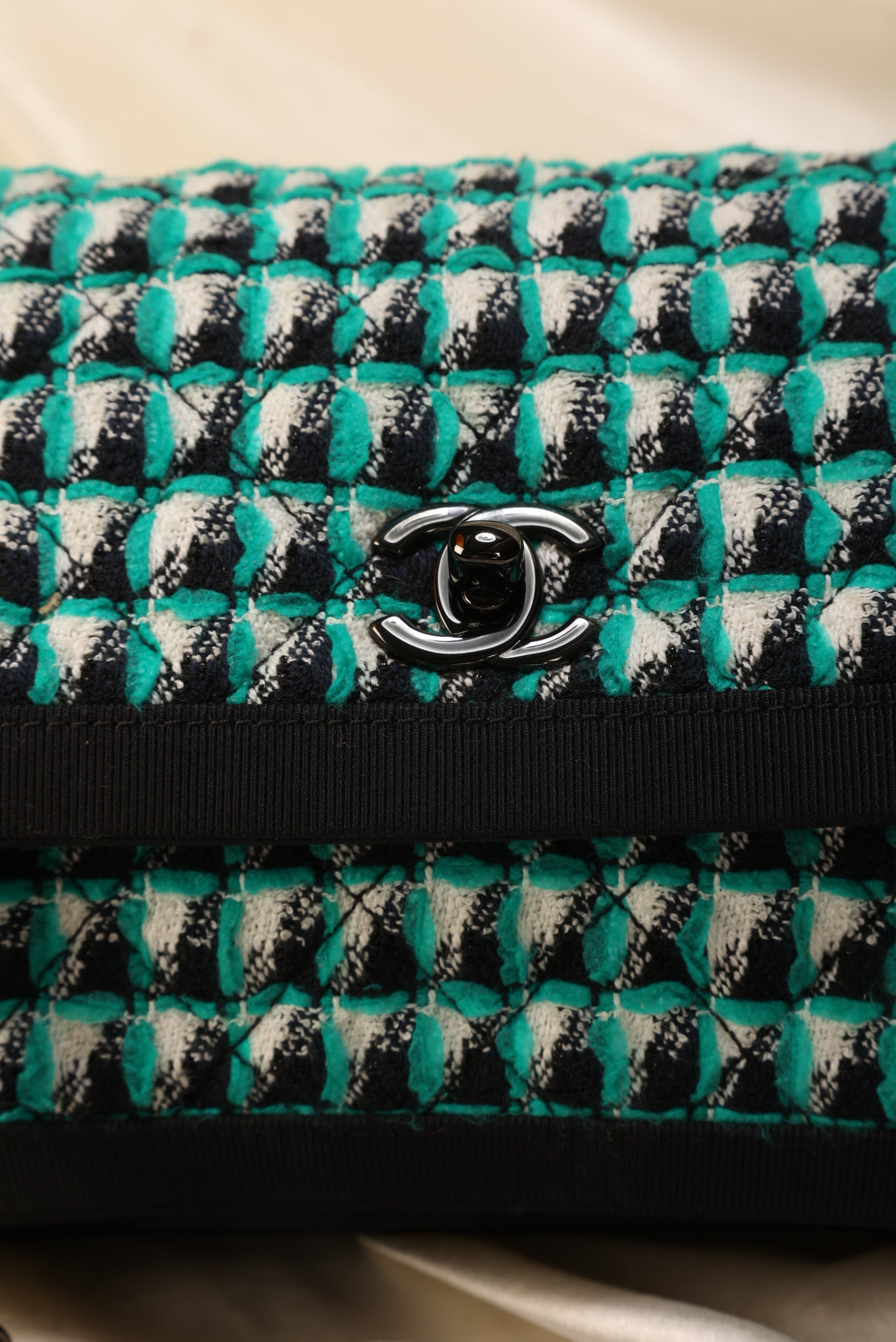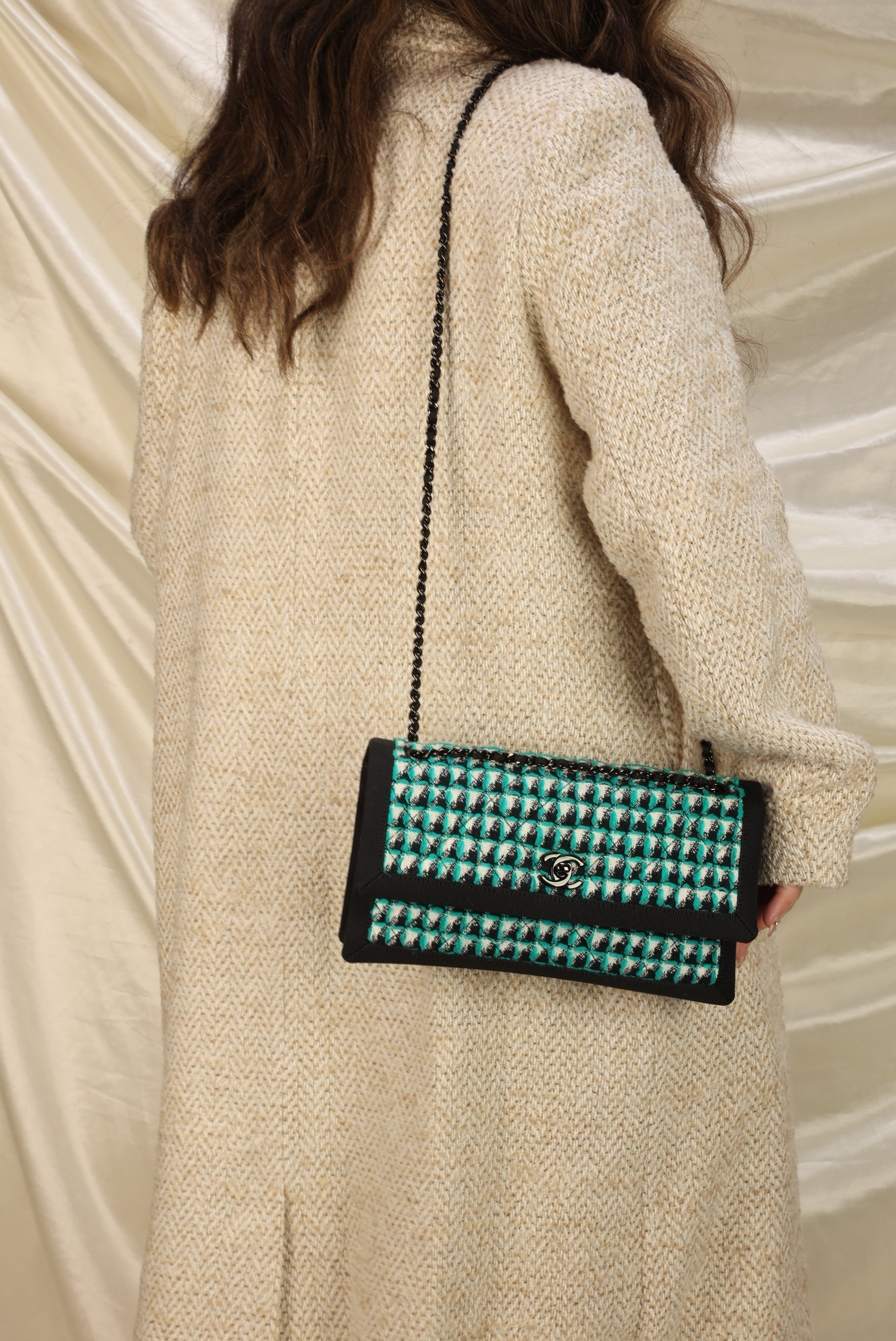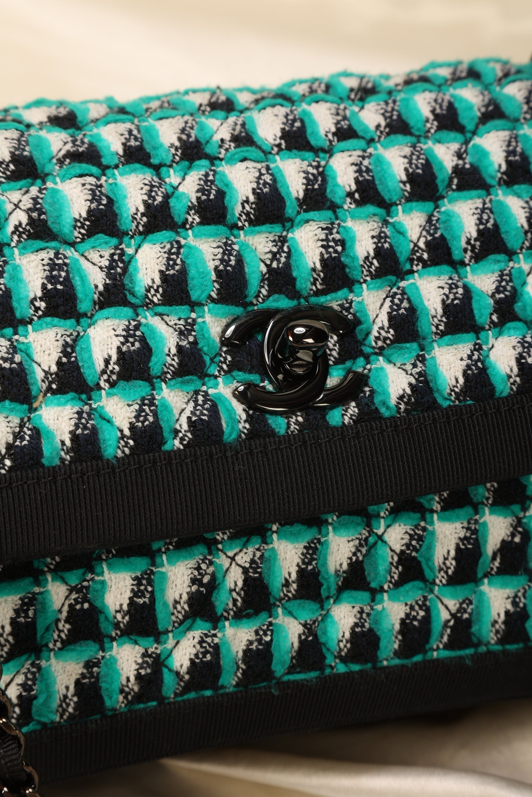Bringing to the shop, is a rare flap bag crafted in Chanel's gorgeous quilted tweed. This bag is crafted with gunmetal hardware on the chain and turnlock, making this an edgy and classic piece. Ribbon trimmed around the edges and through the chain. Vibrant bright teal hue mixed with white and black accents. Can be as both a shoulder bag or crossbody bag.?Only other one online going for 8900!