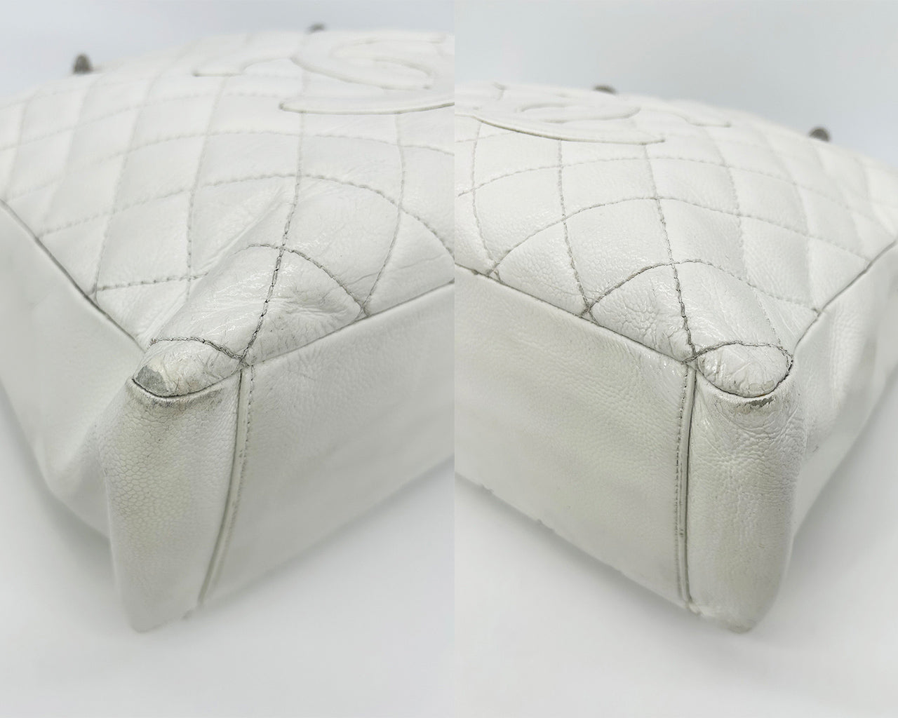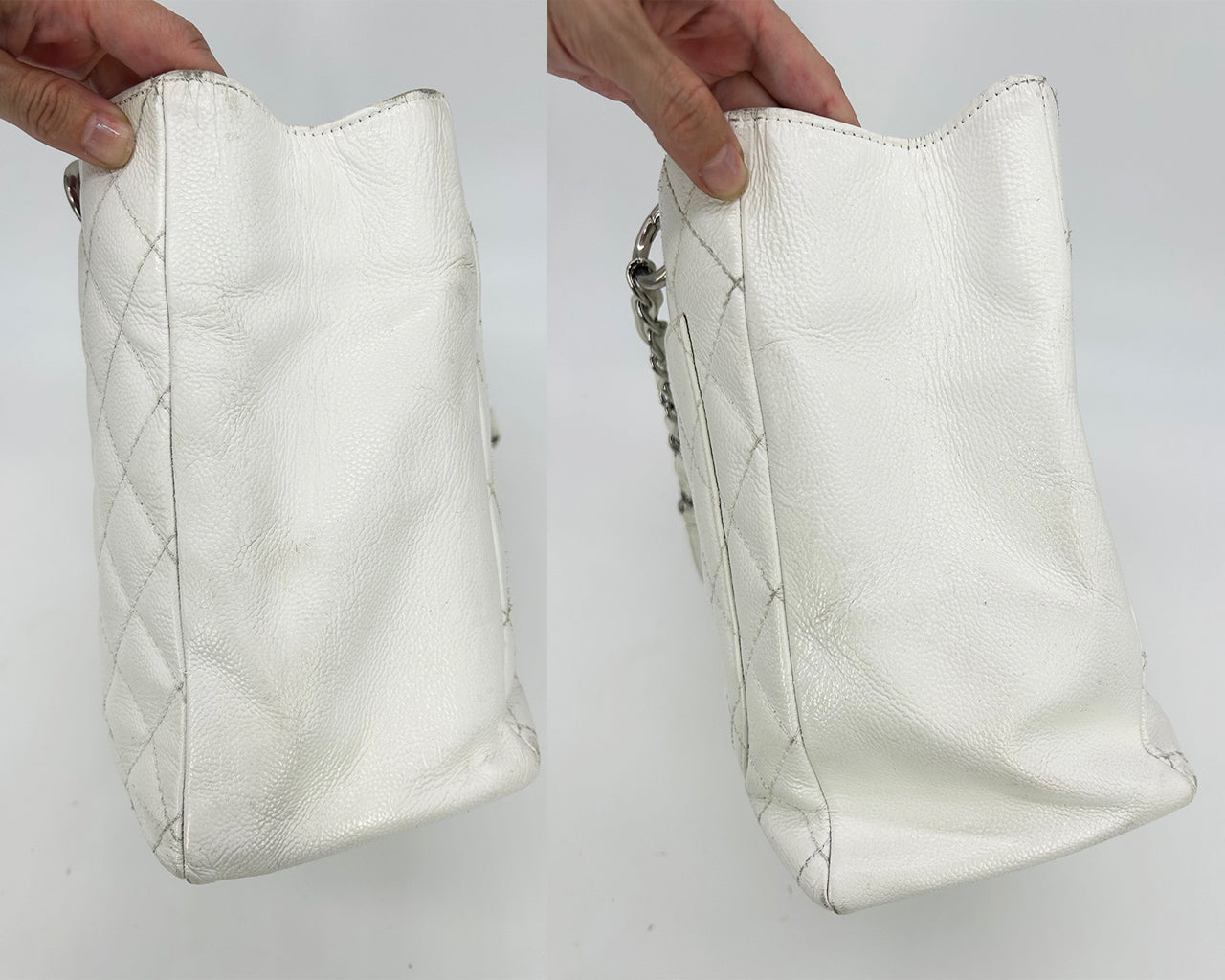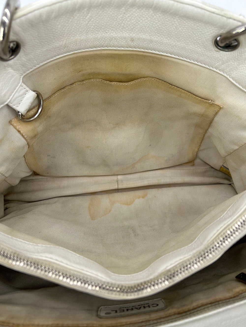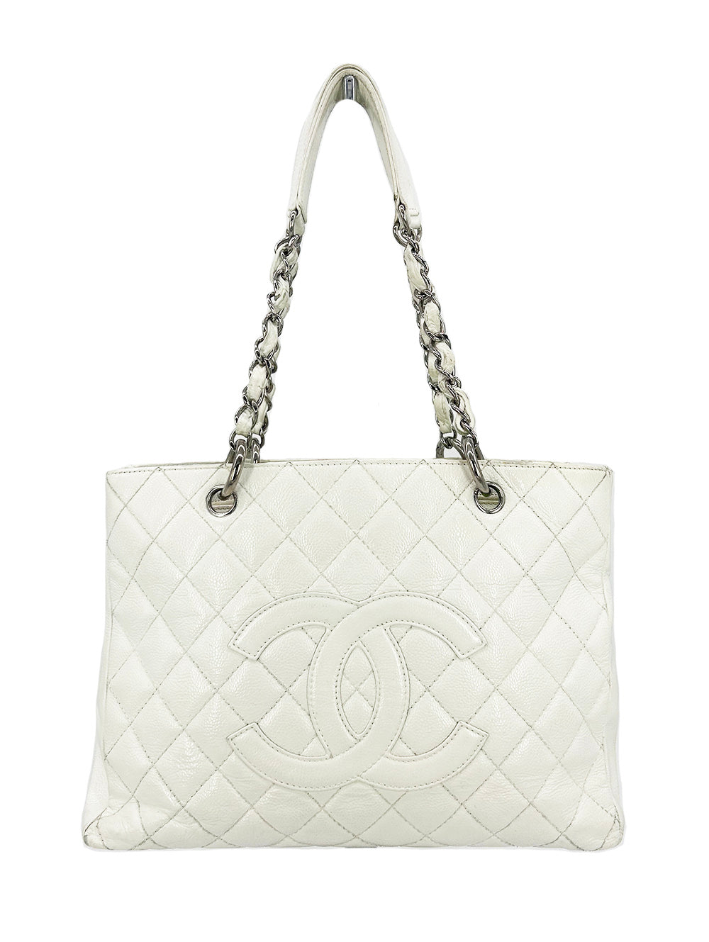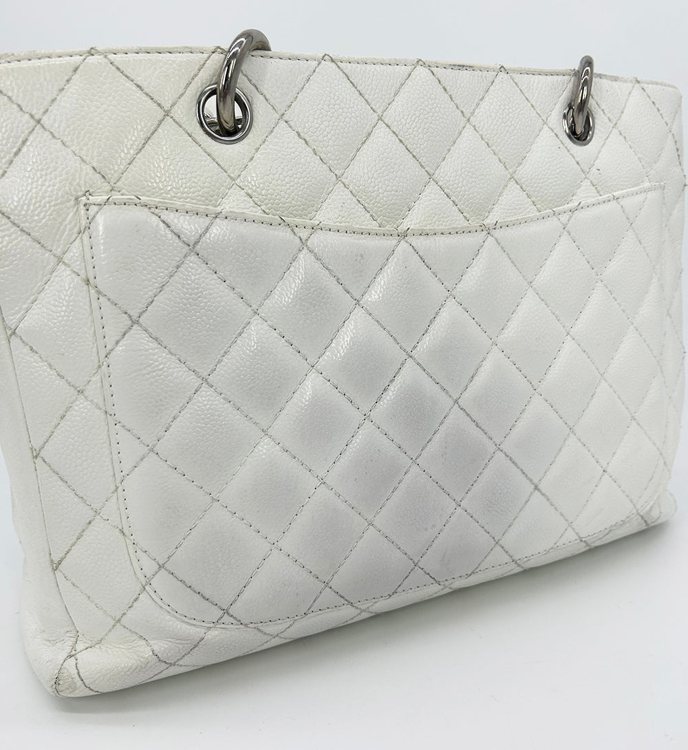 Chanel Quilted White Caviar Grand Shopper Tote in fair condition. Quilted white caviar leather exterior trimmed with silver leather and siganture CC Chanel logo along front side and back slit pocket. Woven chain and leather shoulder strap handle with leather shoulder pad. Cream nylon interior with 2 separate compartments and centered zip pocket. One slit and one zip side pockets. Overall fair condition with signs of use throughout. Wear on 2 bottom corners and top edges. Discoloration on exterior back leather sides, base and handles. Small scratches in leather near back exterior pocket. Stains and discoloration throughout lining. Please see photos of details. Measurements: 13"x10"x5" 10" strap drop