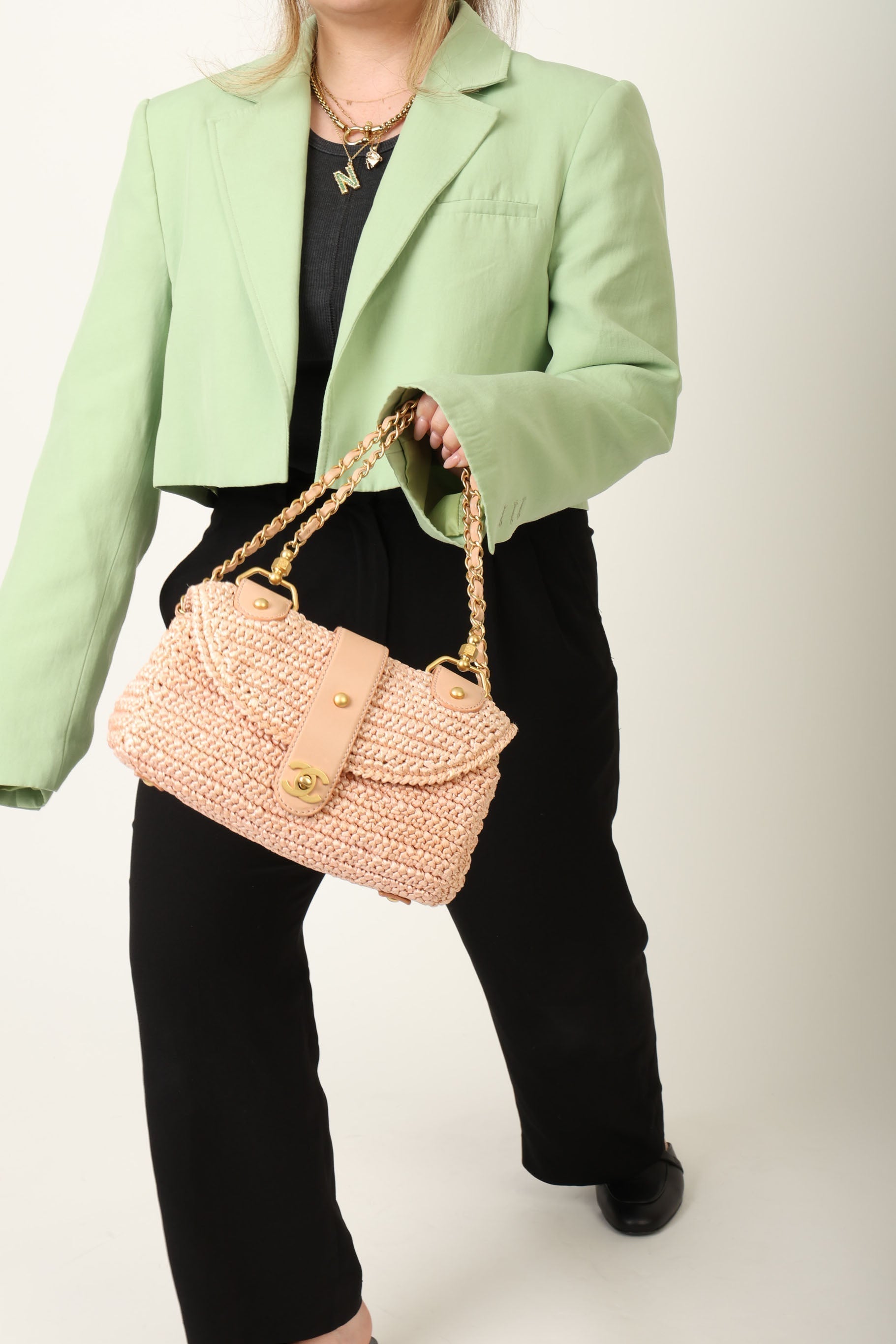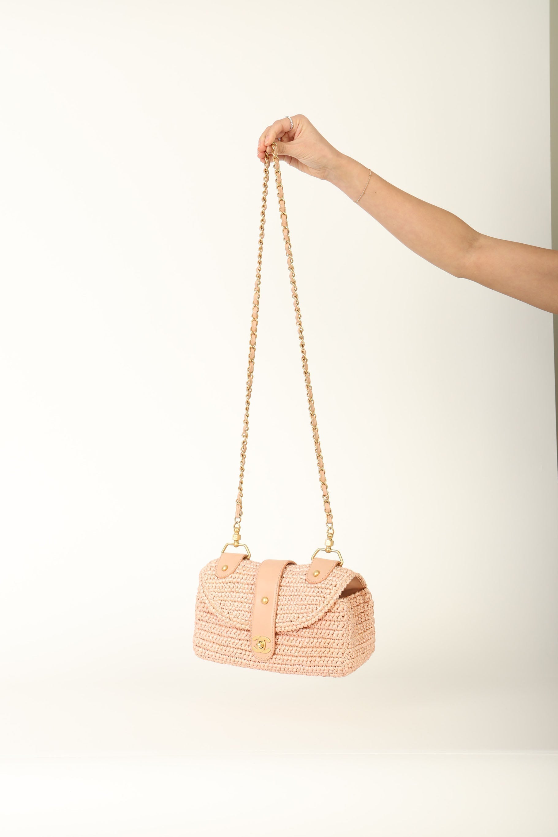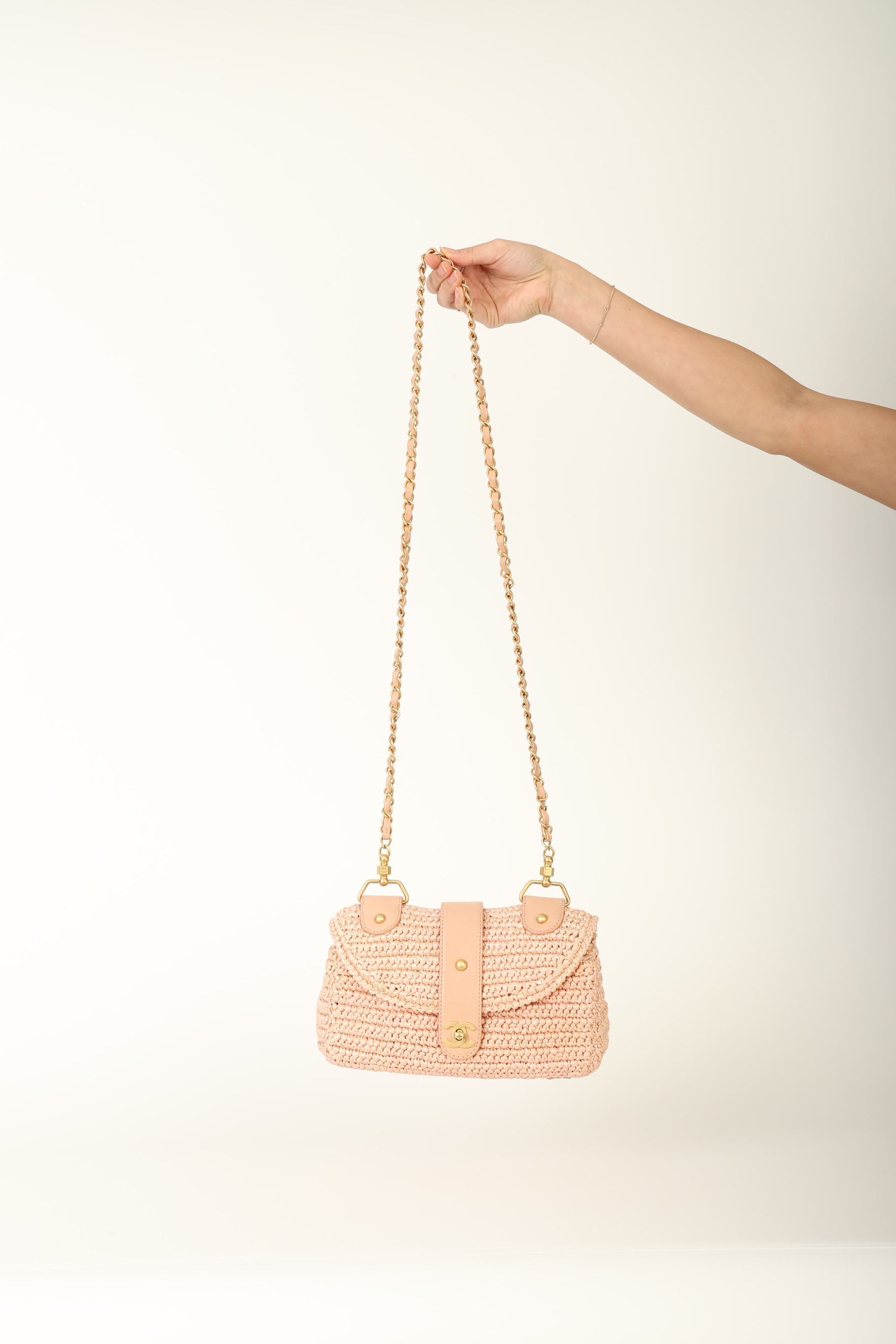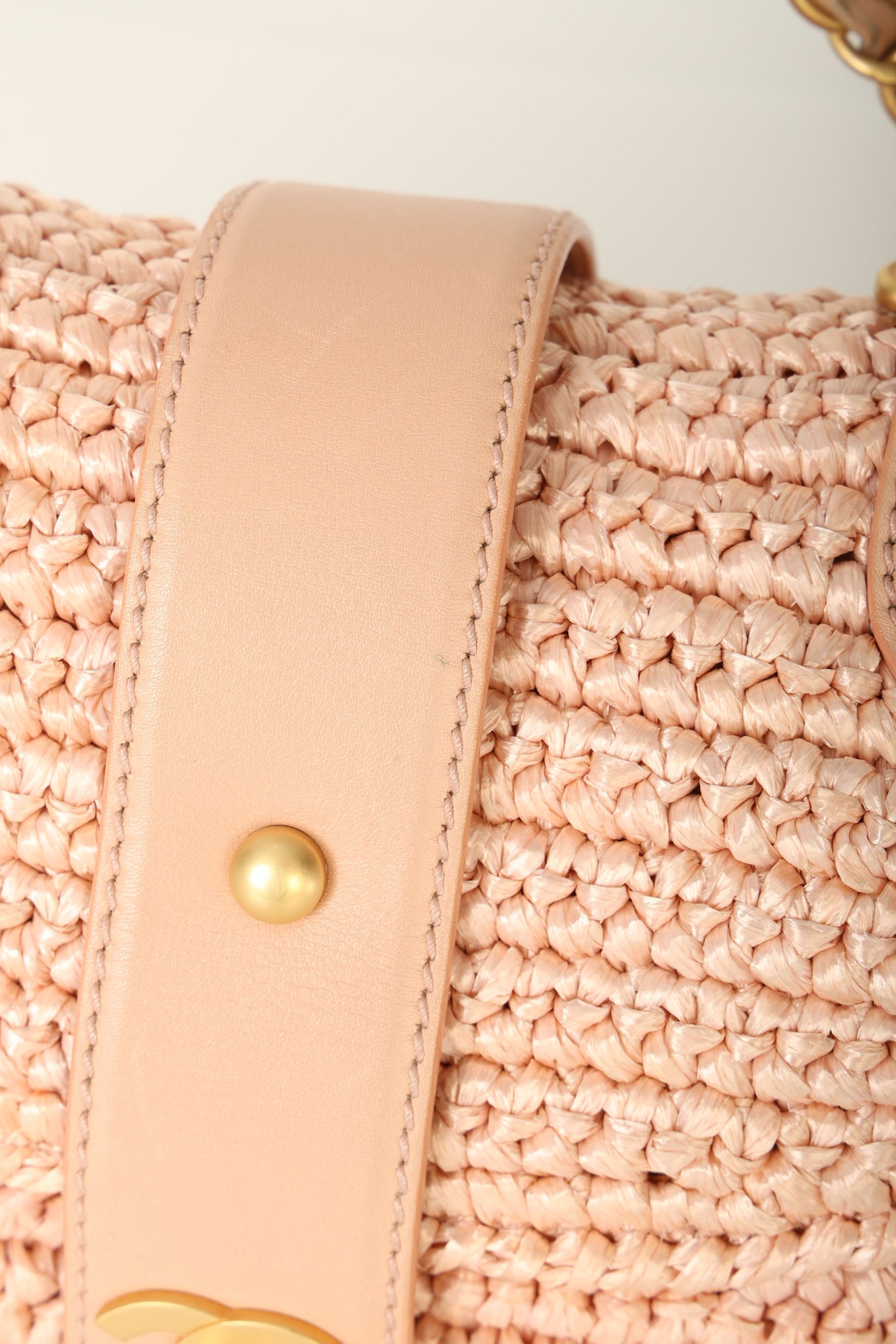 Bringing our first raffia bag of the season! This cherry blossom pink bag is the perfect piece to wear with a sundress to an outdoor picnic, or with a chic beach outfit, or can even be dumpling clutch style for the evening.