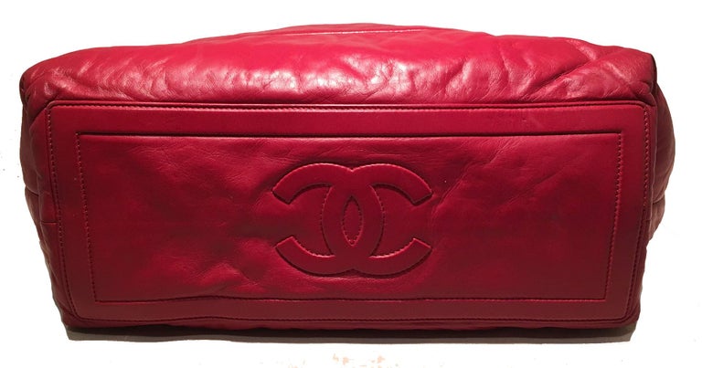 Chanel Red and Navy Puffy Leather Cocoon Tote Bag in excellent condition. Red puffy leather exterior quilted in a striped pattern with CC logo quilted along bottom and at an end of handles on front and back. Strap clasp closure opens to a navy blue puffy quilted leather interior that holds one side zippered pocket. This piece is reversible and can be switched between having the red leather exterior and navy blue quilted exterior so it's 2 bags in one. No stains or smells. Light wear consistent with age and gentle use. Signs of use on handles and corners, see photos for details. Measurements: 15"x12"x7" 7" handle drop