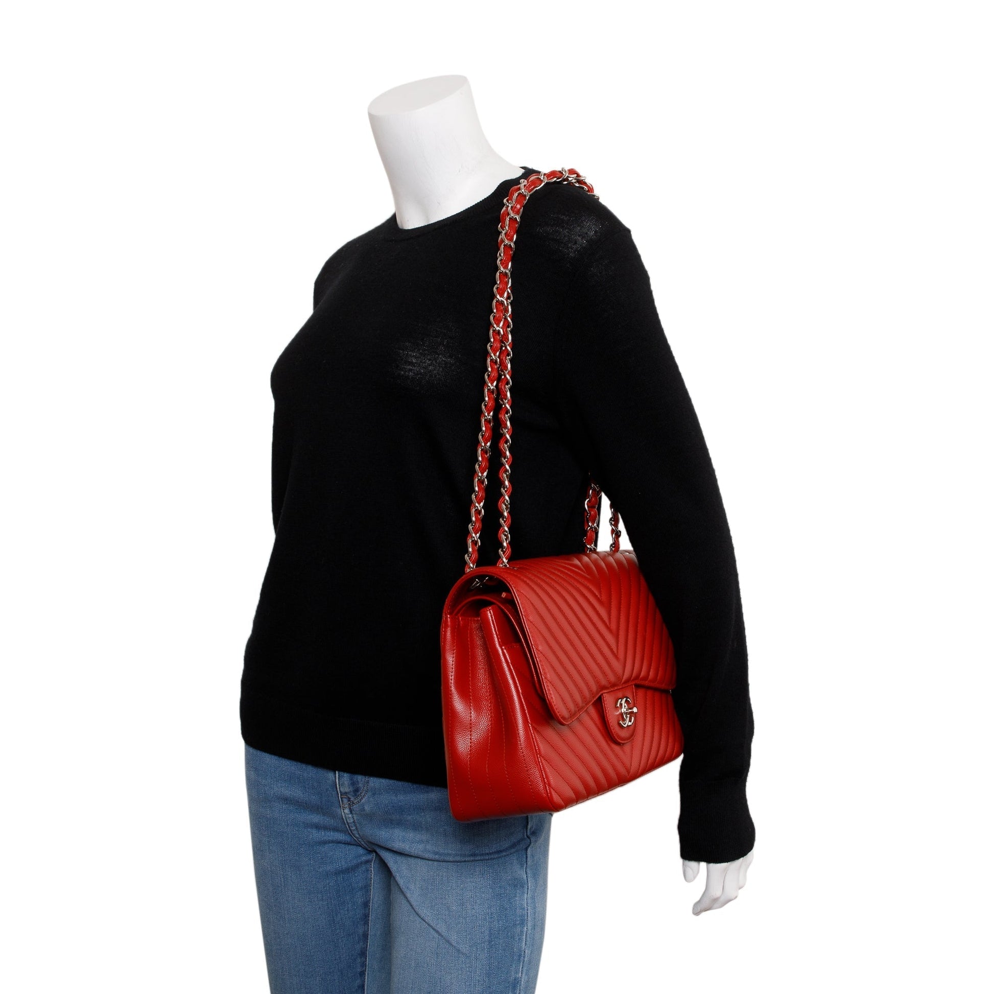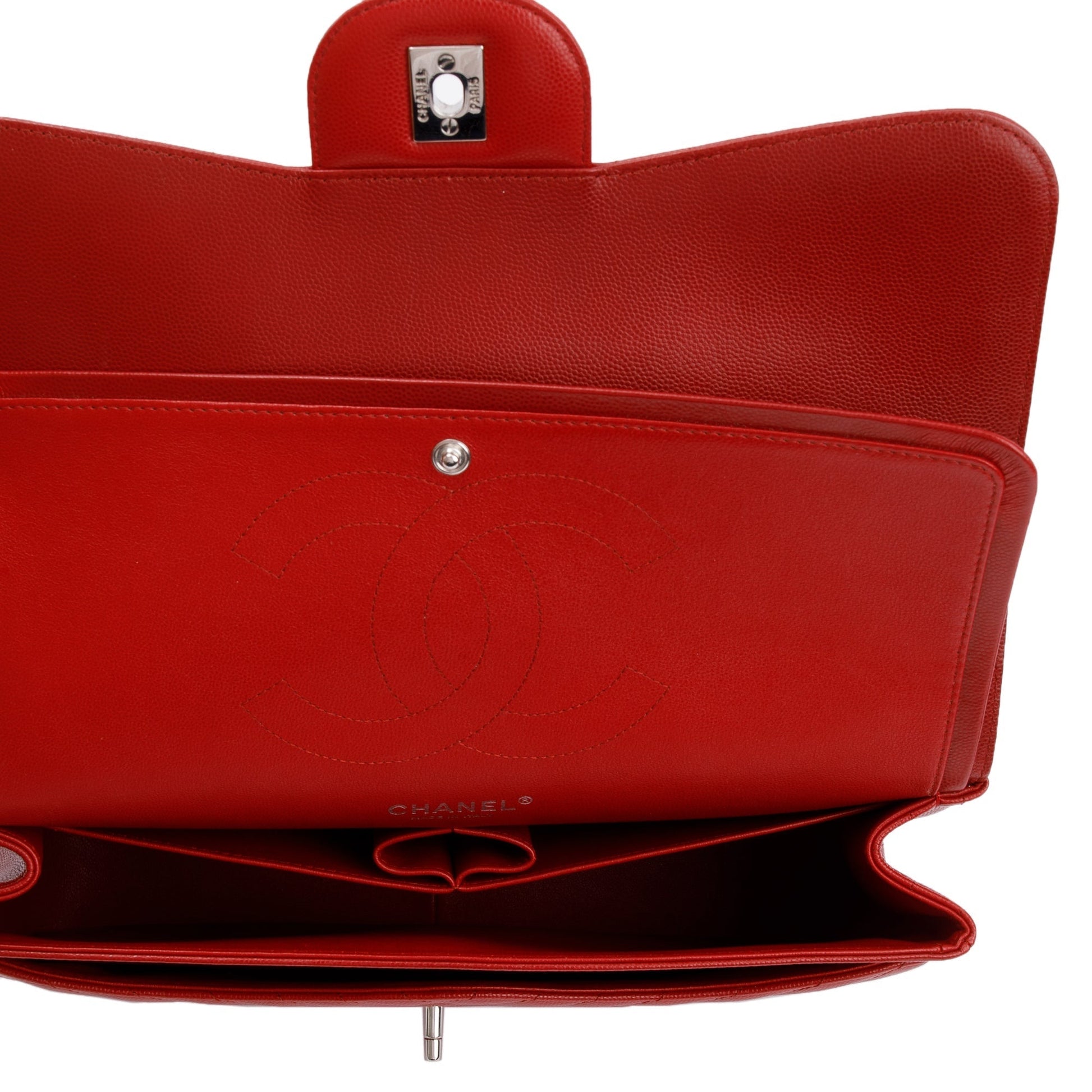 Chanel Red Quilted Caviar Leather Chevron Jumbo Double Flap Bag w/ Box & Authenticity Card