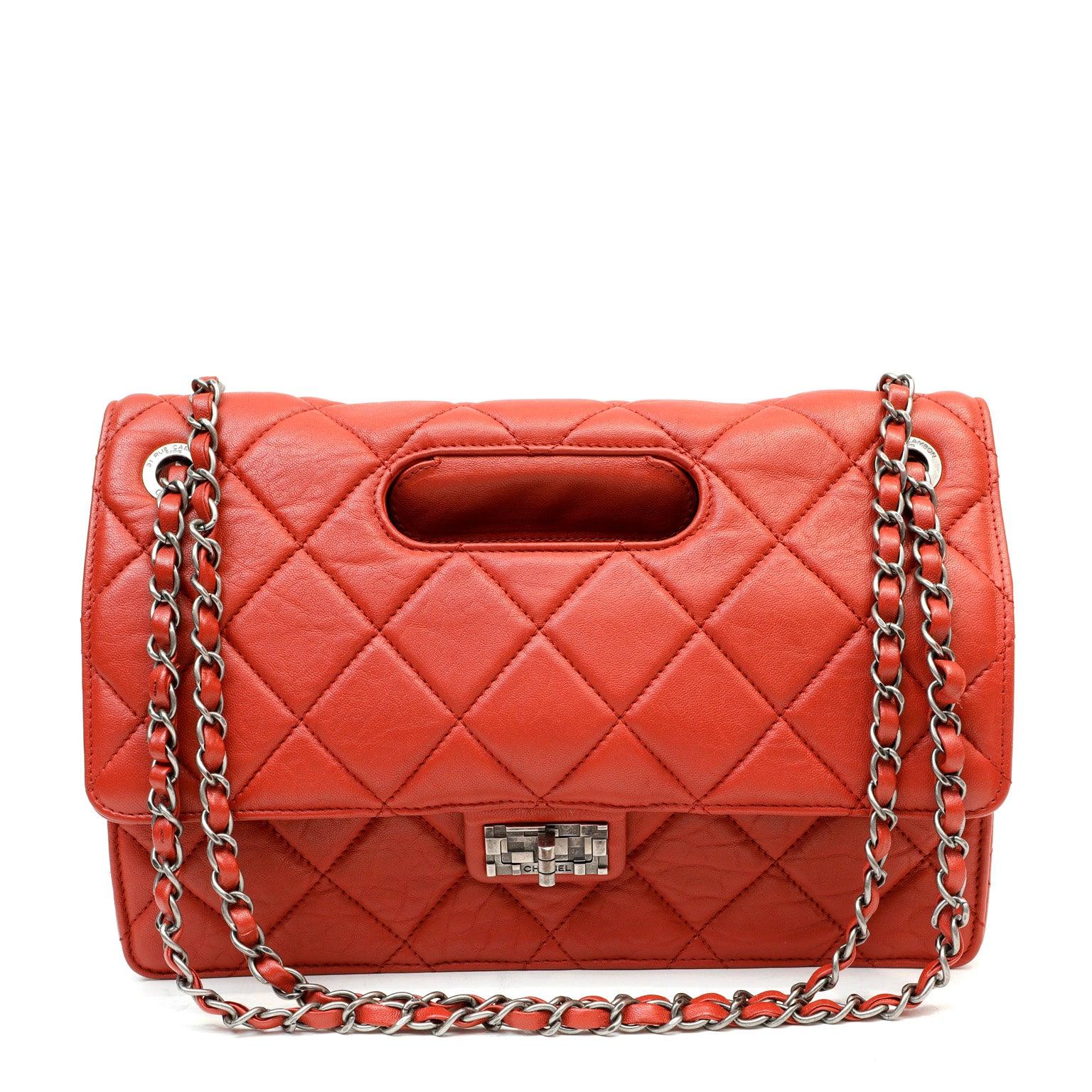 This Chanel Red Lambskin Paris Byzance Takeaway Flap Bag is in pristine condition. From the 2011 collection, the edgy take on a reissue flap bag is unique and beautiful. Lipstick red lambskin is quilted in signature Chanel diamond pattern. Ruthenium mademoiselle twist lock closure. In addition to the traditional leather and chain entwined strap, there is a cut out handle along the top edge for hand carry. Black fabric interior with one side zippered pocket. Made in Italy. Dust bag included.