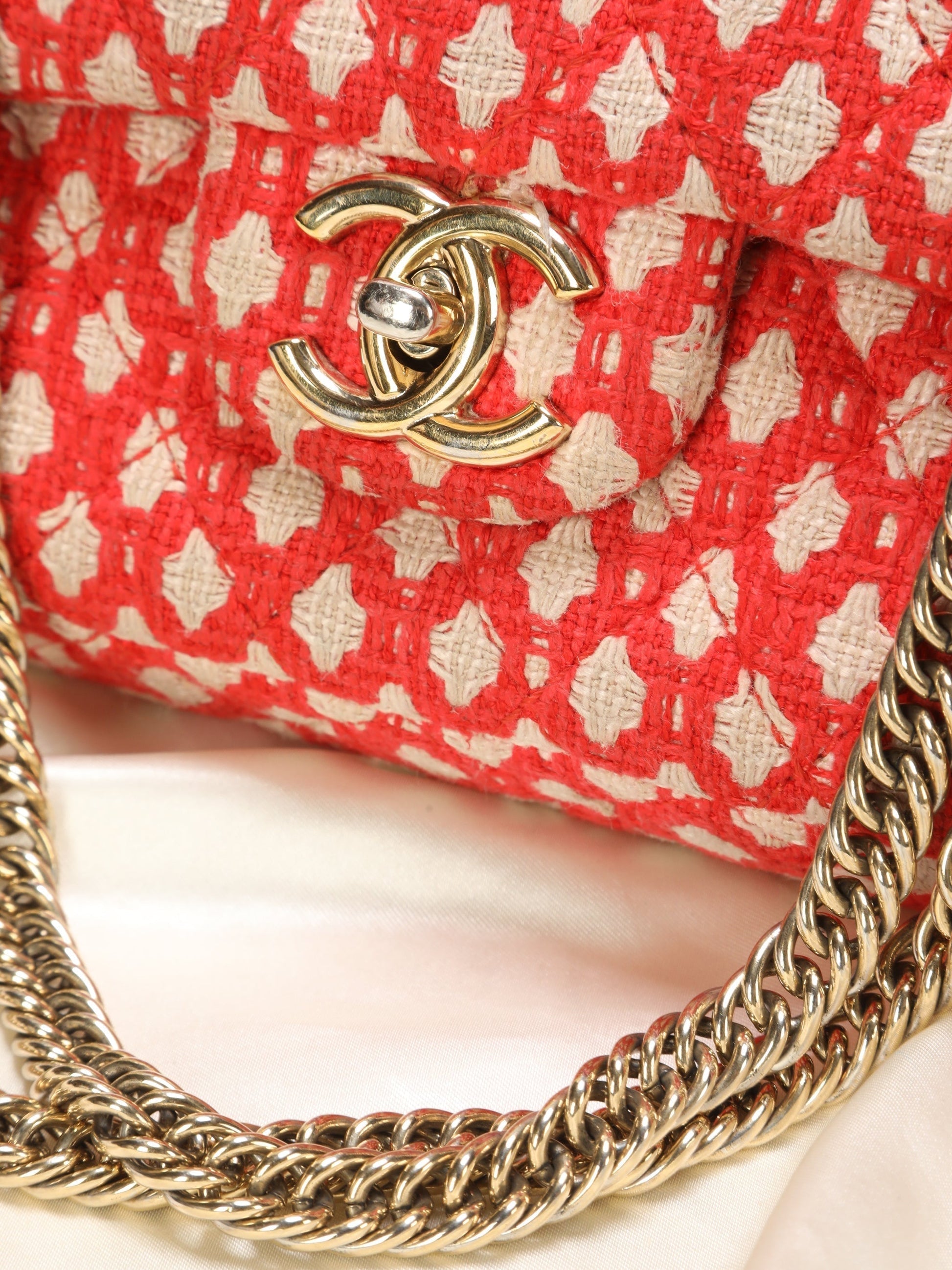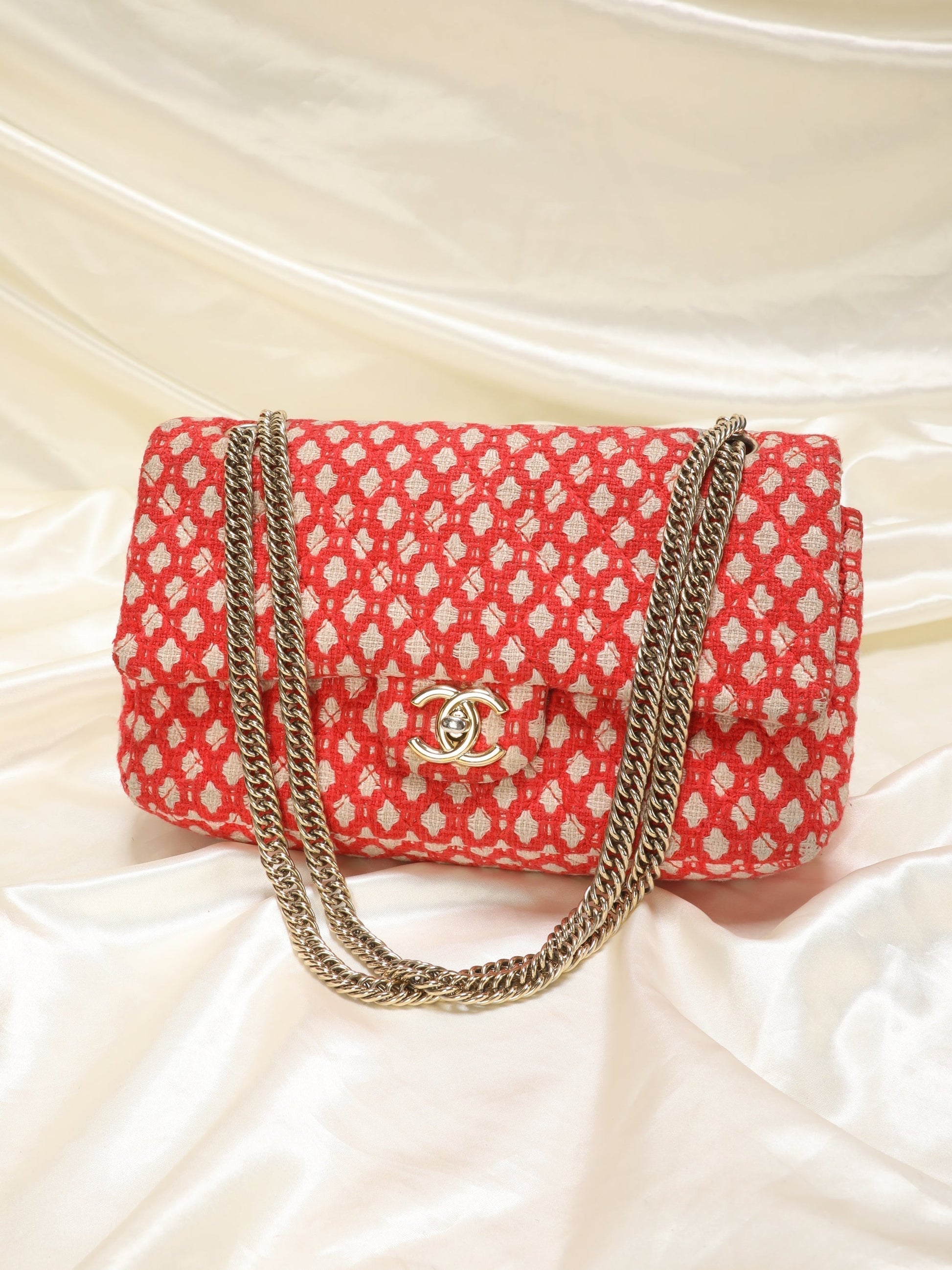 This beautiful tweed Chanel comes in a bold red with a gorgeous diamond-like pattern that adorns the entirety of the bag. The double flap bag also has a very unique chain for Chanel. Red and white patterned tweed exterior trimmed with gold hardware and a gold chain shoulder strap. Signature double flap style closure opens through a twisting CC logo front to reveal a red leather lined interior. Light scuffs inside from gentle use. Perfect for a variety of occasions and a must-have for collectors or any chanel lovers as this is a limited edition style no longer made. Measurements: 10"x6"x2.5" 9-16" strap drop.
