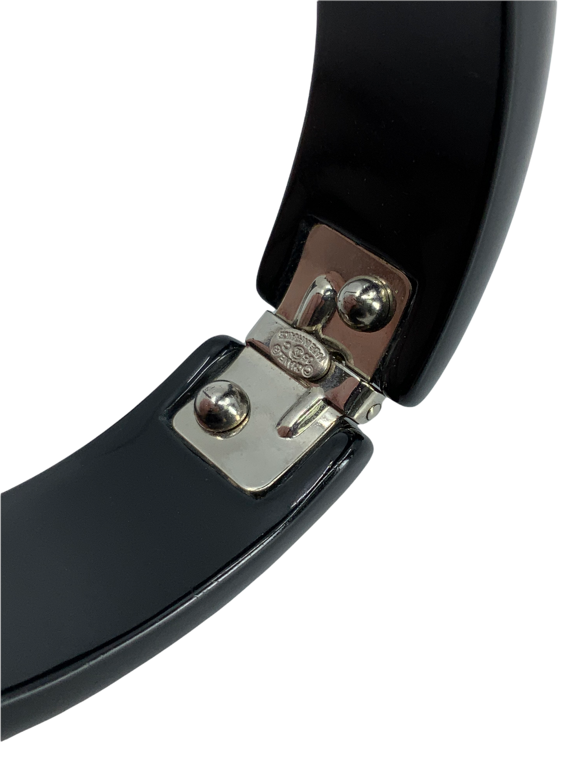 We the ity of thisextremely rare Chanel Resin CC Logo Polka Dot Bangle Bracelet. Beautifully crafted from blackresin with beige and white polka dots and signature 'CC' logos.The bracelet opens with a hinged magnetic closure.