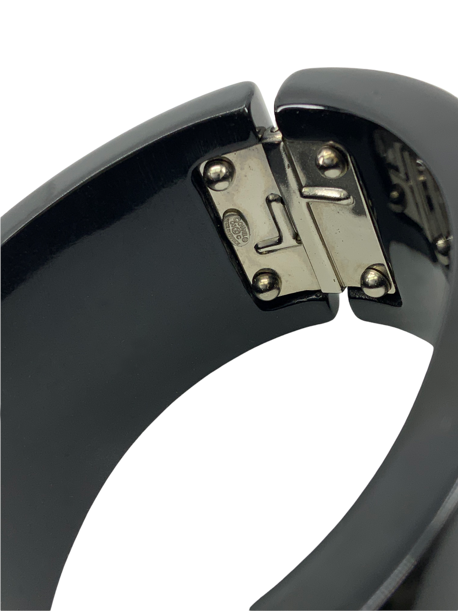 We the ity of thisextremely rare Chanel Resin CC Logo Polka Dot Wide Bangle Bracelet. Featuring gorgeousblackresin with beige and white polka dots and signature 'CC' logos.The bracelet opens with a hinged magnetic closure.