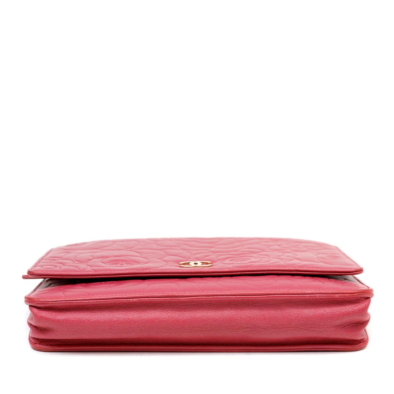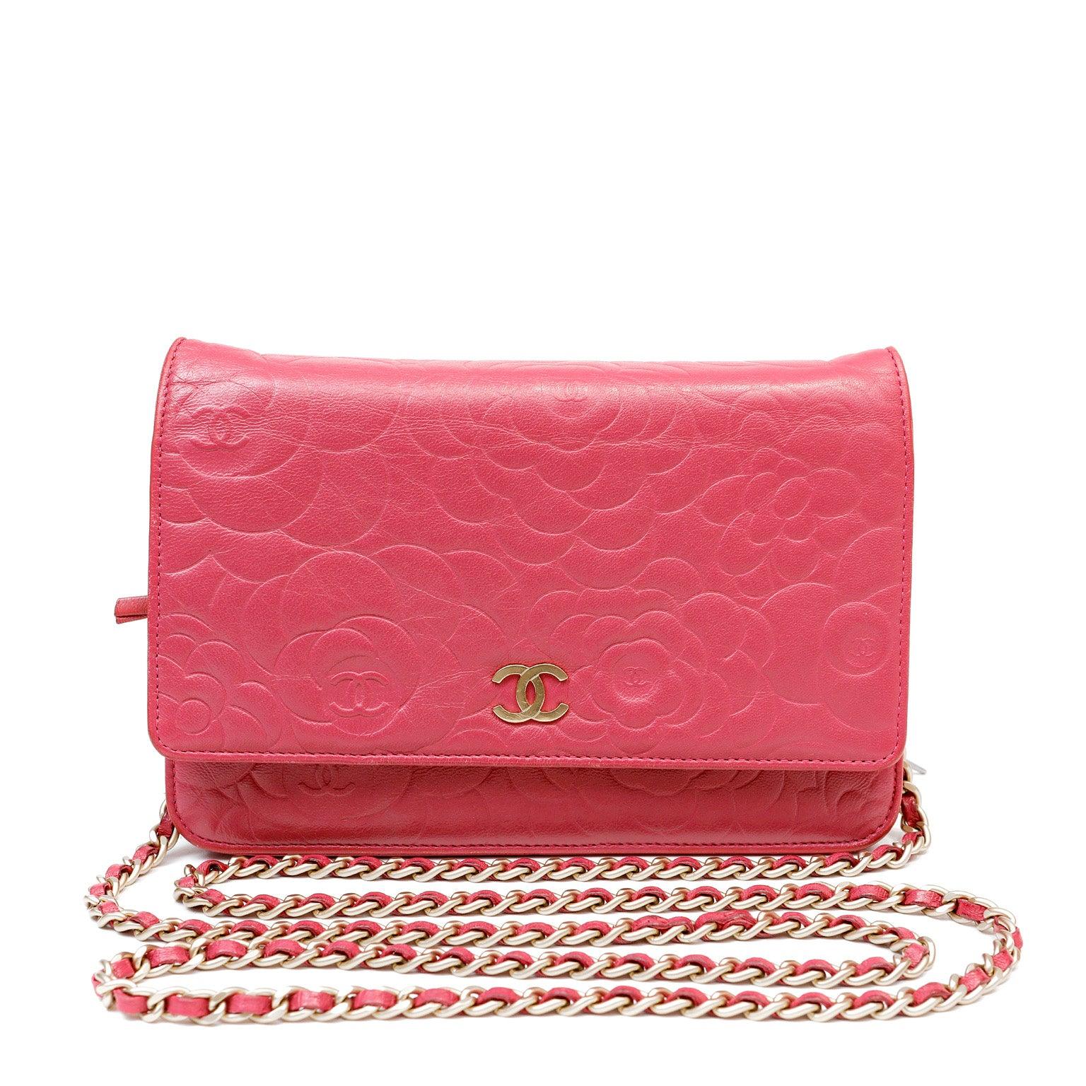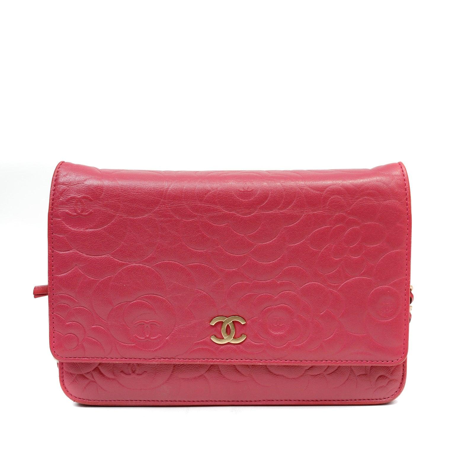 Chanel Rose Pink Camellia Imprinted Wallet on Chain w/ Gold Hardware