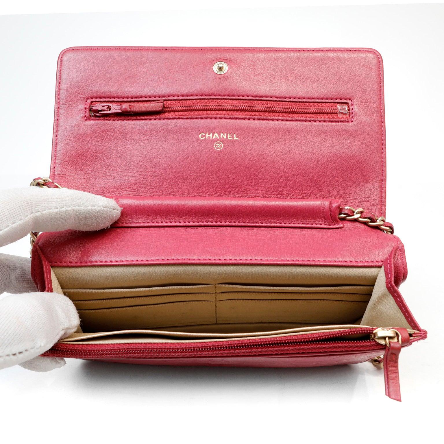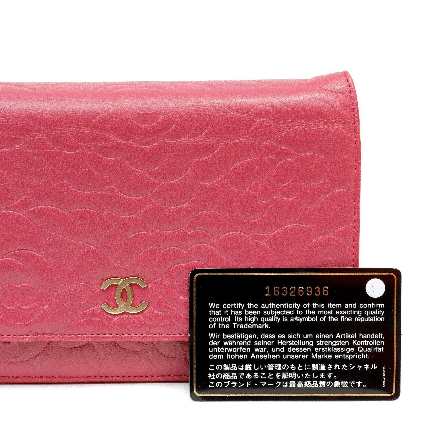 This Chanel Rose Pink Camellia Embossed Leather Wallet on a Chain is in excellent plus condition. The beloved WOC, or Wallet on a Chain, is a classic style that elevates any ensemble while practically carrying all the essentials. Rose pink leather is embossed with swirling camellia flower pattern and CC logos. A gold interlocking CC conceals a press snap closure beneath the flap. Clean interior has multiple card slots, a zippered pocket and an open section for a few small essentials. Long leather and gold chain entwined strap may be comfortably worn across the body. Dust bag included.