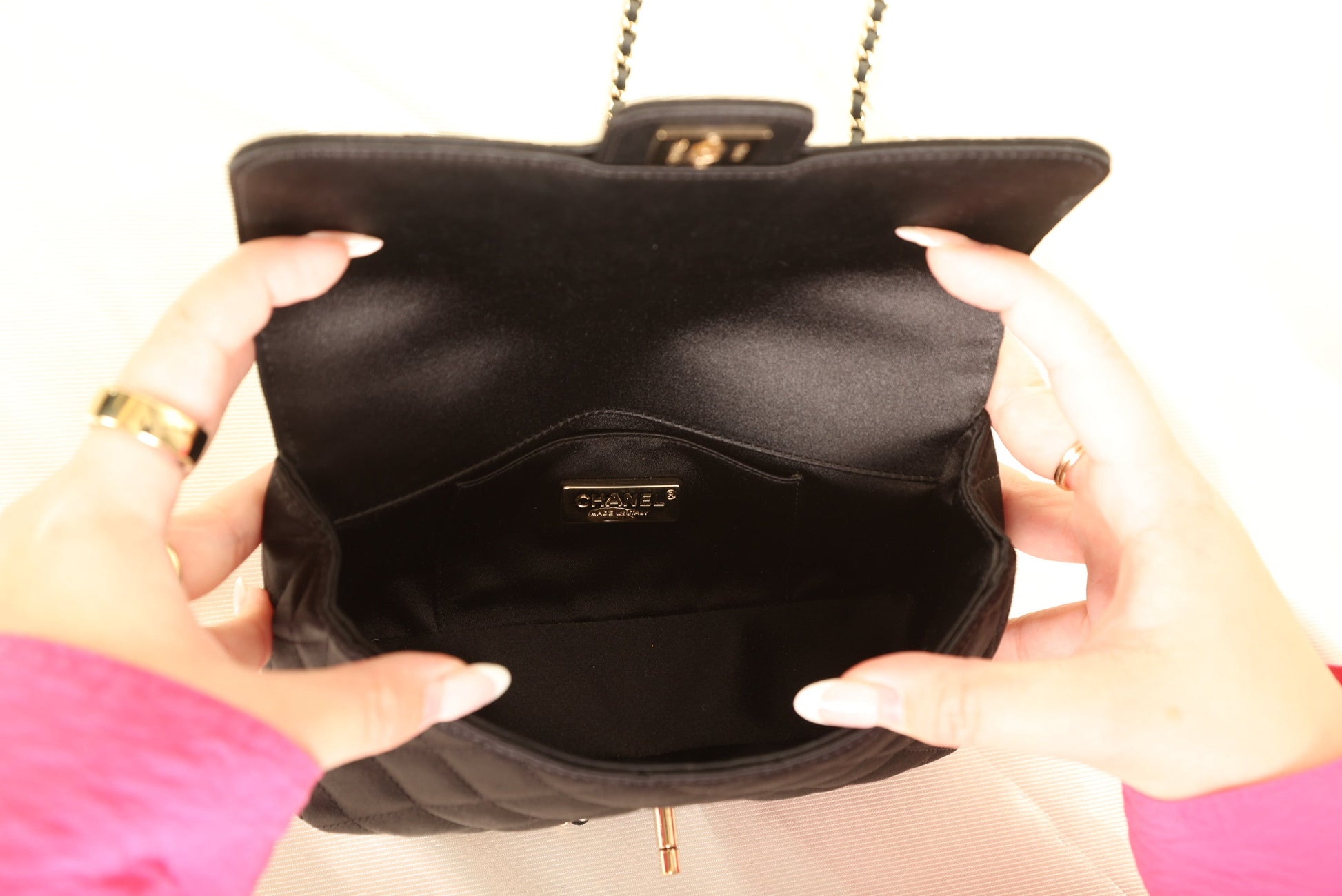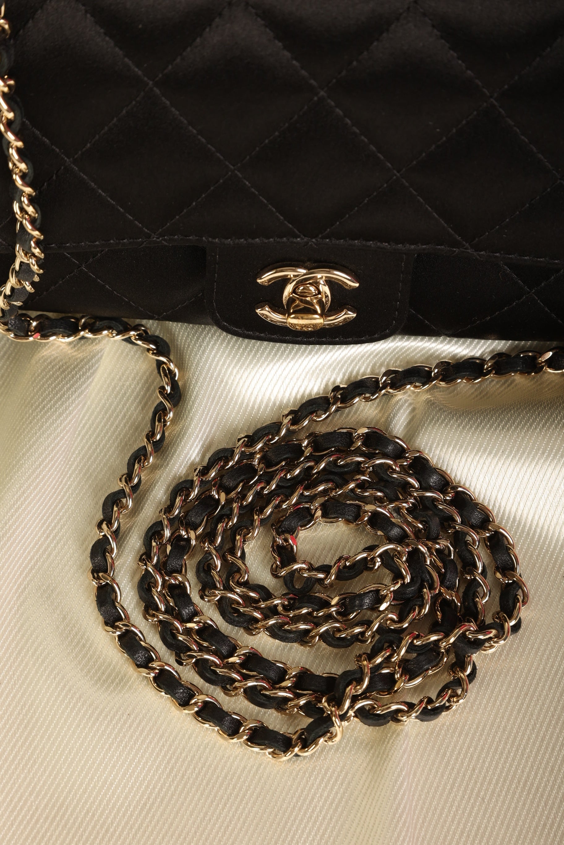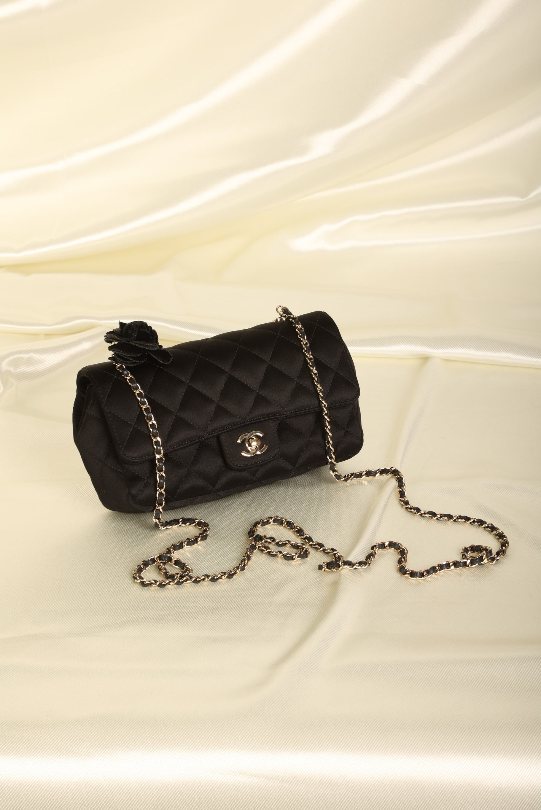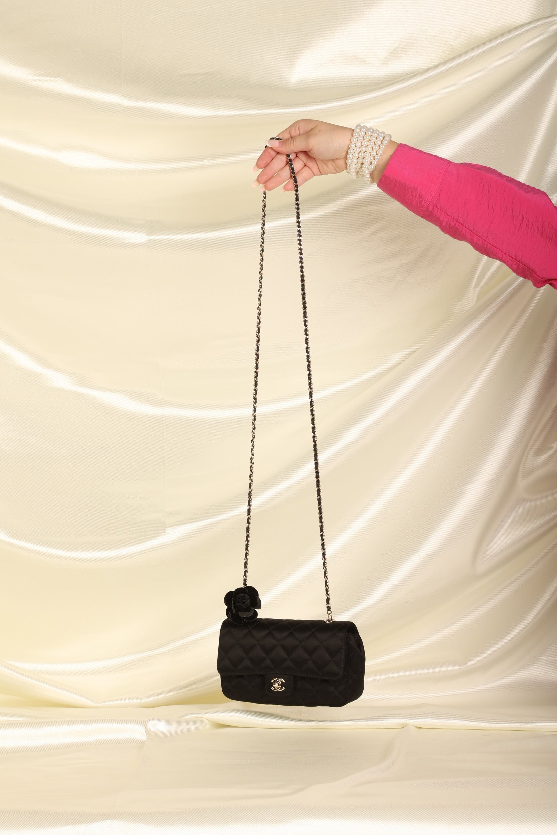Crafted in Chanel's deep black satin and light gold hardware, this bag is a piece of art. With Chanel's signature camellia charm in a soft velvet hanging on the side, this piece is simple, yet significant. Perfect for holding all your essentials - fits a phone, cardholder, and lipstick.