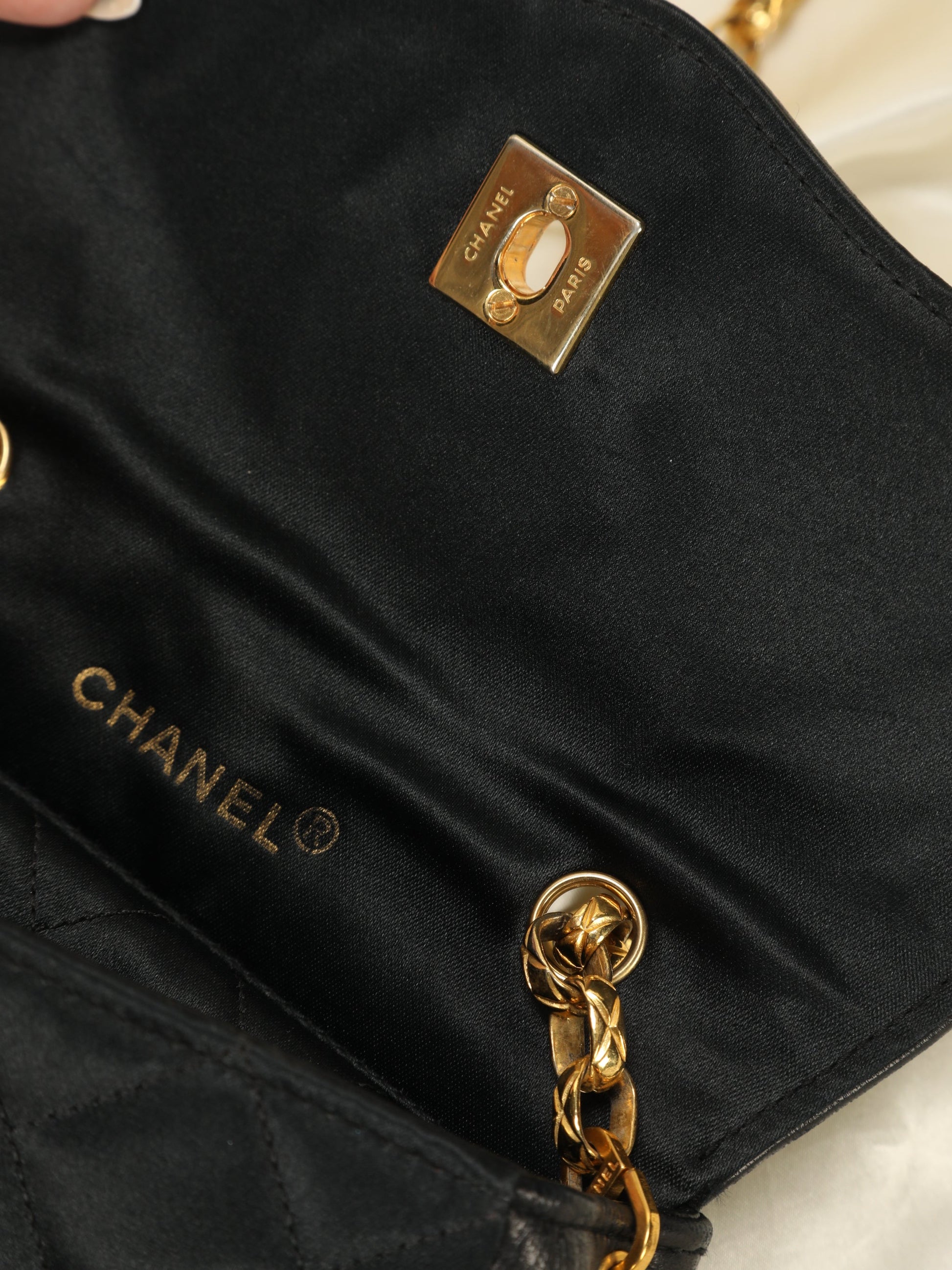 Collector's Chanel! Bringing to the shop this rare satin turn-lock!?Can be loved for years to come. Vintage Chanel crafted in the 90's= 24k hardware. Not only is the satin material rare, the 24k plated bijoux chain links and matching wallet that can be buttoned in makes this a collector??s Chanel piece!?