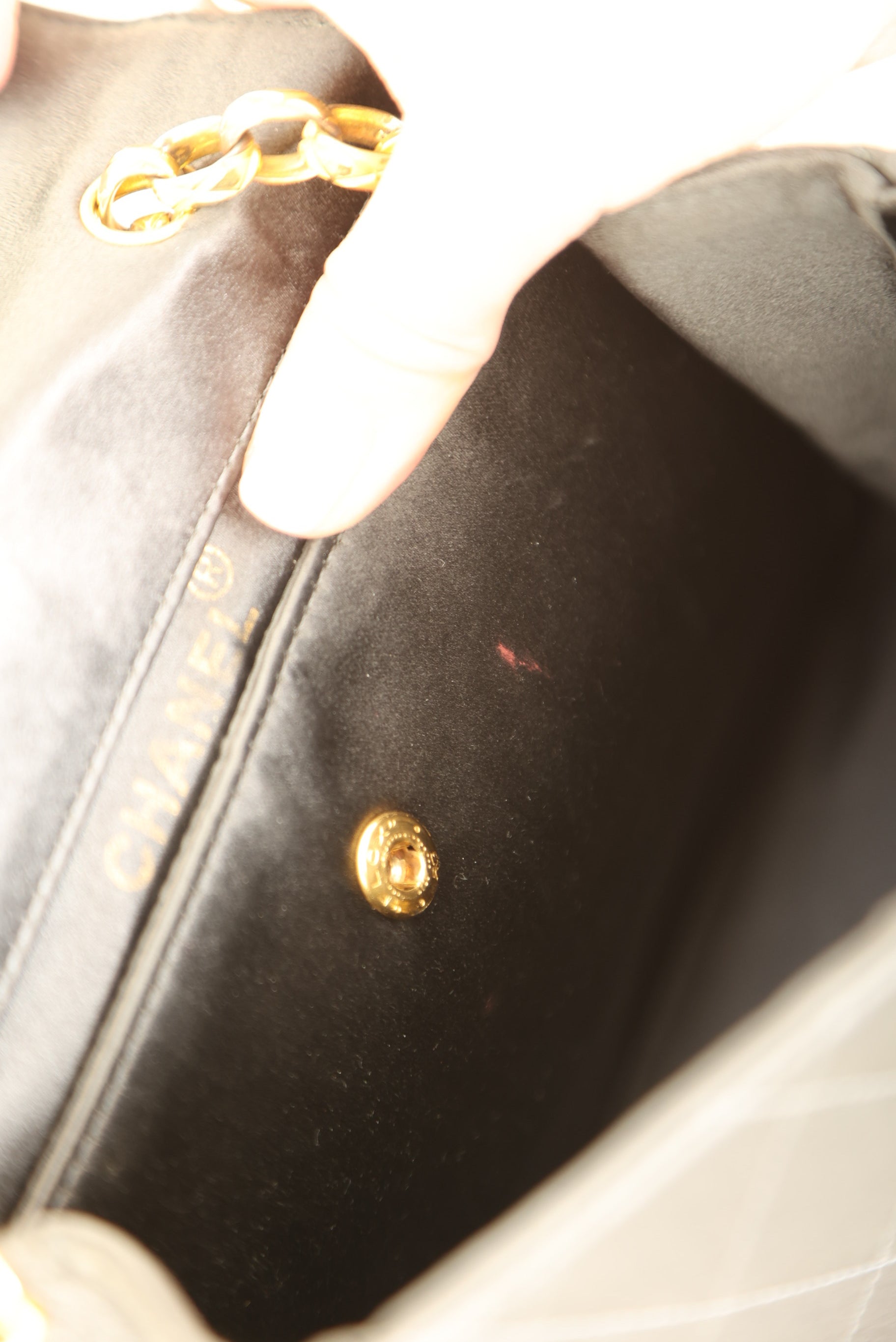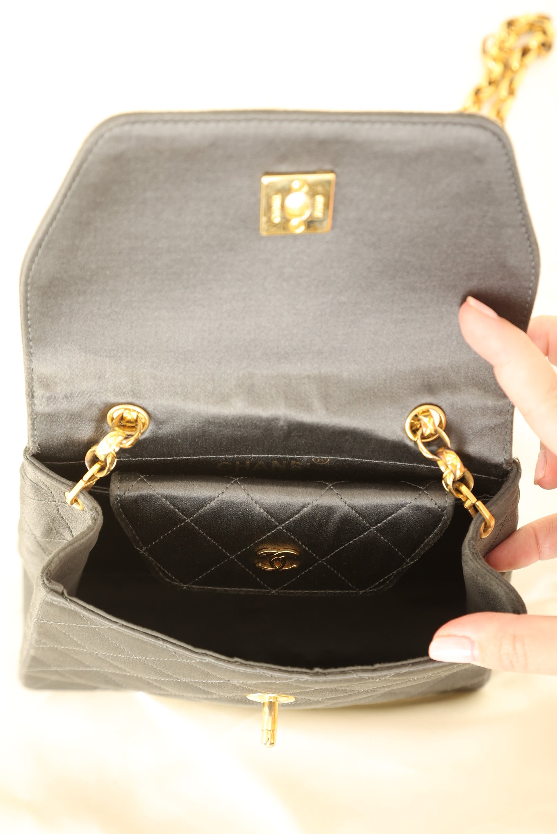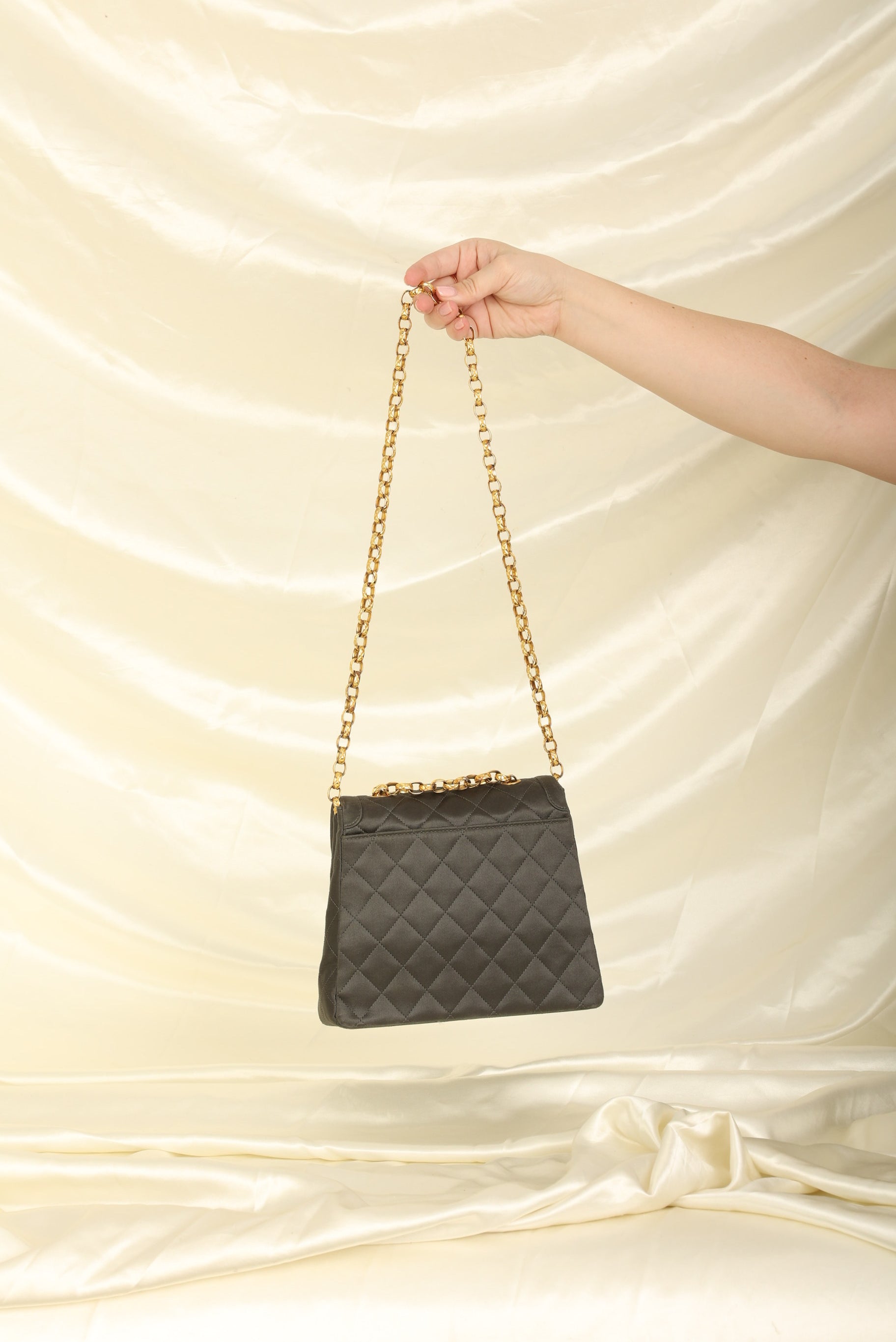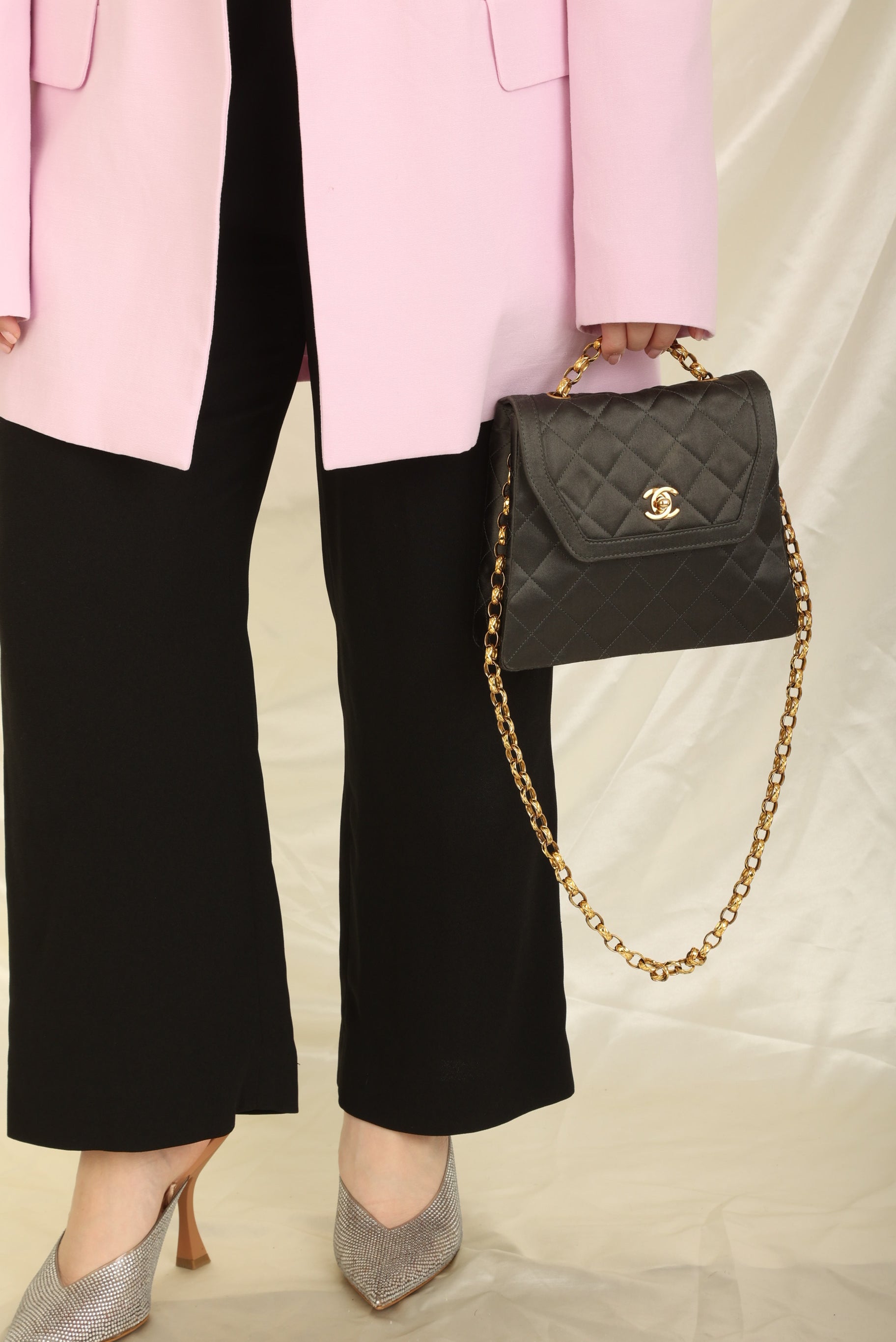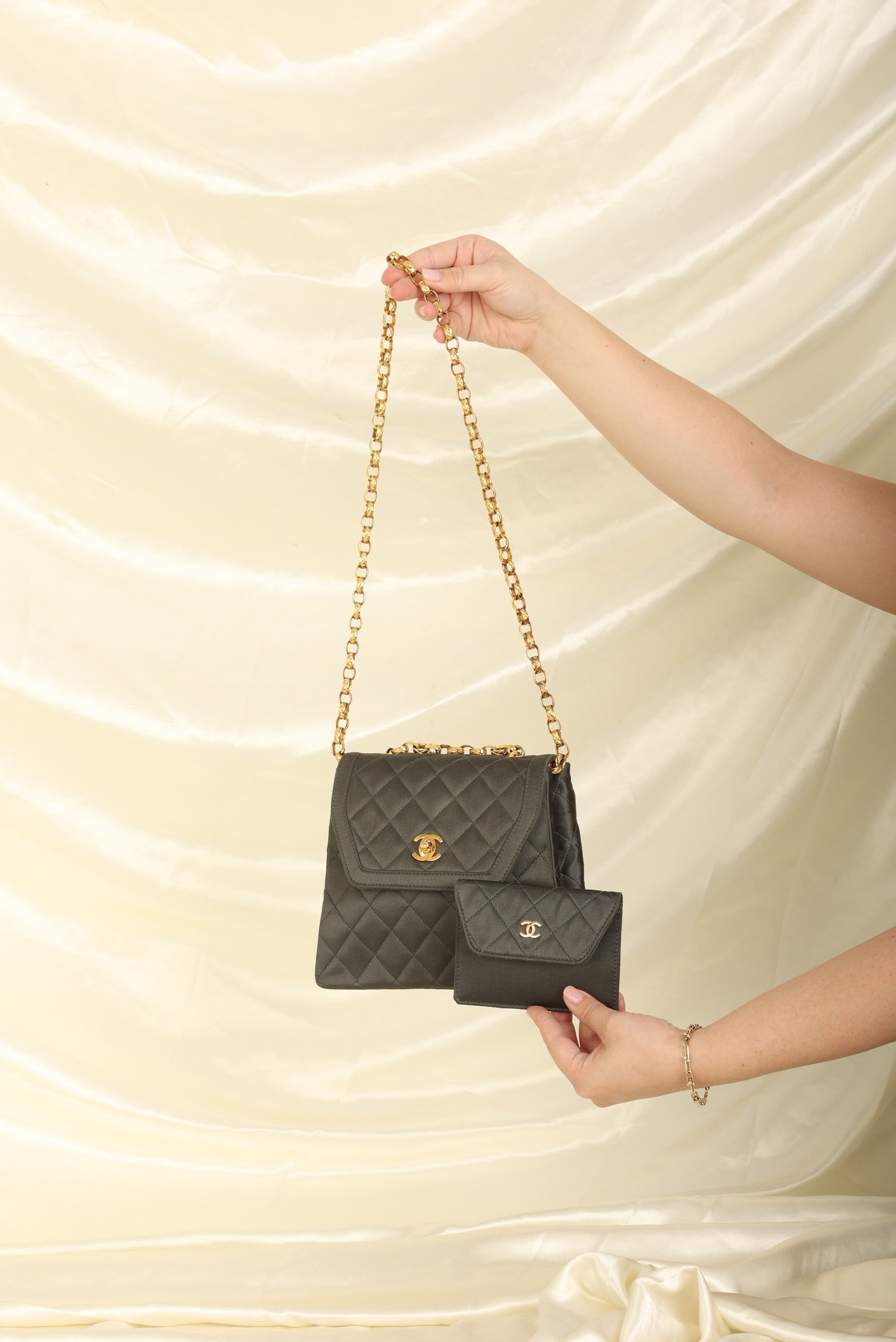 Channel your inner robot this Halloween! Dropping in the shop is the Chanel Satin Trapezoid Bijoux Chain with Pouch!This stunning and timeless vintage Chanel was crafted in the 90s which means 24k gold plated hardware. The bijoux chain makes this bag so unique and the shape of the bag is reminiscent to an Herms Kelly! This versatile piece can be as a long or short shoulder bag. You can even add the matching mini pouch to the back pocket and wear as an additional style! Added a generic chain in order for pouch to be as a crossbody. You can fit your phone, small wallet, keys, and sunglasses.