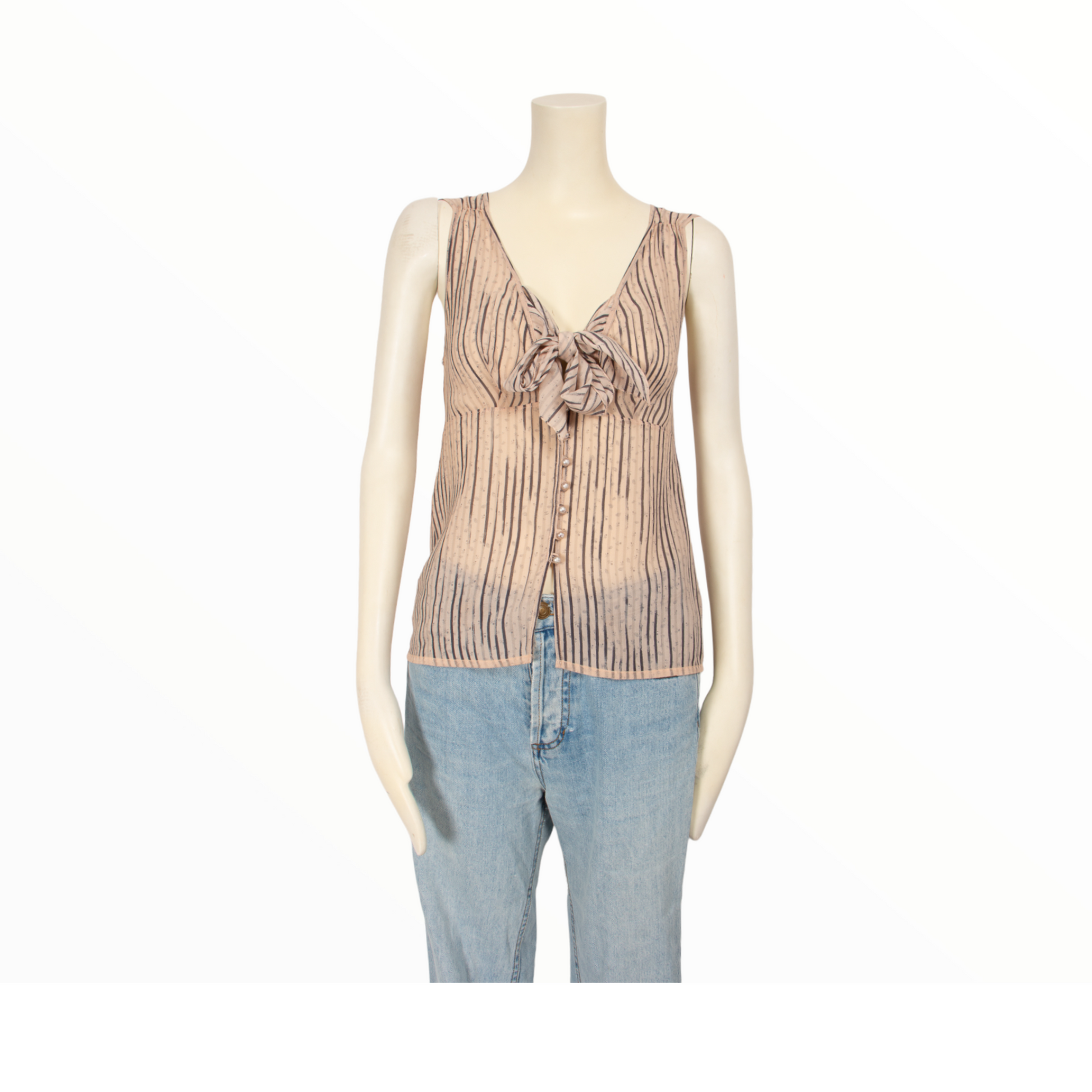 DESCRIPTION: Chanel silk pale pink sleeveless top. V neckline with a rubban. Signed pearly buttons. Prints feature stripes, flowers, leaves and CC logo