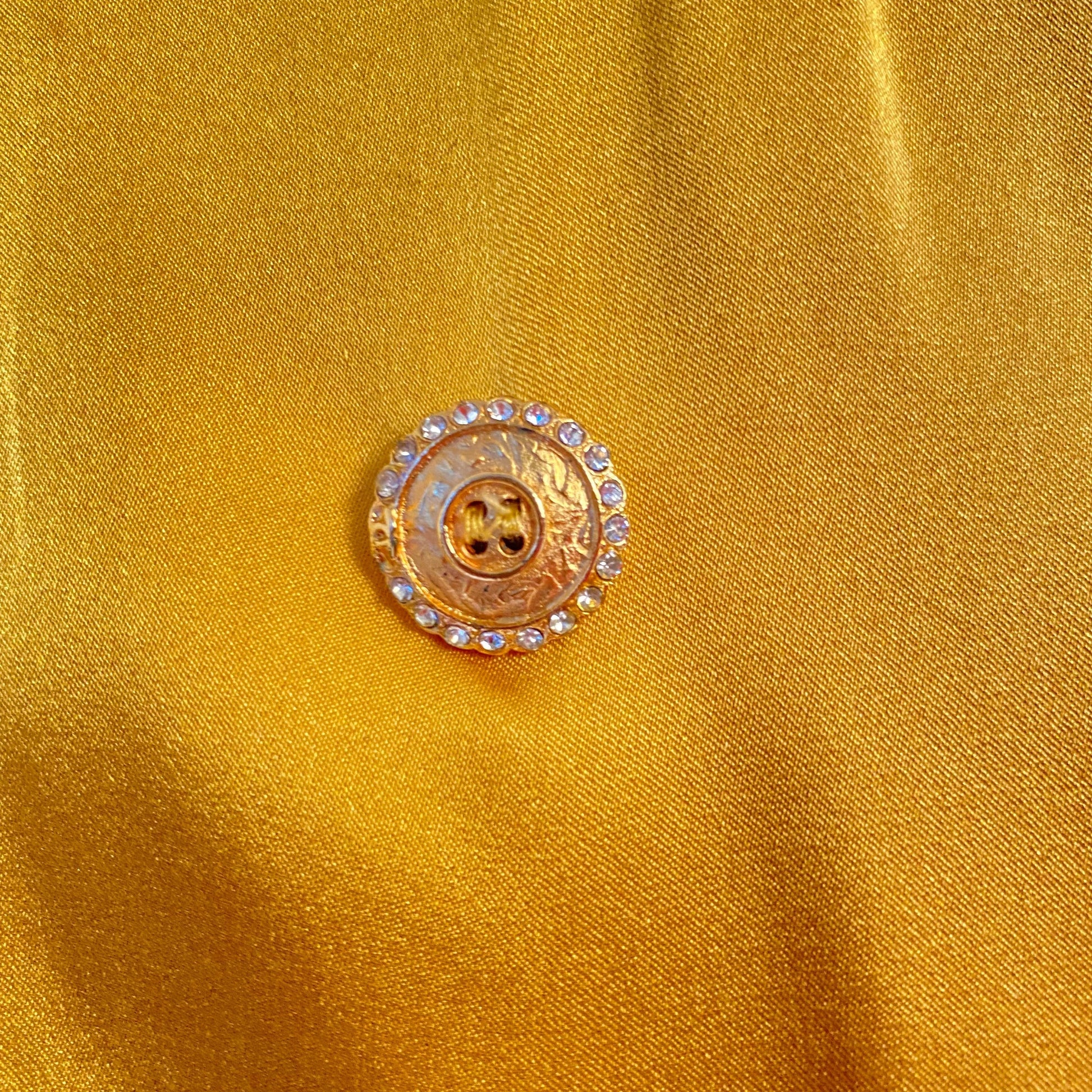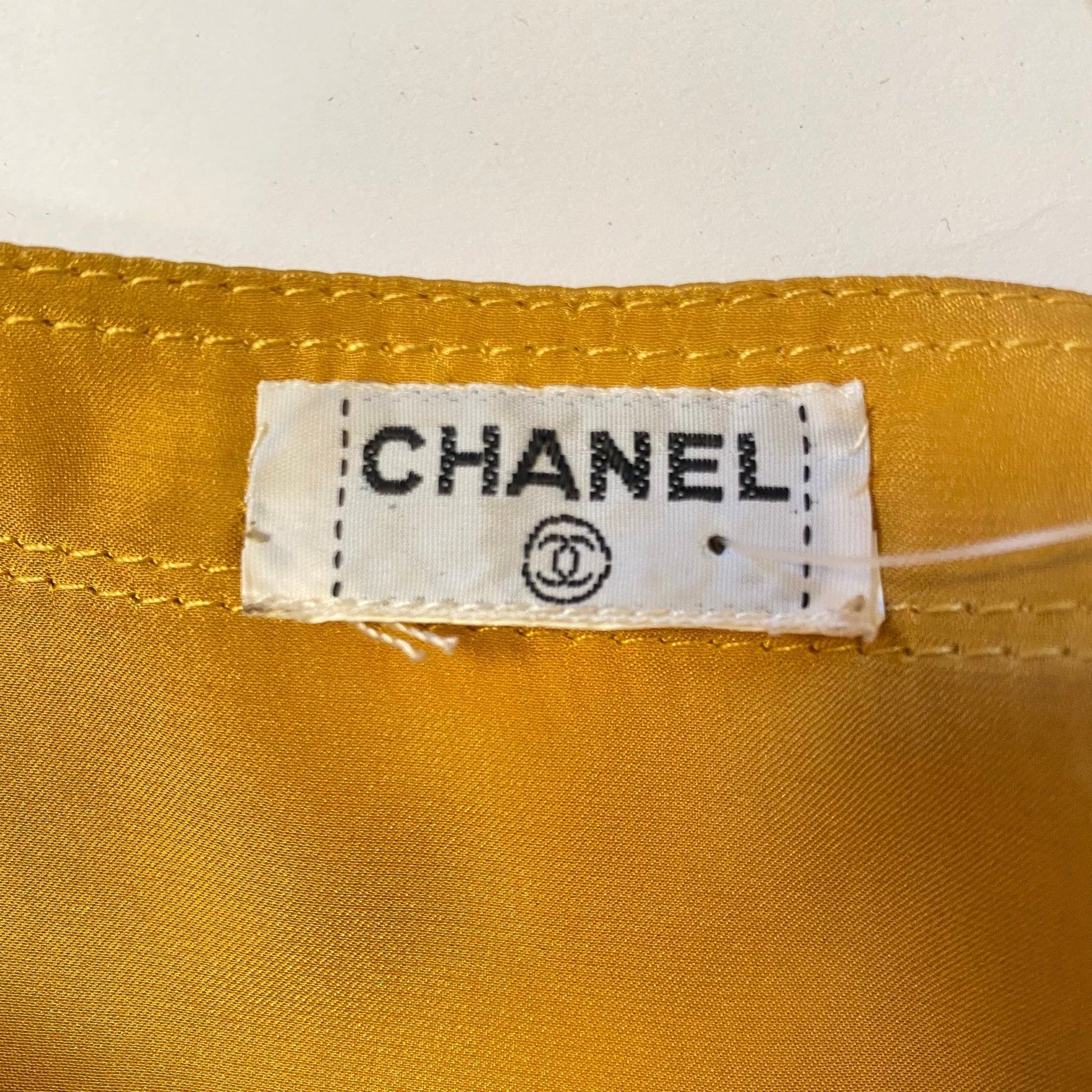 DESCRIPTION: Chanel vintage silk skirt ensemble with a tank top, a large jacket and a pleated midi skirt. Two pockets on the jacket and 4 jewel buttons featuring the CC logo. Trim on the top on the collar and sleeve. Silk lining.No composition label