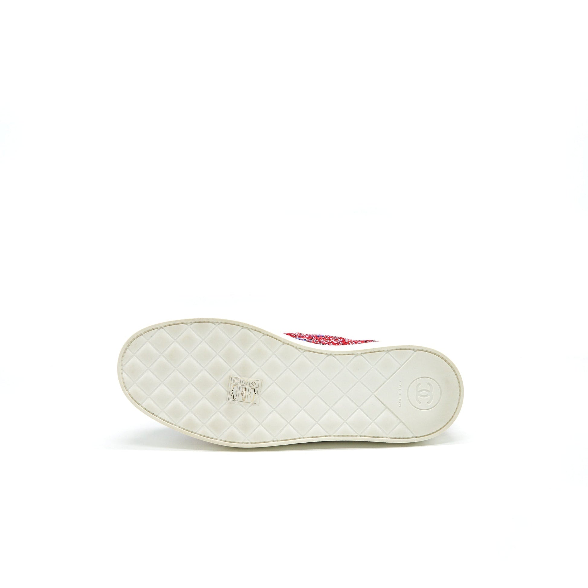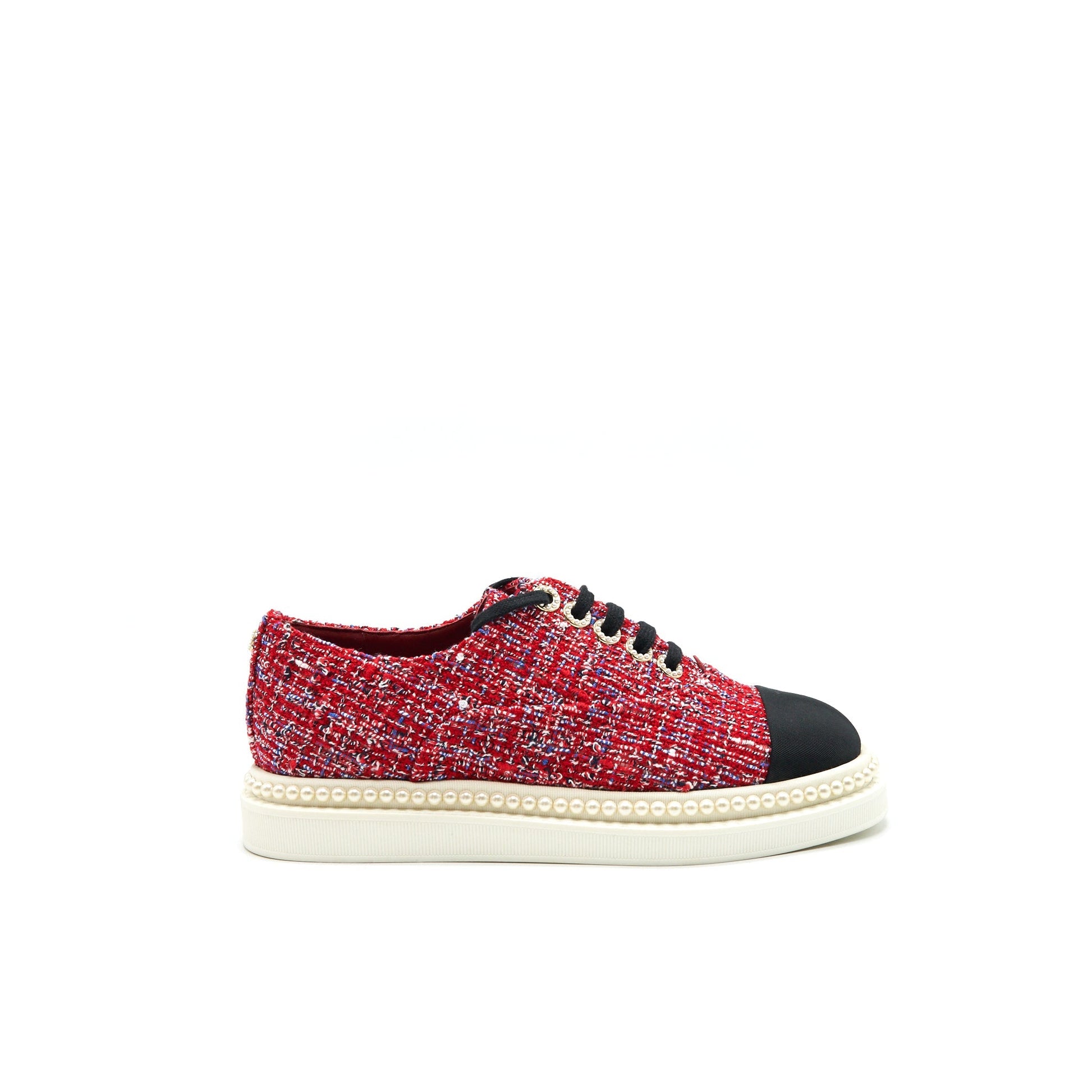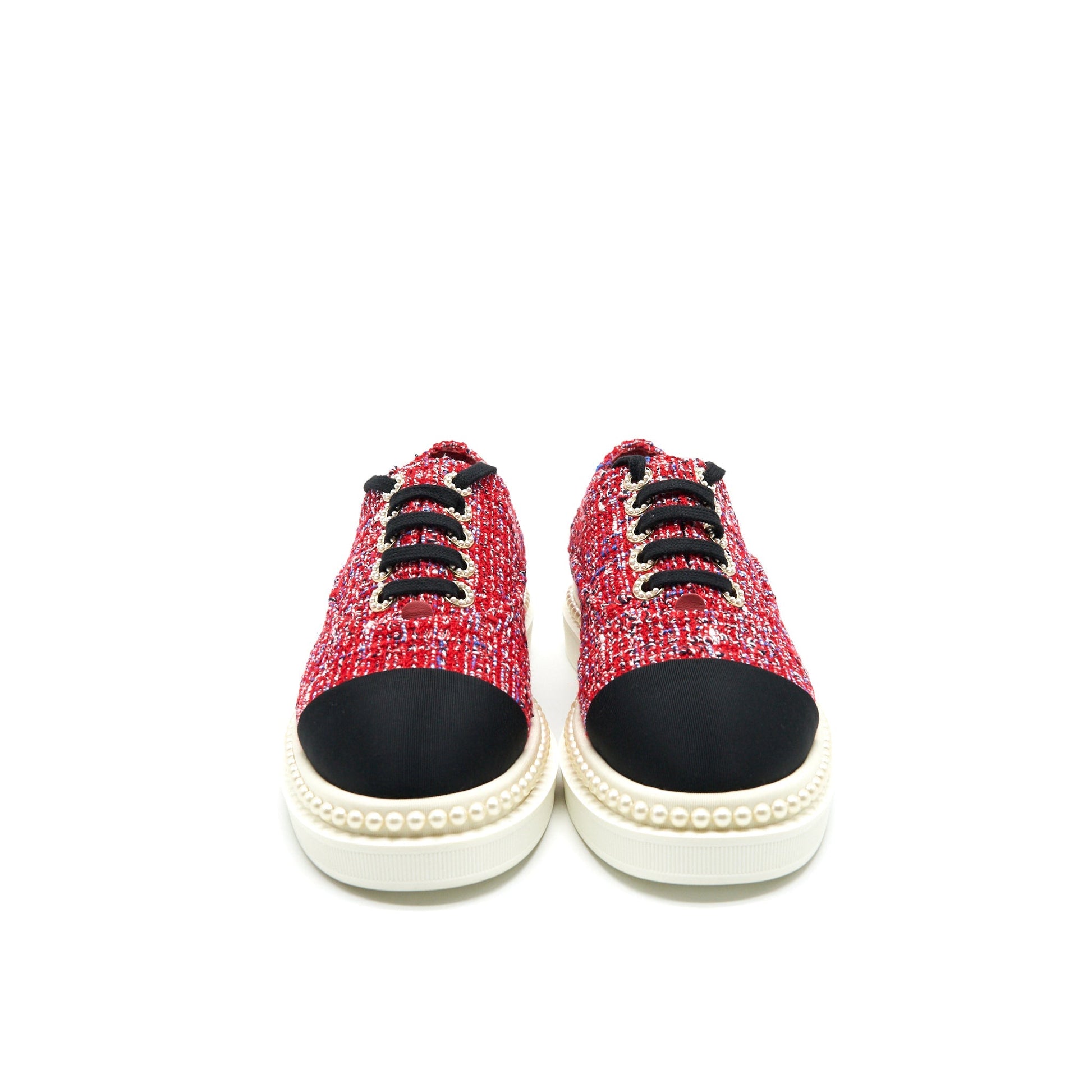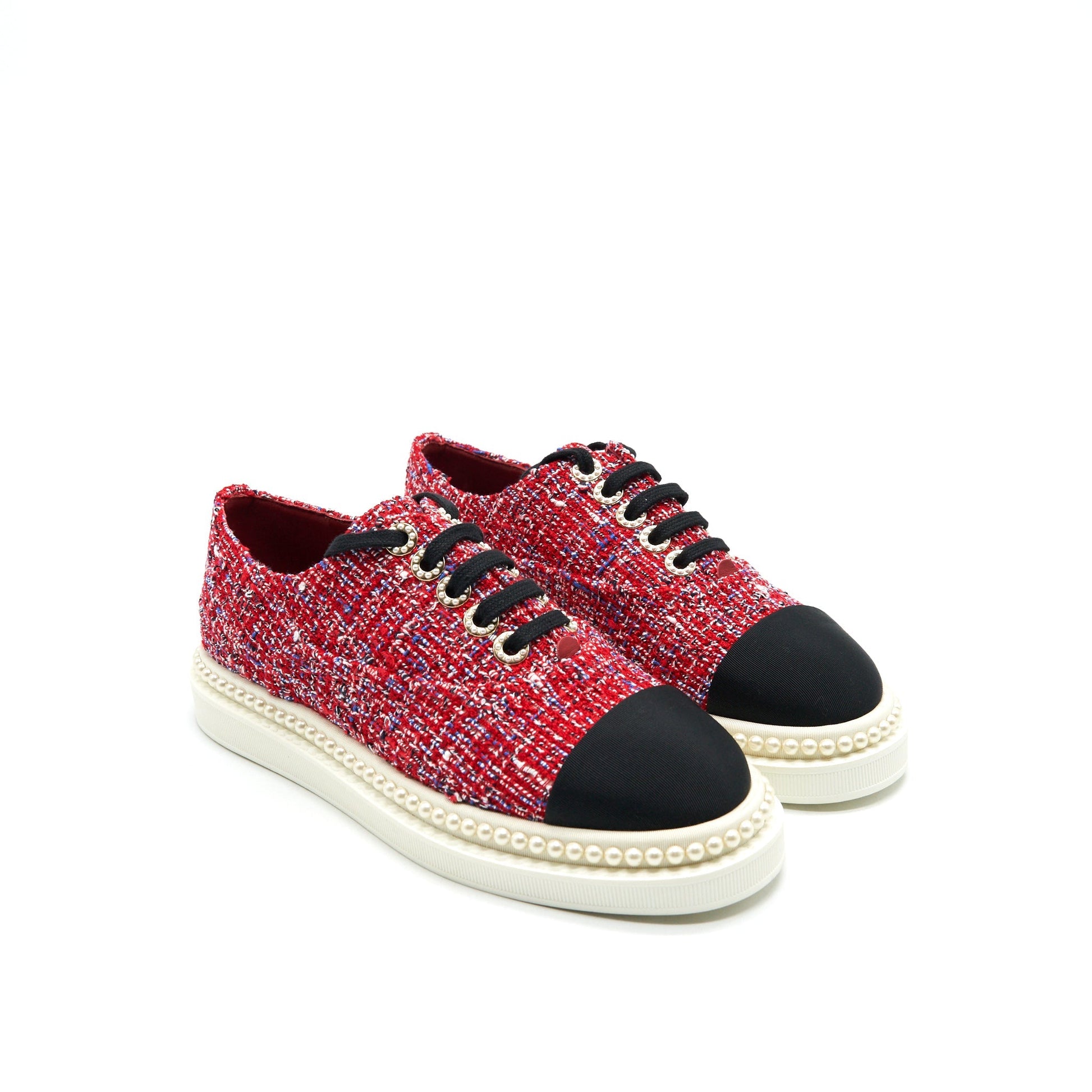 Chanel Size 36.5 Tweed Lace-Up Pearl Flats Red