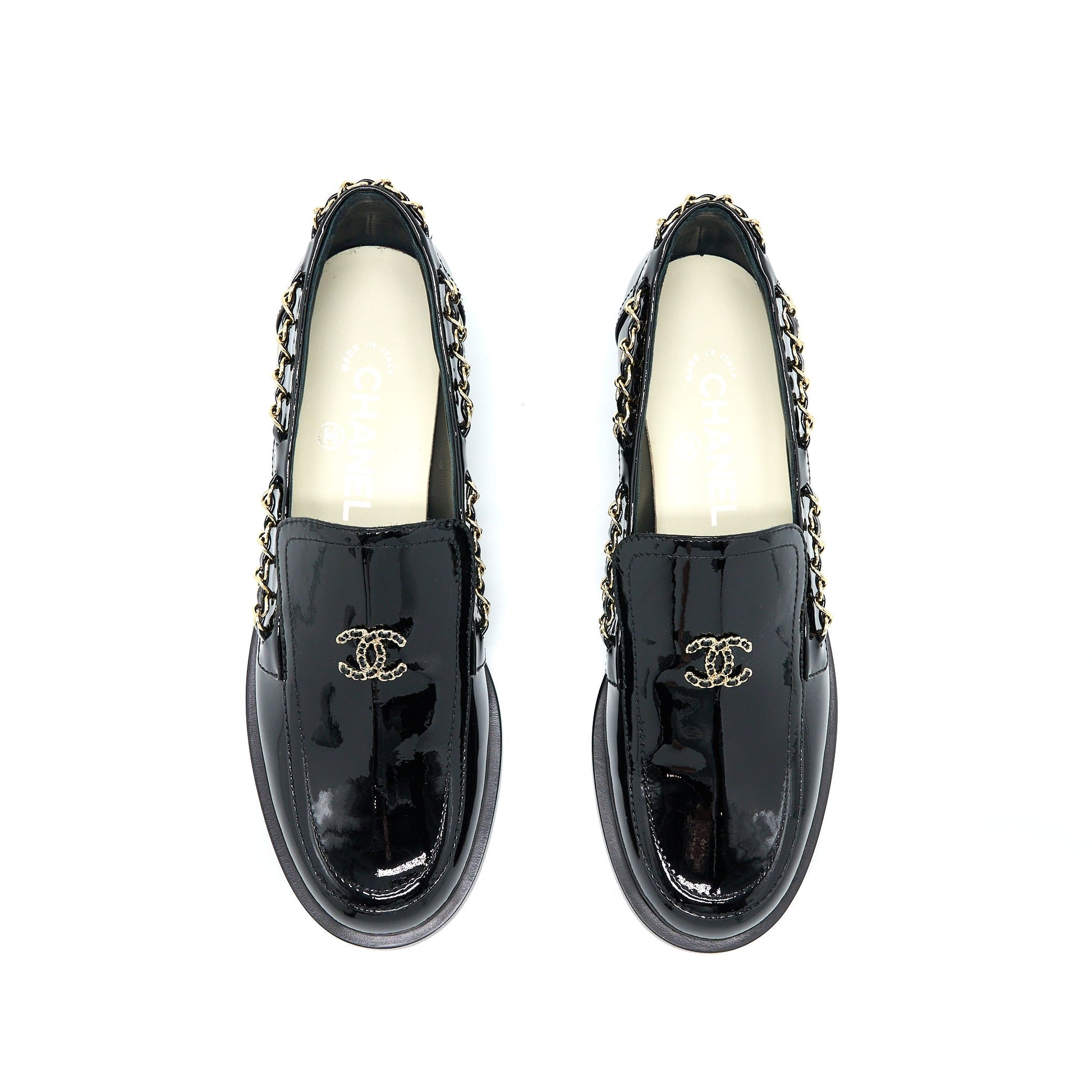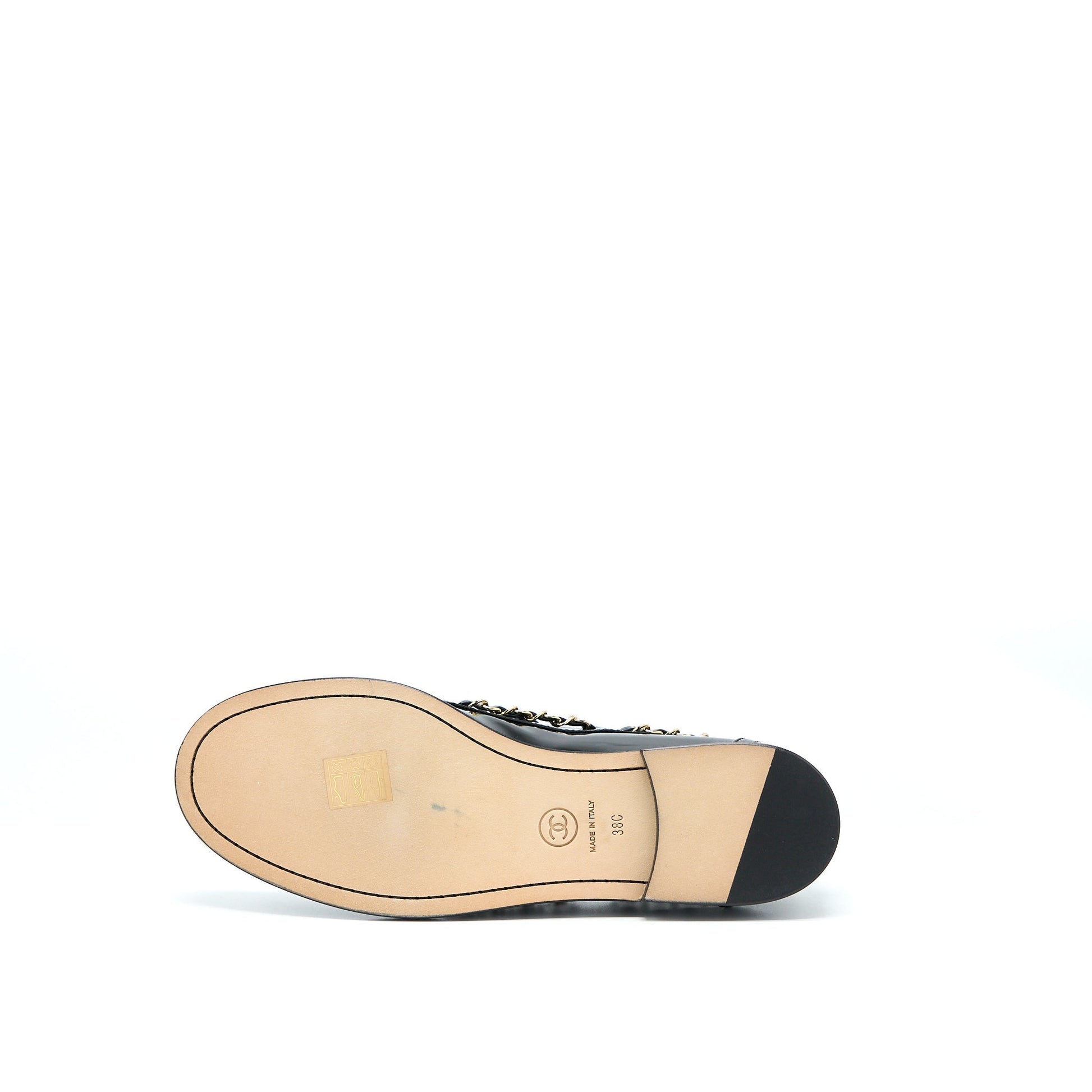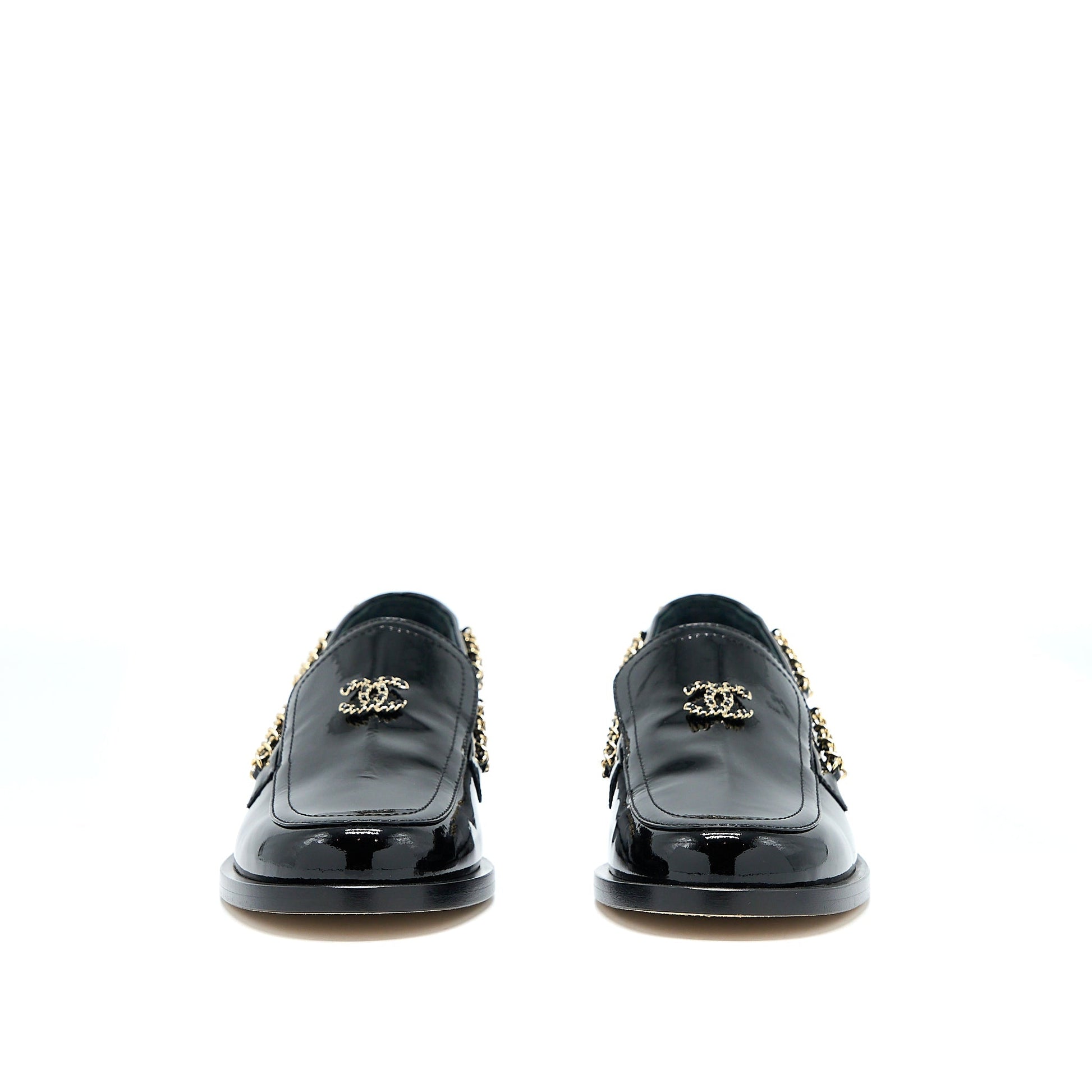 Chanel Size 38 CC Logo Flats Chain Loafers Patent Black