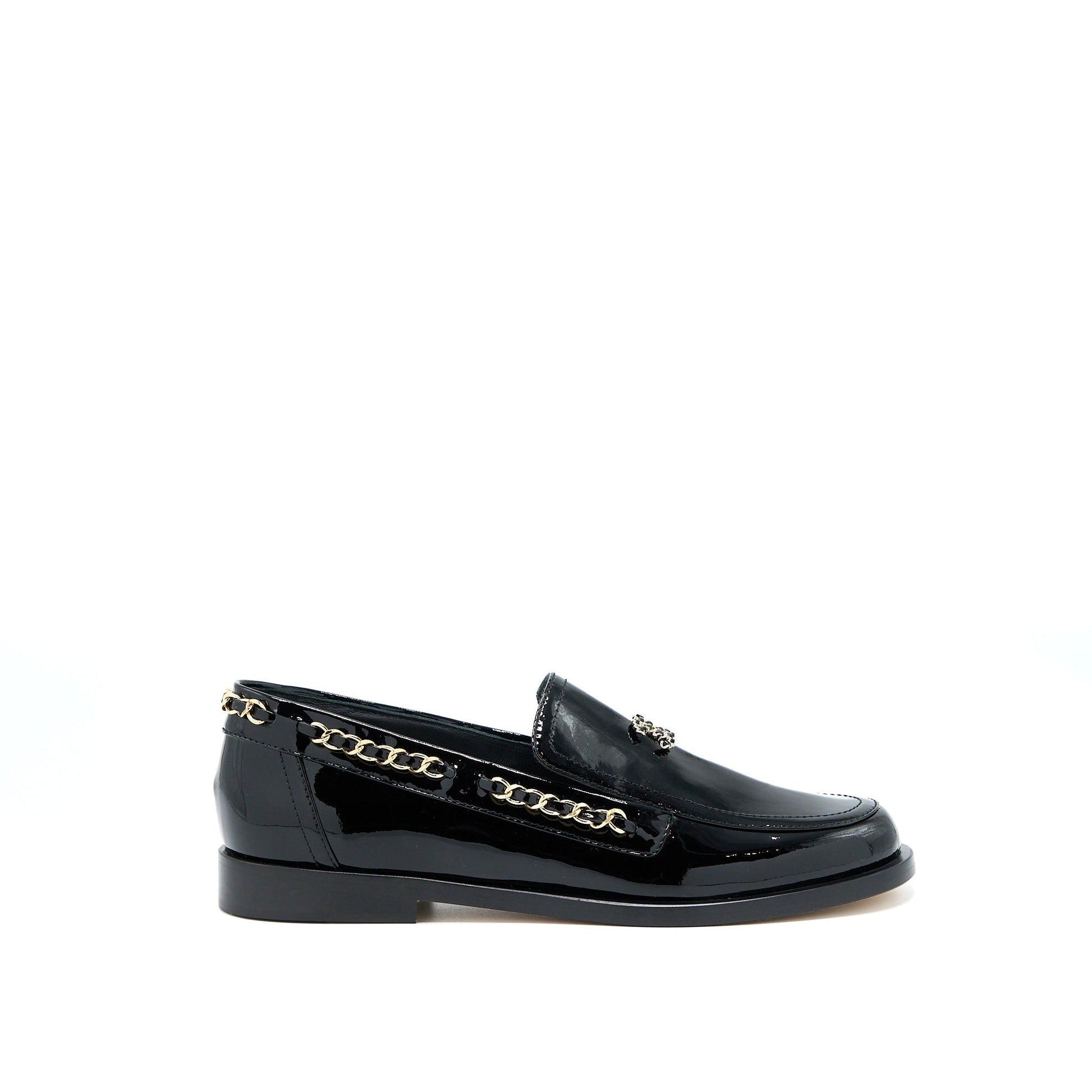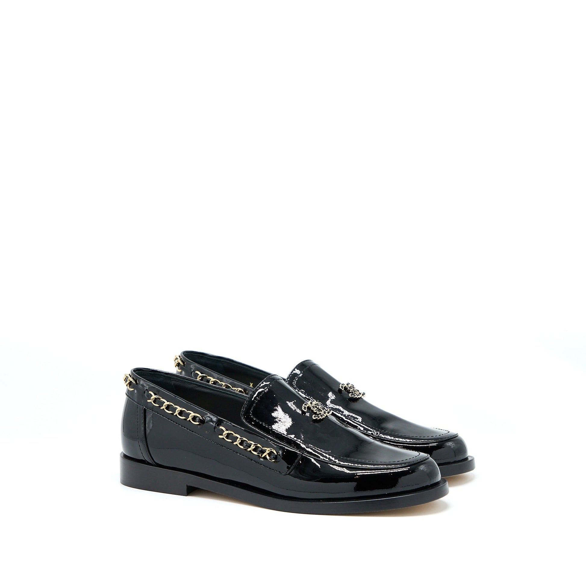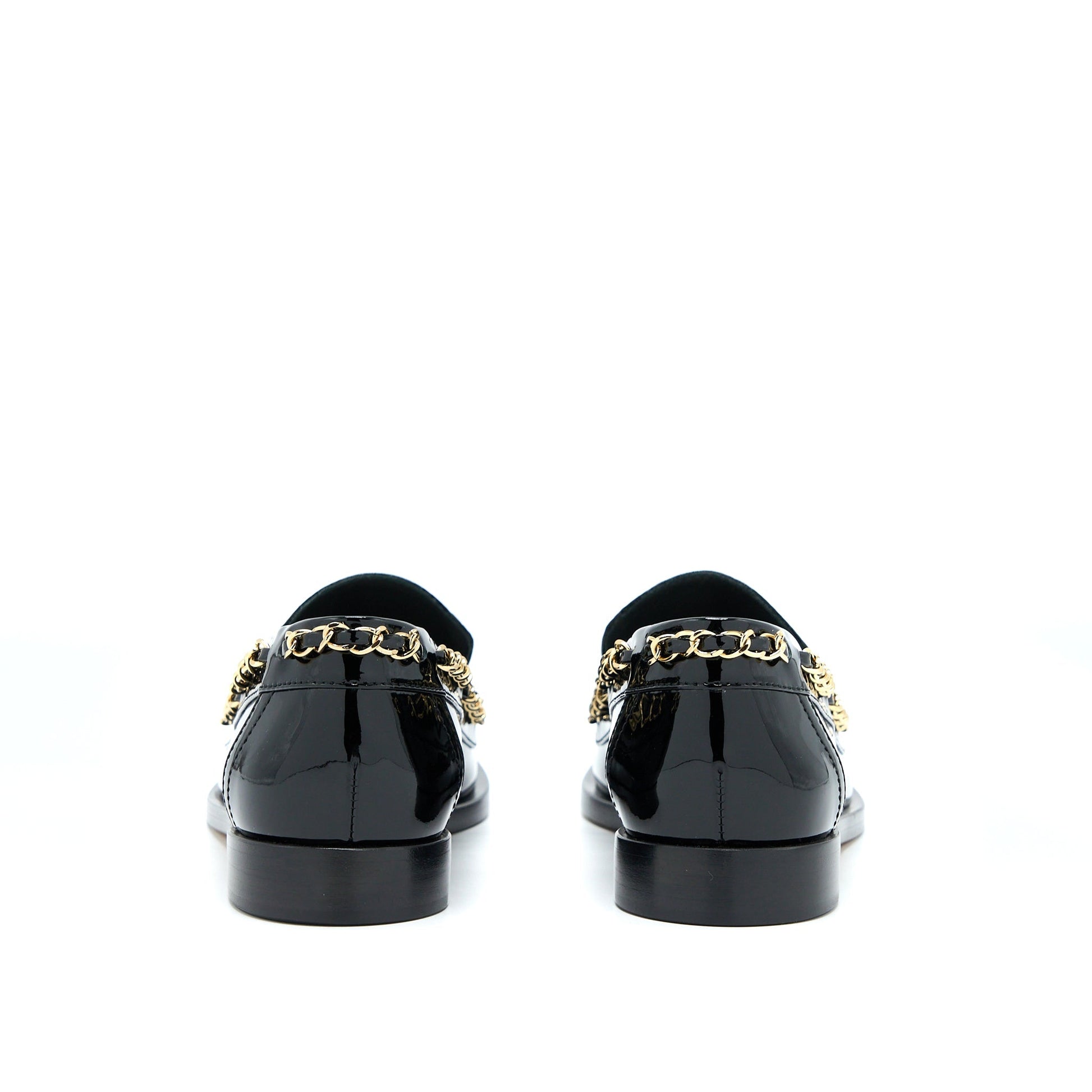 Chanel Size 38 CC Logo Flats Chain Loafers Patent Black