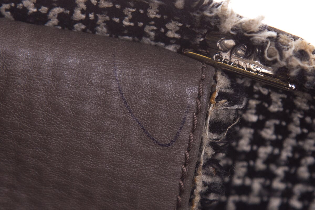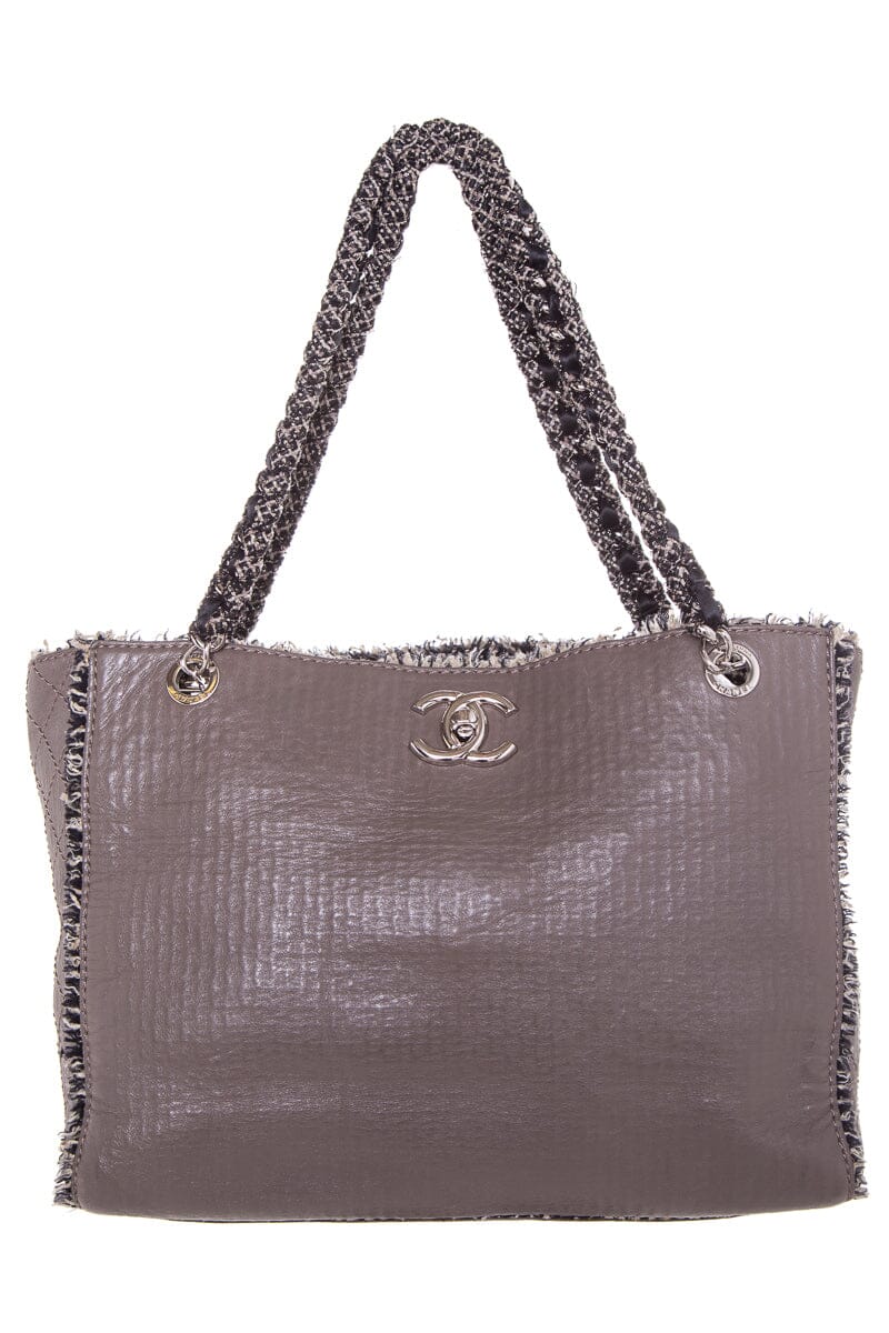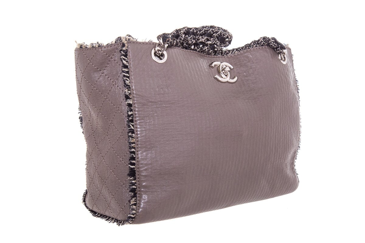 Chanel Slate Gray '09 Tweedy Lambskin and Tweed Tote Handbag Double Tweed and Ribbon Interwoven Chain Interior Tweed Lining. This item is in New condition; some fraying on handles and lining as well some discoloring/marks on leather