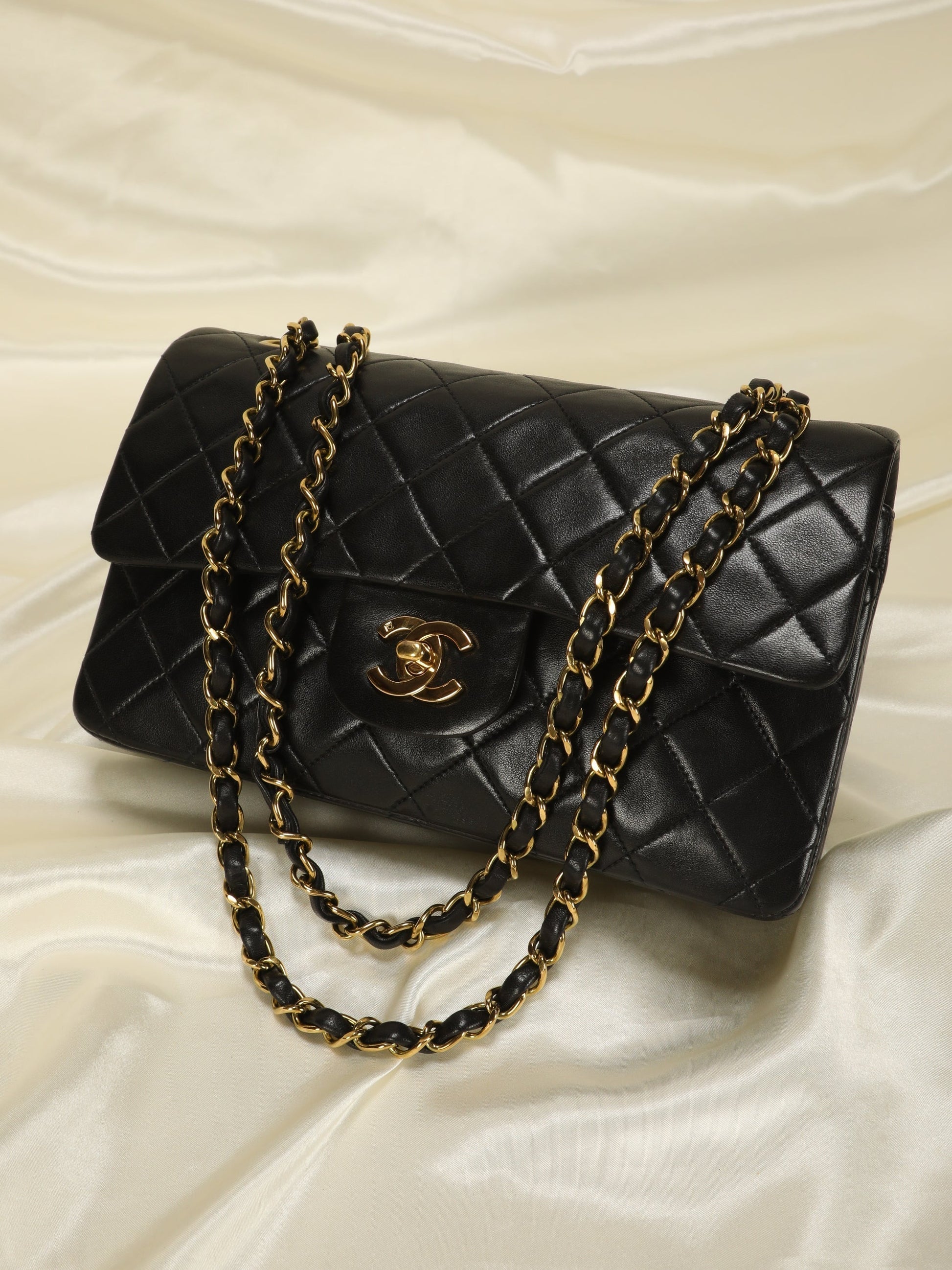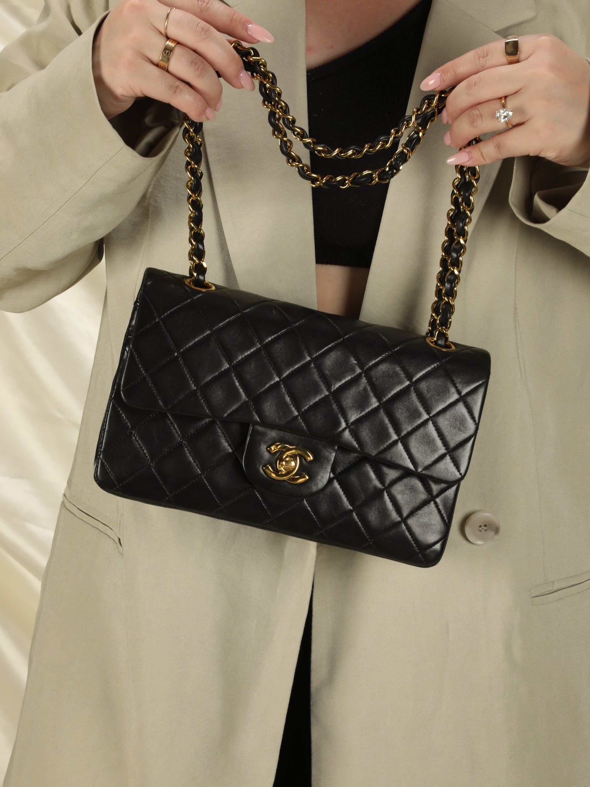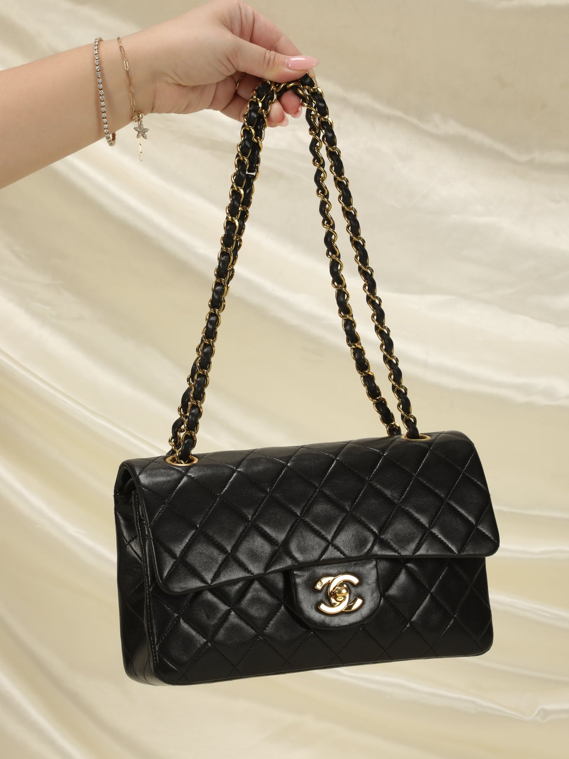 Bringing to the shop a stunning, soft classic Lambskin Chanel flap. New investment piece that?can be loved for years to come. Vintage Chanel crafted in the 90's= 24k hardware and soft buttery lambskin. Don't miss out on this gorgeous find. Can be as a long or short shoulder bag. Crafted between 1989-1991. Bag in this condition currently going between 6300-9000 online!