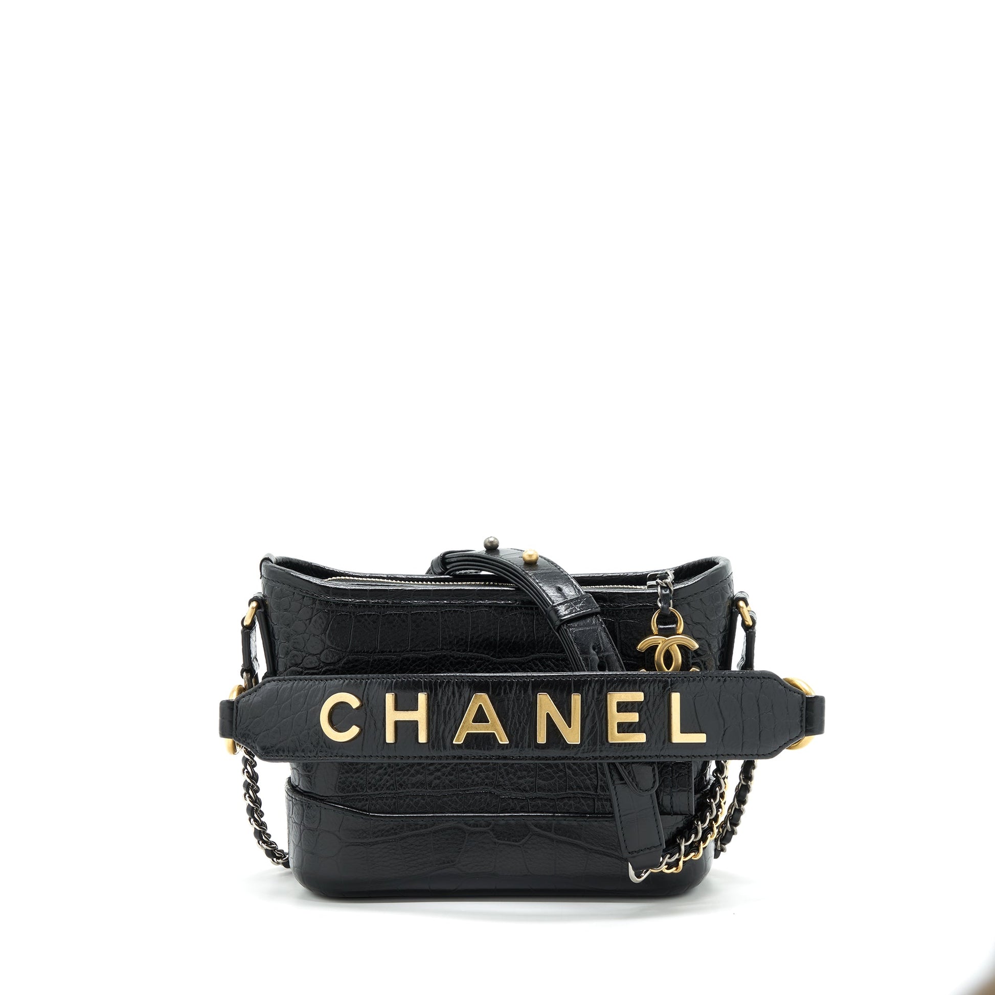 Chanel Small Gabrielle Hobo Bag With Handle Croc-Embossed Calfskin Black Gold/Silver Hardware