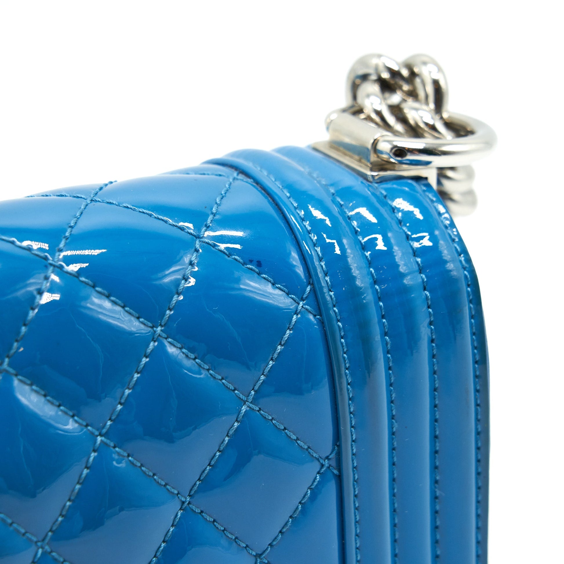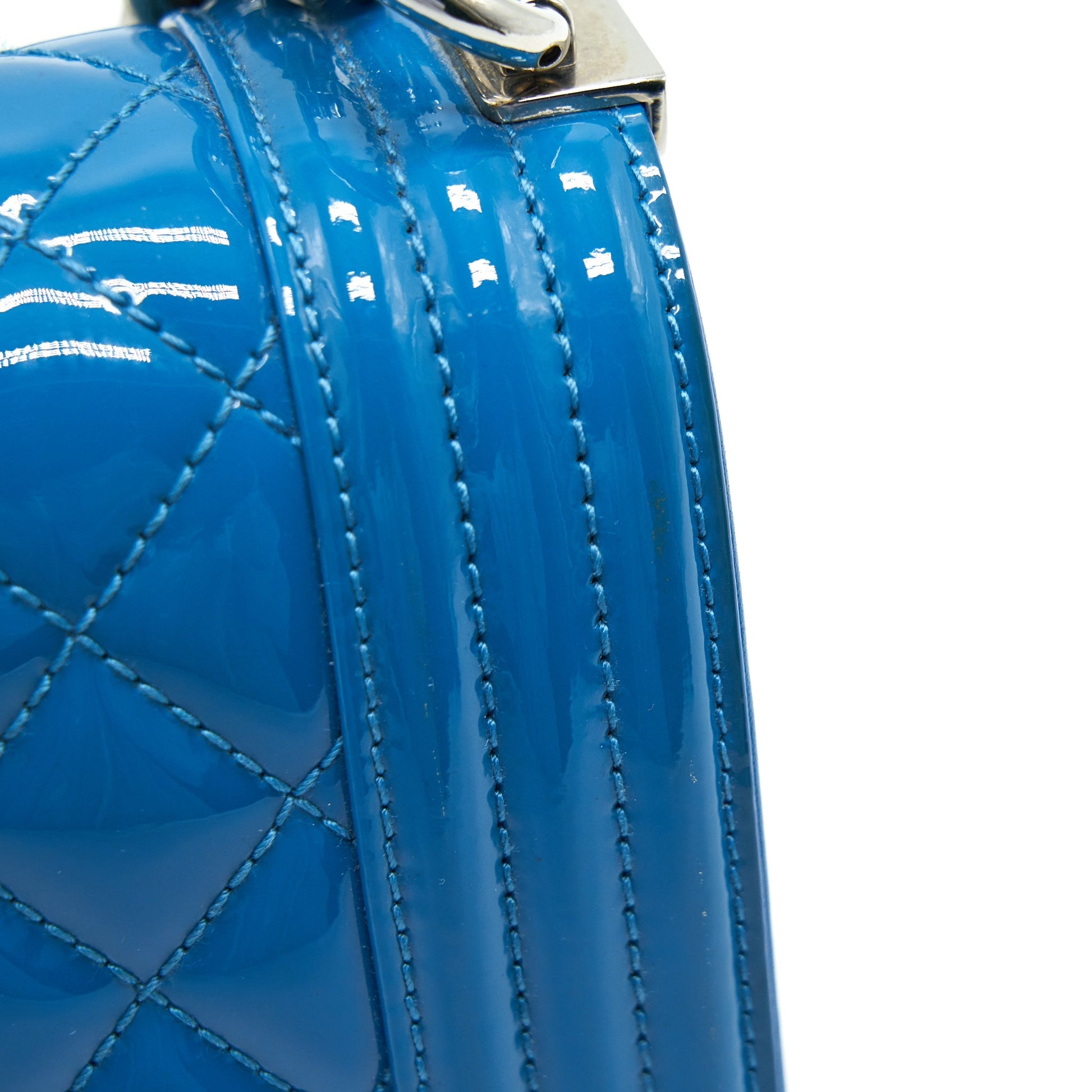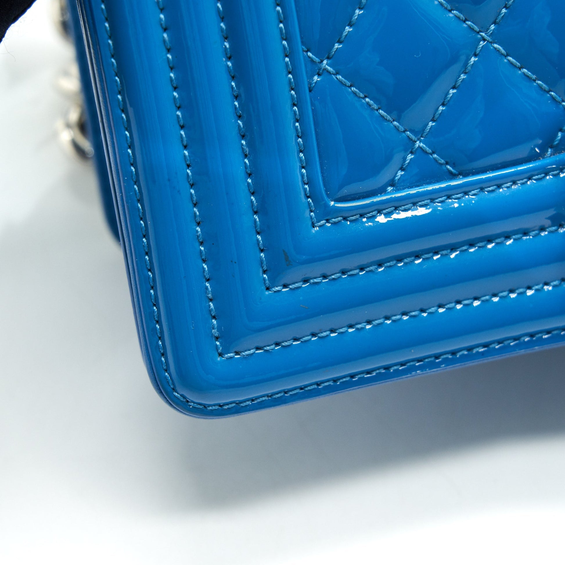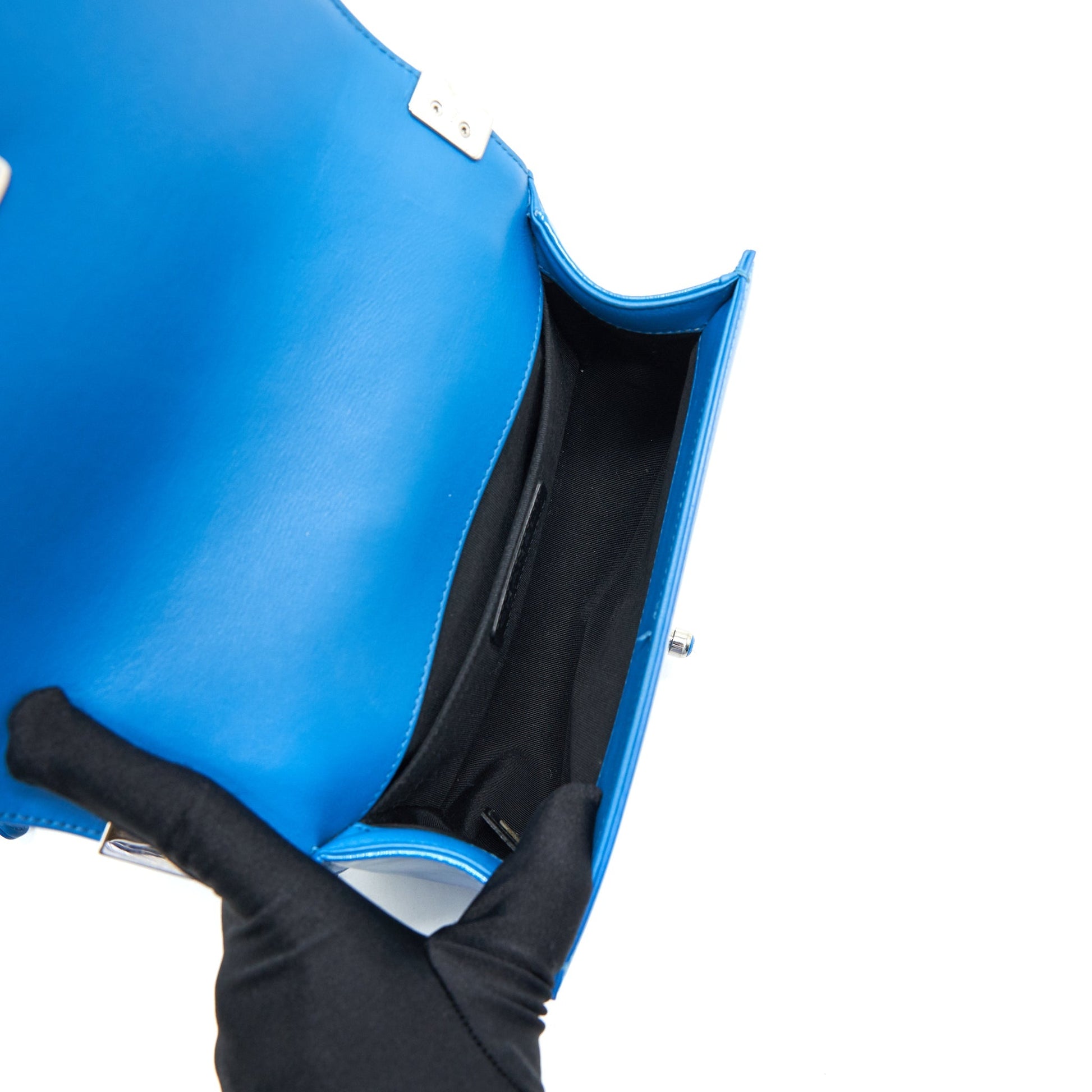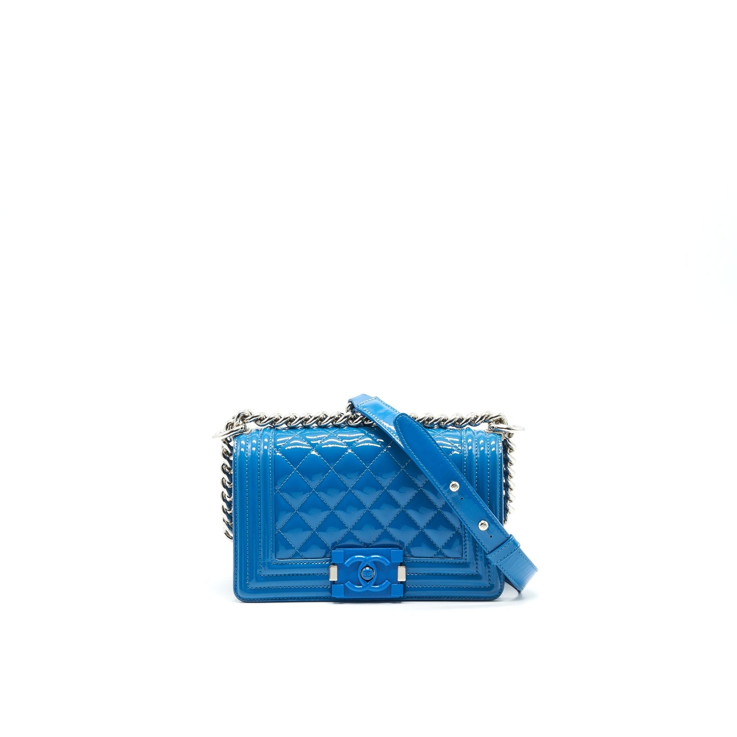 CHANEL SMALL LE BOY BAG IN PATENT LEATHER BLUE SHW