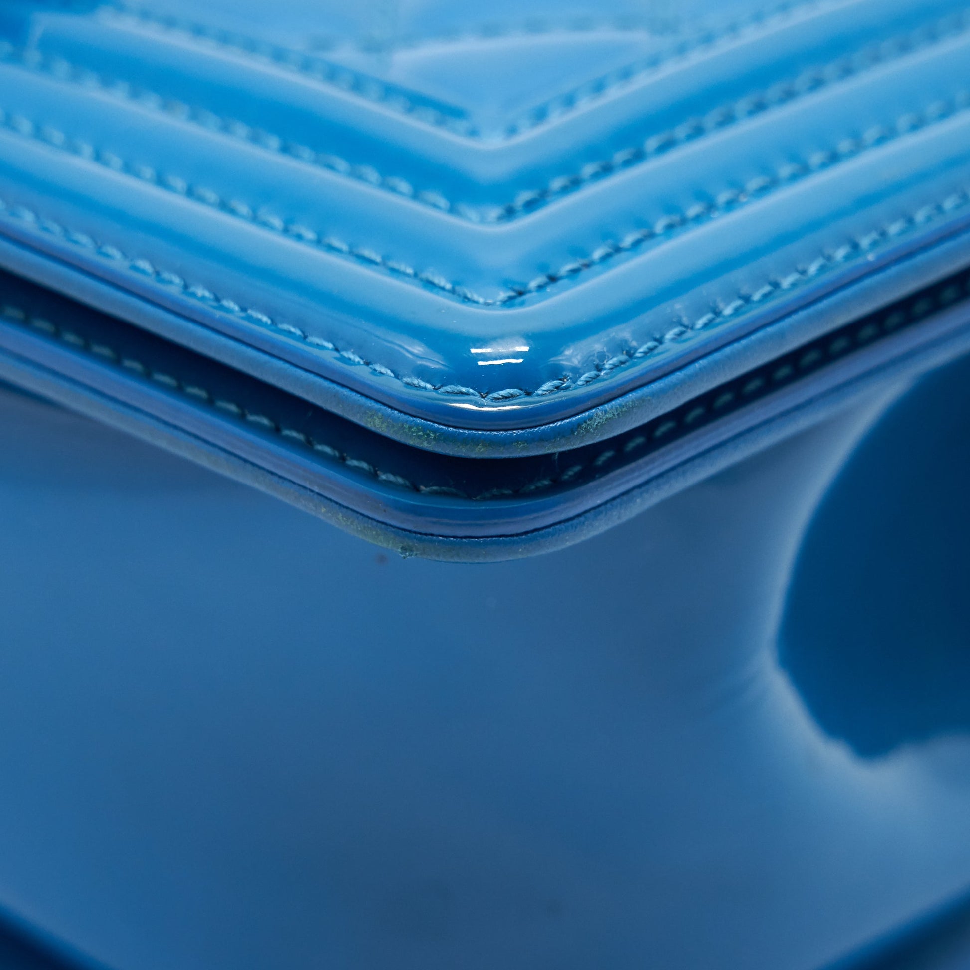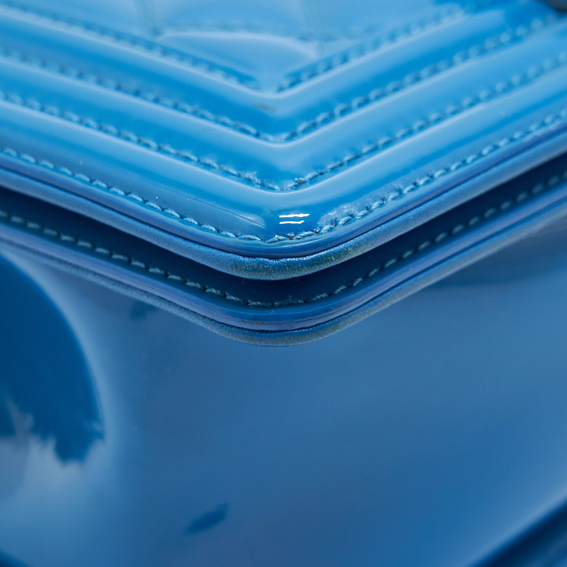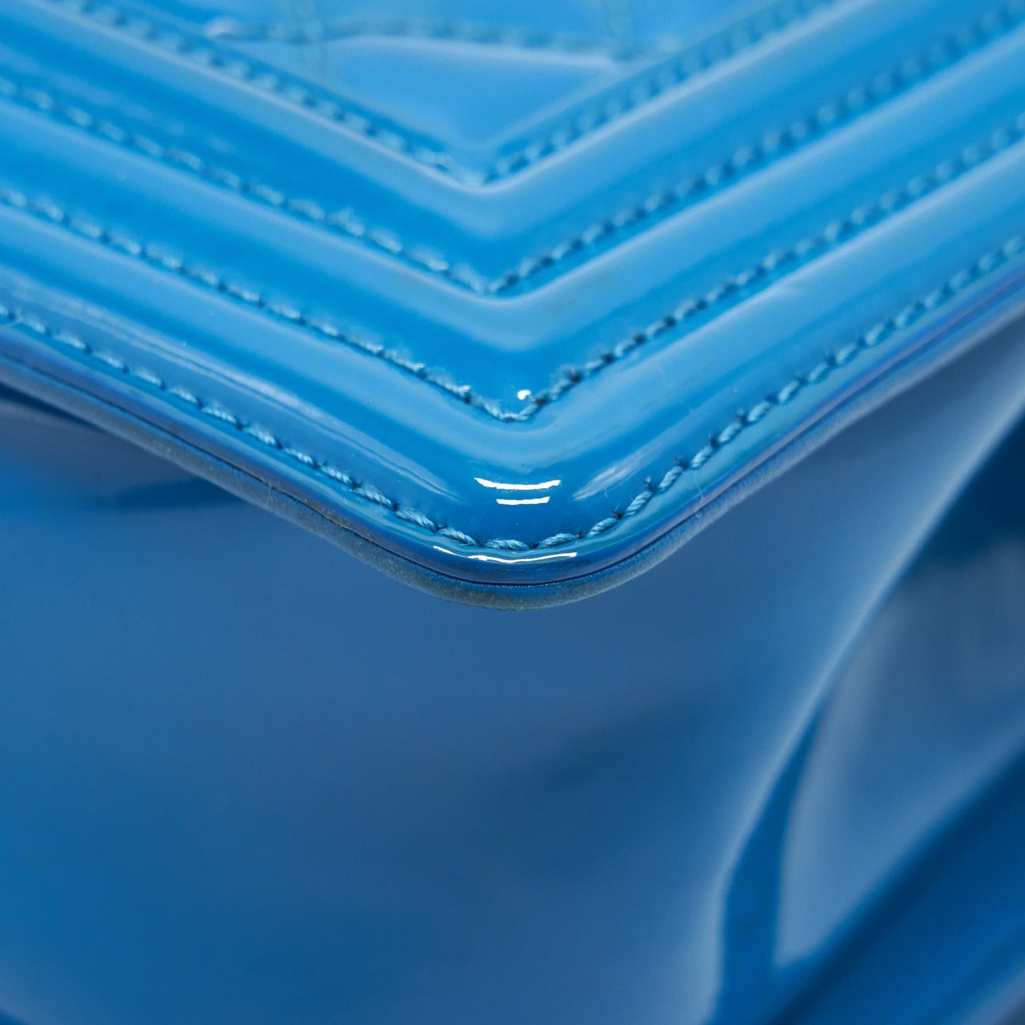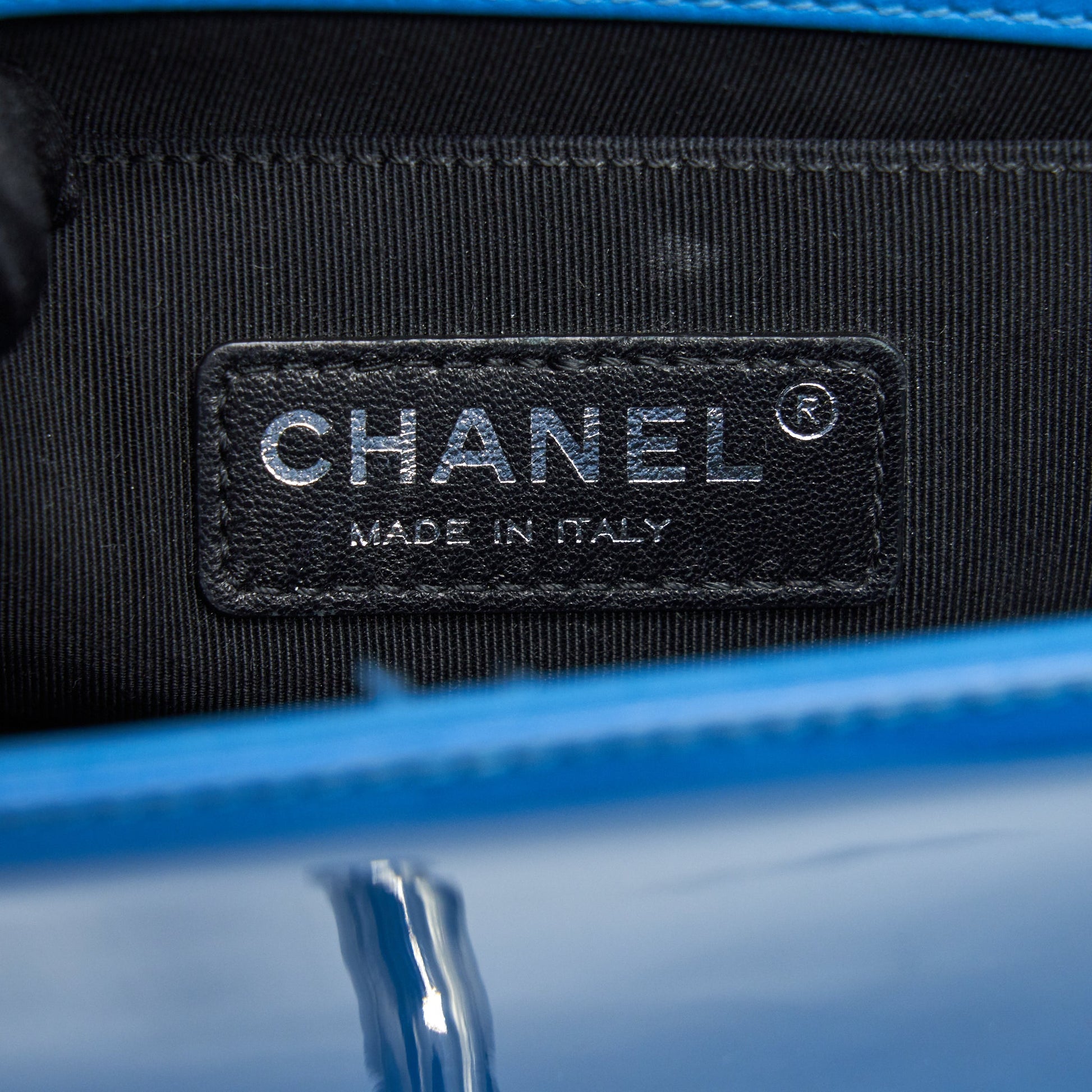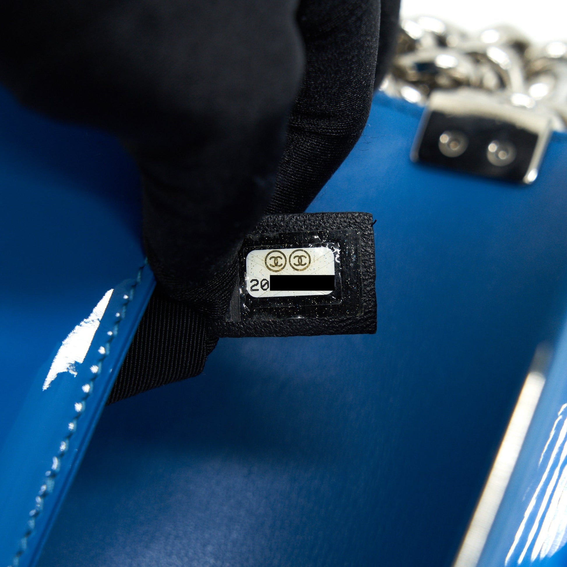 CHANEL SMALL LE BOY BAG IN PATENT LEATHER BLUE SHW
