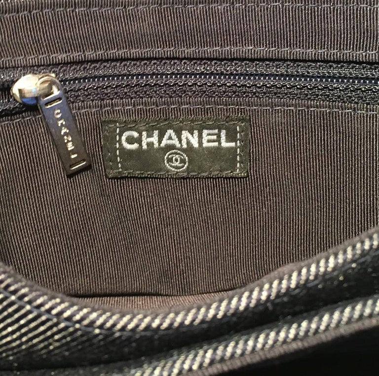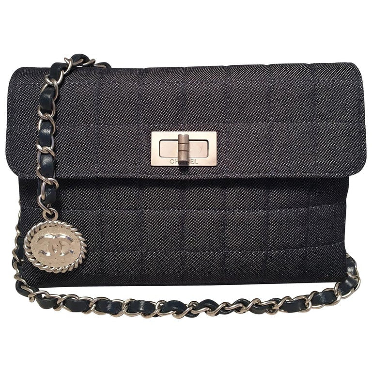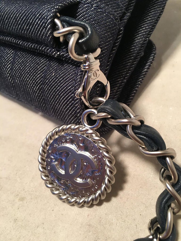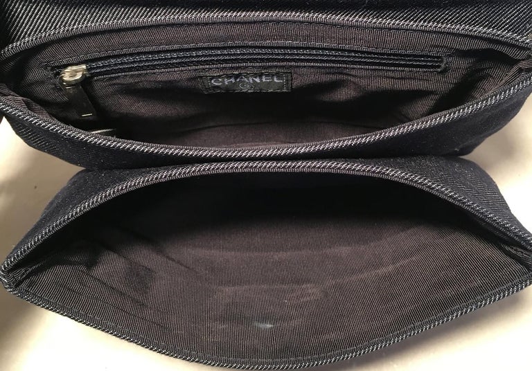 Chanel Square Quilted Denim Convertible Bum Bag Waist Pouch Clutch Shoulder Bag in excellent condition. Square quilted denim exterior trimmed with matte silver hardware. Woven chain and leather chain strap that can be worn around the waist, hips, and shoulder. It can also be removed completely to carry this piece as a clutch. Front mademoiselle twist closure opens to a navy nylon interior with 2 separate compartments and a zippered pocket in the back compartment. CC charm on the end of the chain and leather strap. No stains, smells or fabric pulls. Clean corners, edges and interior. OOAK piece perfect for fashion lovers and chanel collectors alike. Purchase includes a dust cover. Measurements: 8"x5"x2.5" 37" long belt/chain